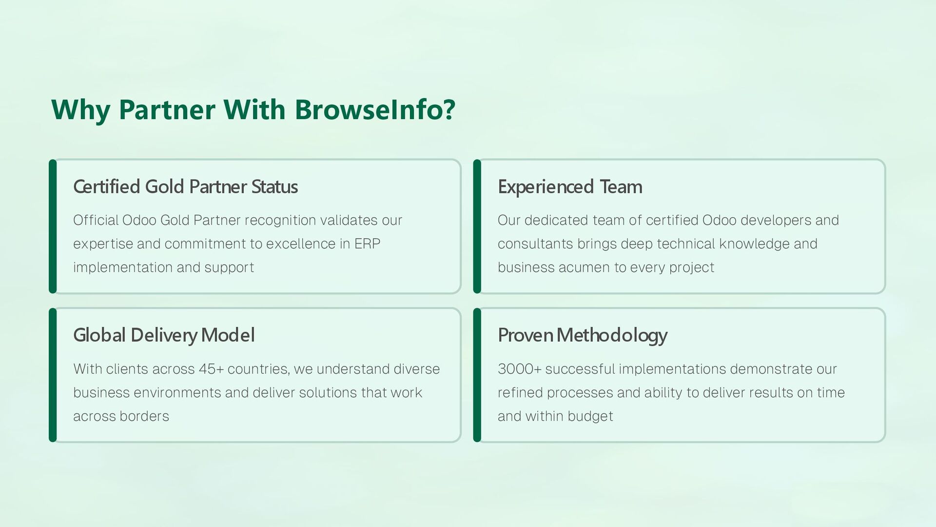 Its proven track record, industry-diverse portfolio, and client-first approach make it one of the most reliable Odoo partners in the global ERP ecosystem. Whether implementing new systems or optimizing existing ones, BrowseInfo’s combination of technology excellence and business insight ensures every ERP project delivers measurable value."