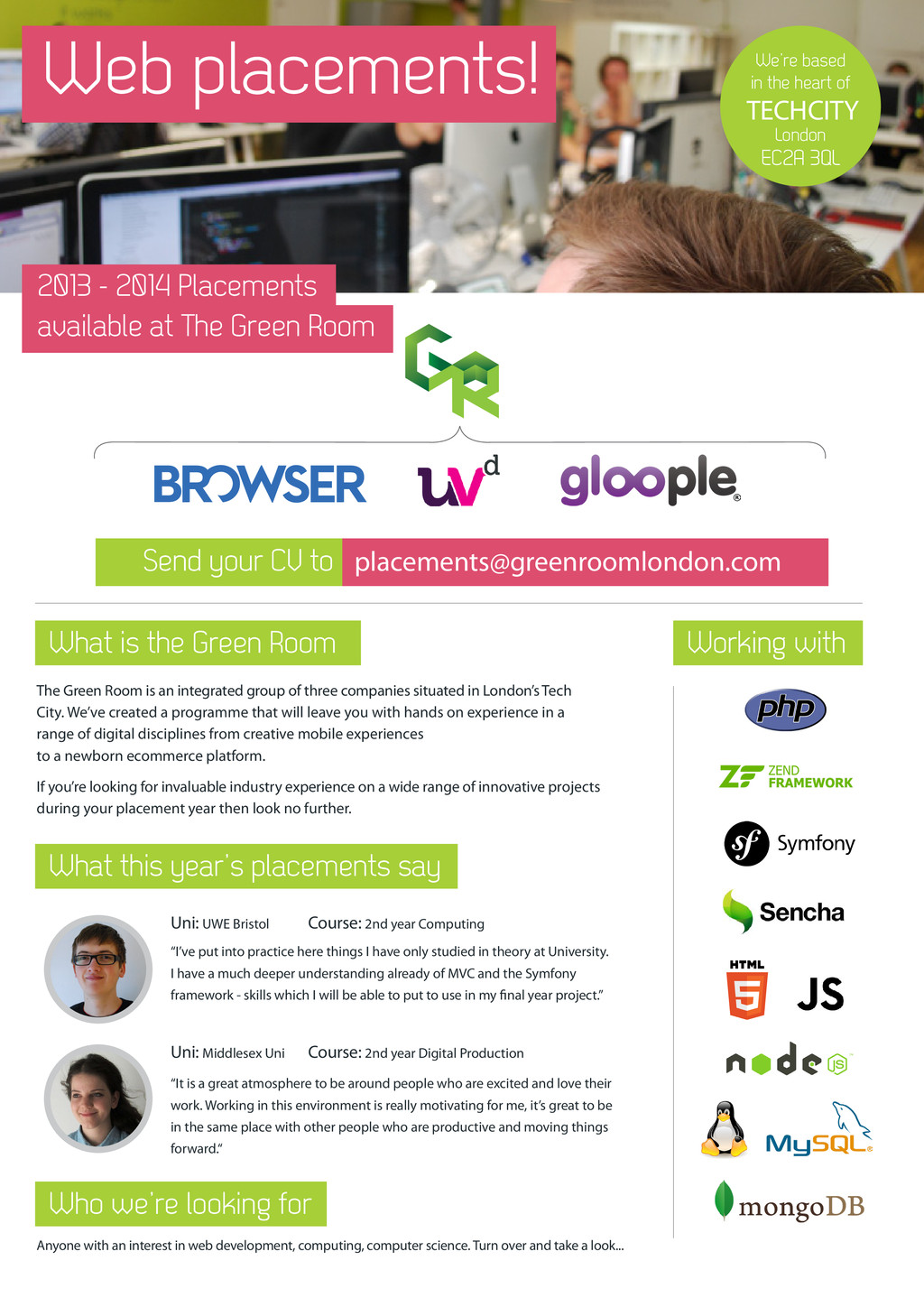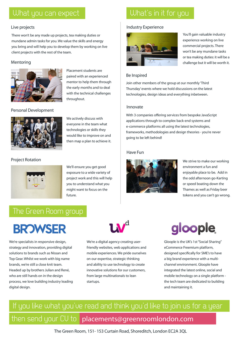 any made up projects, tea making duties or mundane admin tasks for you. We value the skills and energy you bring and will help you to develop them by working on live client projects with the rest of the team. Placement students are paired with an experienced mentor to help them through the early months and to deal with the technical challenges throughout. We actively discuss with everyone in the team what technologies or skills they would like to improve on and then map a plan to achieve it. We’ll ensure you get good exposure to a wide variety of project work and this will help you to understand what you might want to focus on the future. We’re a digital agency creating user- friendly websites, web applications and mobile experiences. We pride ourselves on our expertise, strategic thinking and ability to use technology to create innovative solutions for our customers, from large multinationals to lean startups. We’re specialists in responsive design, strategy and innovation, providing digital solutions to brands such as Nissan and Top Gear. Whilst we work with big name brands, we’re still a close knit team. Headed up by brothers Julian and René, who are still hands on in the design process, we love building industry leading digital design. Gloople is the UK’s 1st “Social Sharing” eCommerce Freemium platform, designed specifically for SME’s to have a big brand experience with a multi- channel environment. Gloople have integrated the latest online, social and mobile technology on a single platform - the tech team are dedicated to building and maintaining it. Industry Experience Be Inspired Innovate Have Fun You’ll gain valuable industry experience working on live commercial projects. There won’t be any mundane tasks or tea making duties: it will be a challenge but it will be worth it. We strive to make our working environment a fun and enjoyable place to be. Add in the odd afternoon go-Karting or speed boating down the Thames as well as Friday beer tokens and you can’t go wrong. The Green Room, 151- 153 Curtain Road, Shoreditch, London EC2A 3QL What you can expect What’s in it for you Join other members of the group at our monthly ‘Third Thursday’ events where we hold discussions on the latest technologies, design ideas and everything inbetween. With 3 companies offering services from bespoke JavaScript applications through to complex back-end systems and e-commerce platforms all using the latest technologies, frameworks, methodologies and design theories - you’re never going to be left behind! The Green Room group If you like what you’ve read and think you’d like to join us for a year then send your CV to