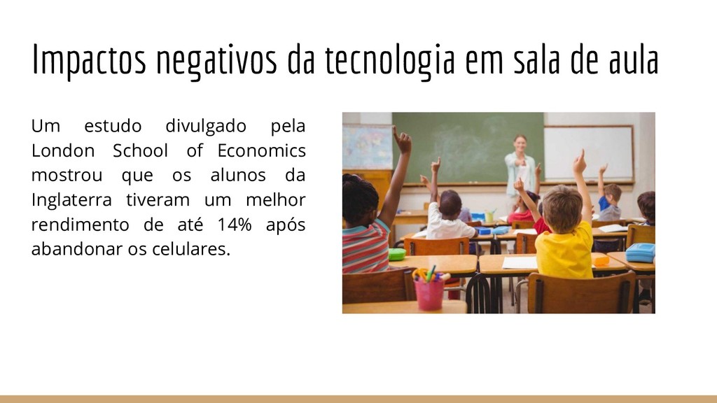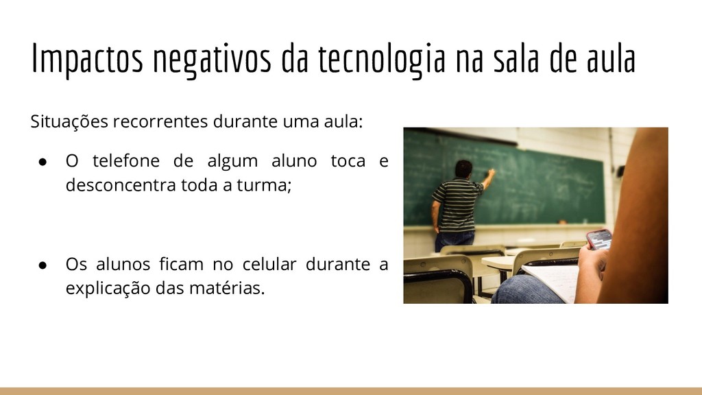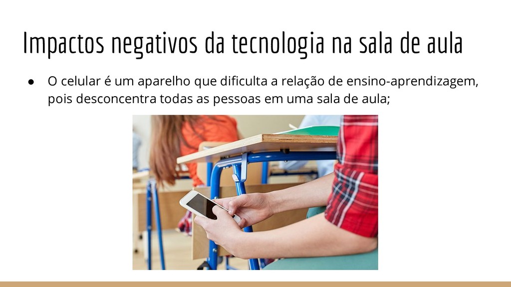 faz com que o aluno se distraia; • Faz com que o aluno obtenha notas mais baixas; • crianças e adolescente não tem maturidade para utilizar somente em momentos apropriados.