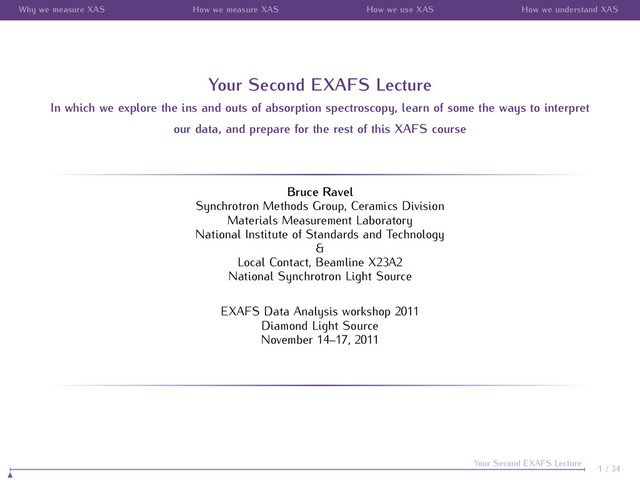 use XAS How we understand XAS Your Second EXAFS Lecture In which we explore the ins and outs of absorption spectroscopy, learn of some the ways to interpret our data, and prepare for the rest of this XAFS course Bruce Ravel Synchrotron Methods Group, Ceramics Division Materials Measurement Laboratory National Institute of Standards and Technology & Local Contact, Beamline X23A2 National Synchrotron Light Source EXAFS Data Analysis workshop 2011 Diamond Light Source November 14–17, 2011 1 / 34 Your Second EXAFS Lecture