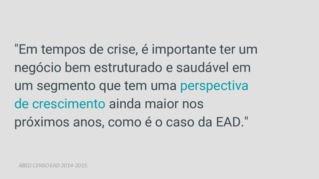 estruturado e saudável em um segmento que tem uma perspectiva de crescimento ainda maior nos próximos anos, como é o caso da EAD." ABED CENSO EAD 2014-2015.