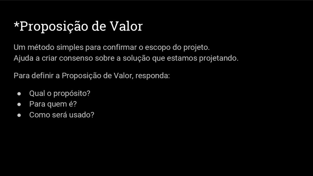 do projeto. Ajuda a criar consenso sobre a solução que estamos projetando. Para definir a Proposição de Valor, responda: • Qual o propósito? • Para quem é? • Como será usado?