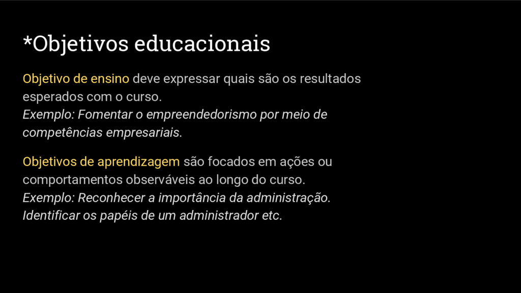 resultados esperados com o curso. Exemplo: Fomentar o empreendedorismo por meio de competências empresariais. Objetivos de aprendizagem são focados em ações ou comportamentos observáveis ao longo do curso. Exemplo: Reconhecer a importância da administração. Identificar os papéis de um administrador etc.