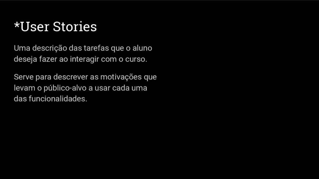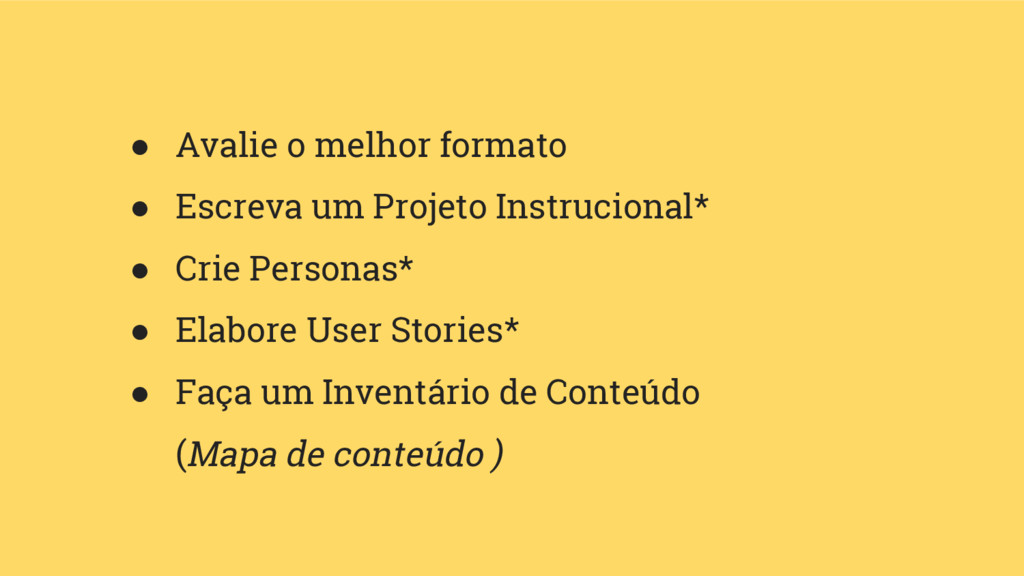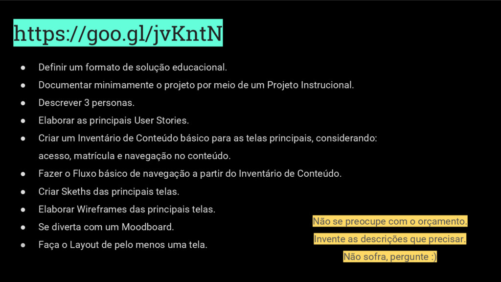 minimamente o projeto por meio de um Projeto Instrucional. • Descrever 3 personas. • Elaborar as principais User Stories. • Criar um Inventário de Conteúdo básico para as telas principais, considerando: acesso, matrícula e navegação no conteúdo. • Fazer o Fluxo básico de navegação a partir do Inventário de Conteúdo. • Criar Skeths das principais telas. • Elaborar Wireframes das principais telas. • Se diverta com um Moodboard. • Faça o Layout de pelo menos uma tela. Não se preocupe com o orçamento. Invente as descrições que precisar. Não sofra, pergunte :)