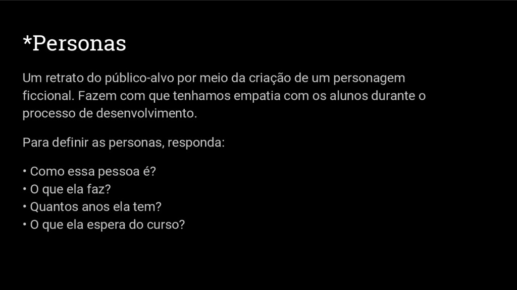 um personagem ficcional. Fazem com que tenhamos empatia com os alunos durante o processo de desenvolvimento. Para definir as personas, responda: • Como essa pessoa é? • O que ela faz? • Quantos anos ela tem? • O que ela espera do curso?