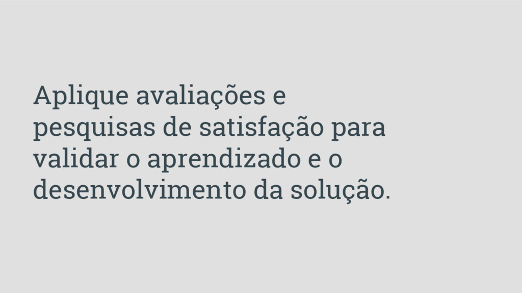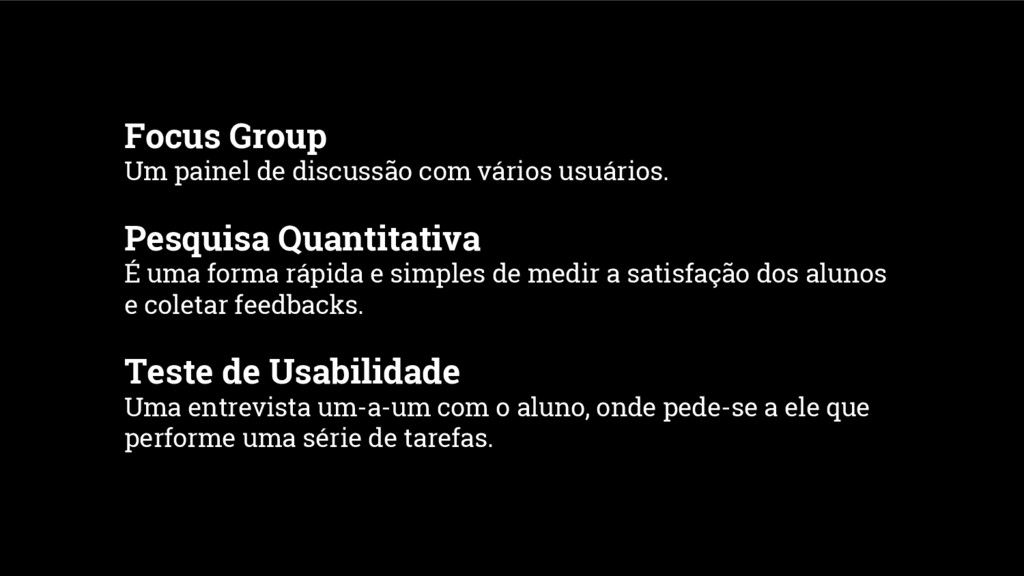Quantitativa É uma forma rápida e simples de medir a satisfação dos alunos e coletar feedbacks. Teste de Usabilidade Uma entrevista um-a-um com o aluno, onde pede-se a ele que performe uma série de tarefas.