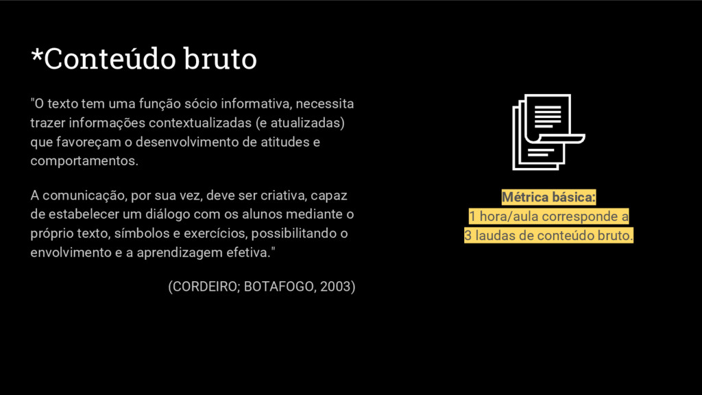 trazer informações contextualizadas (e atualizadas) que favoreçam o desenvolvimento de atitudes e comportamentos. A comunicação, por sua vez, deve ser criativa, capaz de estabelecer um diálogo com os alunos mediante o próprio texto, símbolos e exercícios, possibilitando o envolvimento e a aprendizagem efetiva." (CORDEIRO; BOTAFOGO, 2003) Métrica básica: 1 hora/aula corresponde a 3 laudas de conteúdo bruto.