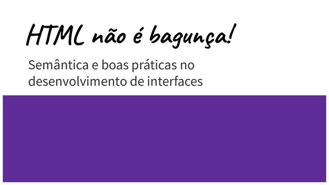 • Compreender o HTML não é dominá-lo completamente! • Semântica estrutural (<header>, <nav>, <main>, <article>, <footer>, <aside>, etc.) • Semântica textual (<a>, <em>, <strong>, <cite>, <q>, <time>, <mark>, etc.) • Aprimore seu código e troque uma ideia com a comunidade
