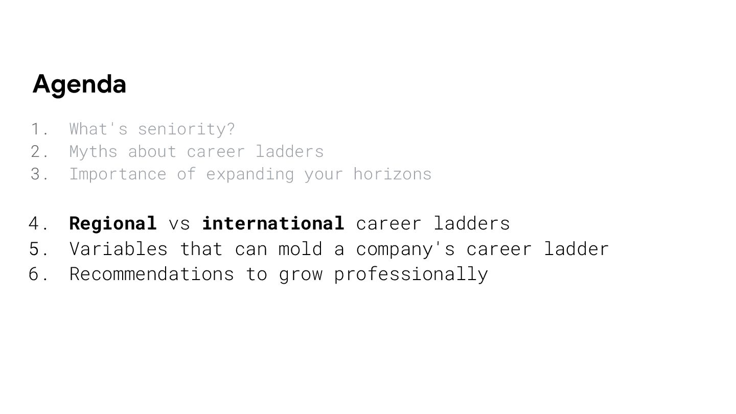 This talk will debunk those myths by providing a broader context for your career plan. We will contrast the common career ladders found regionally in Latin America with the structures at large international companies.