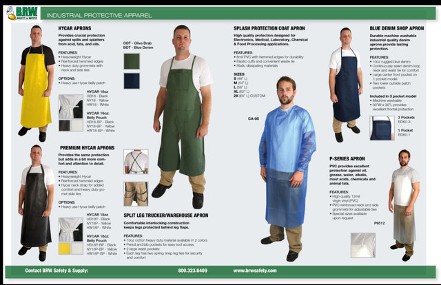 APRONS Provides crucial protection against spills and splatters from acid, fats, and oils. FEATURES: • Heavyweight Hycar • Reinforced hemmed edges • Heavy duty grommets with neck and side ties OPTIONS: • Heavy use Hycar belly patch Provides the same protection but adds in a bit more com- fort and attention to detail. FEATURES: • Heavyweight Hycar • Reinforced hemmed edges • Hycar neck strap for added comfort and heavy duty gro- met side ties OPTIONS: • Heavy use Hycar belly patch HYCAR 18oz HB18 - Black NY18 - Yellow HW18 - White HYCAR 18oz: Belly Pouch HB18-BP - Black NY18-BP - Yellow HW18-BP - White HYCAR 18oz HB18P - Black NY18P - Yellow HW18P - White HYCAR 18oz: Belly Pouch HB18P-BP - Black NY18P-BP - Yellow HW18P-BP - White PVC provides excellent protection against oil, grease, water, alkalis, most acids, chemicals and animal fats. FEATURES: • High quality 12mil virgin vinyl (PVC) • PVC reinforced neck and side grommets for adjustable ties • Special sizes available upon request SPLIT LEG TRUCKER/WAREHOUSE APRON Comfortable interlocking construction keeps legs protected behind leg flaps. FEATURES: • 10oz cotton heavy duty material available in 2 colors • Pencil and bib pockets for easy tool access • 2 large waist pockets • Each leg has two spring snap leg ties for security and comfort High quality protection designed for Electronics, Medical, Laboratory, Chemical & Food Processing applications. FEATURES: • 8mil PVC with hemmed edges for durability • Elastic cuffs and convenient waste tie • Static dissipating materials SIZES: S (48” L) M (54” L) L (56” L) XL (62” L) 2X (65” L) CUSTOM BLUE DENIM SHOP APRON Durable machine washable industrial quality denim aprons provide lasting protection. FEATURES: • 10oz rugged blue denim • Continuously sewn denim loop neck and waist tie for comfort • Large center front pocket on 1 pocket model • Two lower outside patch pockets Included in 3 pocket model • Machine washable • 30”W x 36”L provides excellent frontal protection 3 Pockets BD60-3 1 Pocket BD60-1 CA-08 P6512 ODT - Olive Drab BDT - Blue Denim Contact BRW Safety & Supply: 800.323.6409 www.brwsafety.com INDUSTRIAL PROTECTIVE APPAREL
