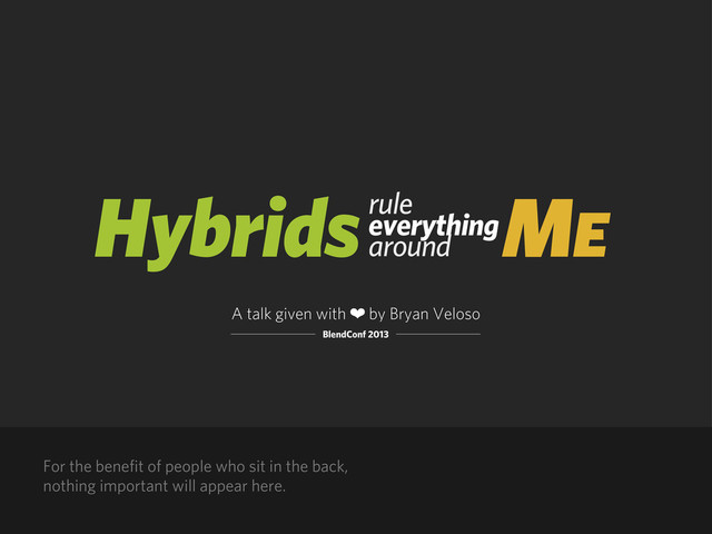 Gather by the campfire and listen to the tale of one self-taught hybrid. After years of refusing to cross the asile, learn about what it took for him to do so. Hopefully you'll be able to find your own inner hybrid and trek your own journey forward effectively using the ecosystem this community has built.