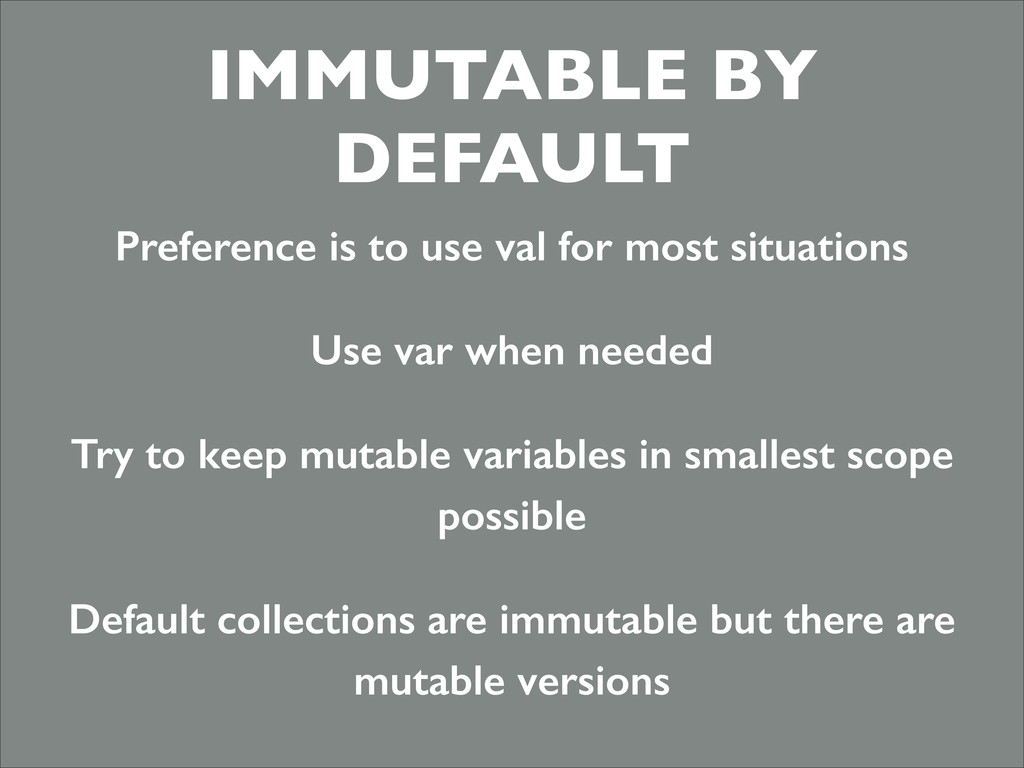 situations Use var when needed Try to keep mutable variables in smallest scope possible Default collections are immutable but there are mutable versions