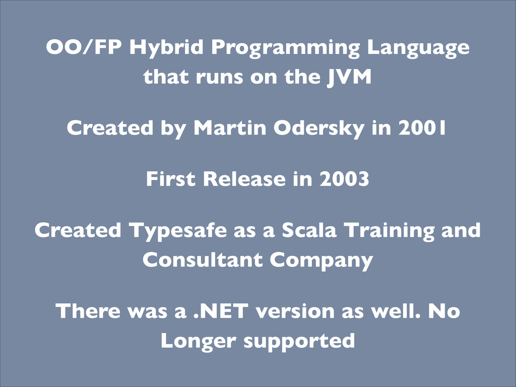 by Martin Odersky in 2001 First Release in 2003 Created Typesafe as a Scala Training and Consultant Company There was a .NET version as well. No Longer supported
