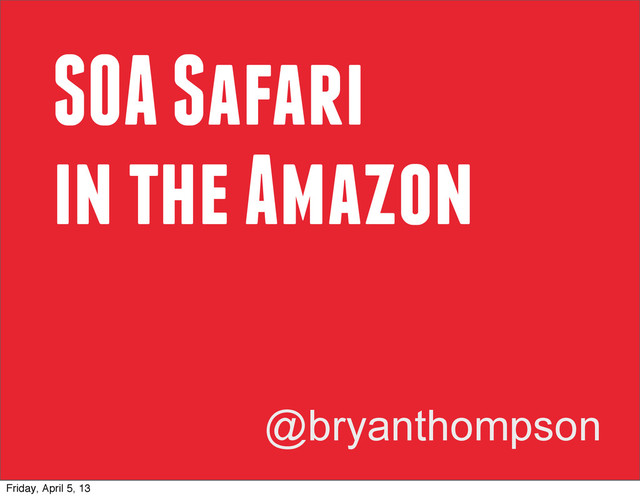 scalable, regionally fault tolerant, fast, and PCI level 1 compliant Reasons for SOA: Rewrite any service in any language at any time Scale any service independently PCI Requirement 2.2.1: Implement only one primary function per server our situation... Friday, April 5, 13