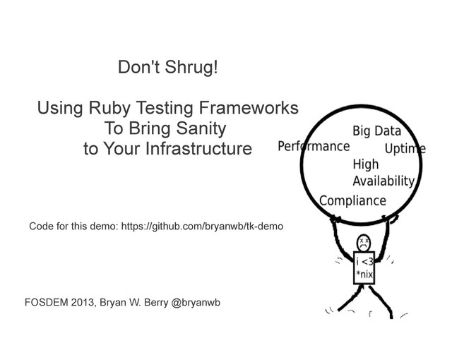 now with vagrant + rake • Concurrent VM task execution important • Need DSL for integration tests • Test-Kitchen is still alpha but very exciting • There is gold in Chef-Workflow • We need Public CI for chef cookbooks, puppet modules, and cfengine bundles