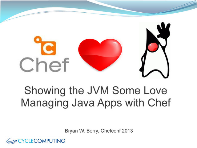 related cookbook • Oracle JDK 7 • Tomcat as the container • Tweak some kernel settings • Fetch dependencies with Maven • Monitor it with JMX Let's call it jvm-love in honor of Ulf