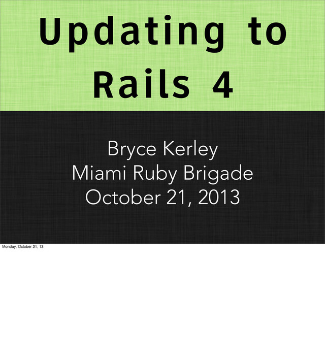 # to ask for it in # config/initializers/secret_token.rb # If you leave secret_token existing sessions # will be upgraded in place MyApp::Application.config.secret_token = 'p09m345n' +MyApp::Application.config.secret_key_base = ‘atelkjetq’ Monday, October 21, 13 Rails 3 signed but didn’t encrypt session cookies. Rails 4 encrypts then signs, which is more secure.