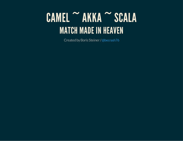 a . c a m e l . { C a m e l M e s s a g e , C o n s u m e r , P r o d u c e r , . . . } override endppint: d e f e n d p o i n t U r i = . . . Akka's CamelMessage immutable unlike Camel's Exchange transformation before send possible: Route building also possible o v e r r i d e d e f t r a n s f o r m O u t g o i n g M e s s a g e ( m s g : A n y ) = m s g m a t c h { c a s e m s g : C a m e l M e s s a g e ⇒ u p p e r C a s e ( m s g ) . . .