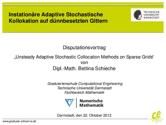 = ∇ · (α(x, ξ)∇v) =: A(ξ)v v(0) = v0 α(x, ξ) = E[α] + f(x)ξ ξ gleichverteilt auf [−a, a] E[v] = 1 2a a −a v(t, y) dy = 1 2a 0 −a v(t, y) dy + a 0 v(t, y) dy s = t ∓a y = 1 2t t 0 v(t, −as t ) + v(t, as t ) ds → Wie l¨ asst sich der Ausdruck interpretieren? Annahme: A(y) erzeugt C0-Halbgruppe {Sy (t)} f¨ ur alle y ∈ [−a, a] v(t, y) = Sy (t)v0 = exp(A(y)t)v0 Bettina Schieche | 22.10.12 | Exakte Bestimmung von Erwartungswerten | 22/26