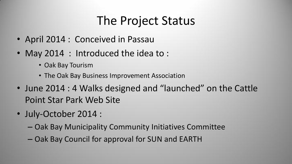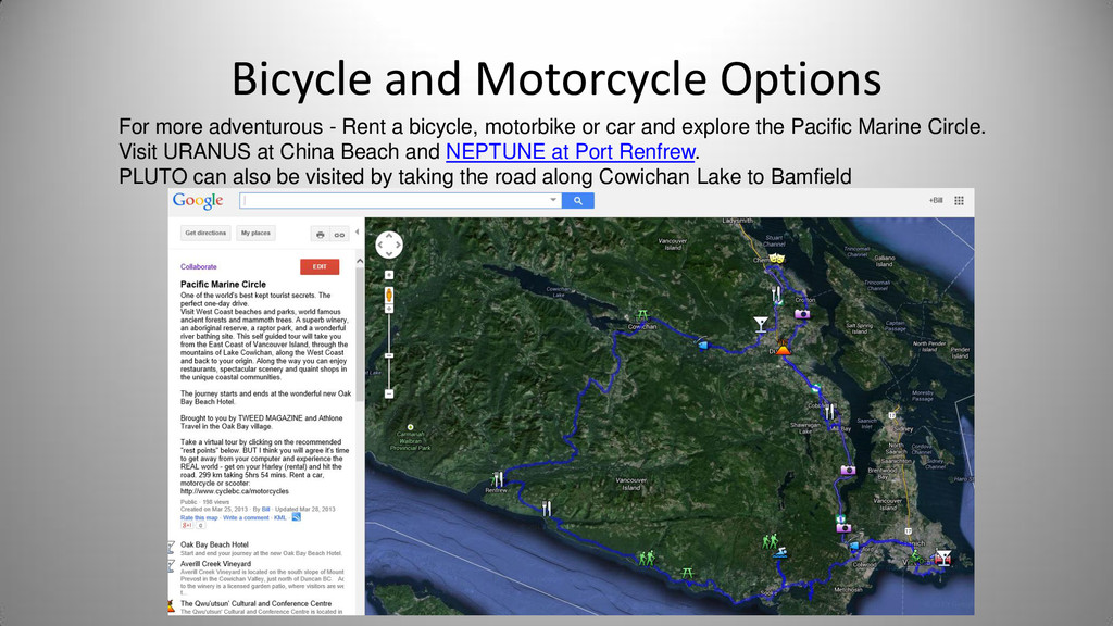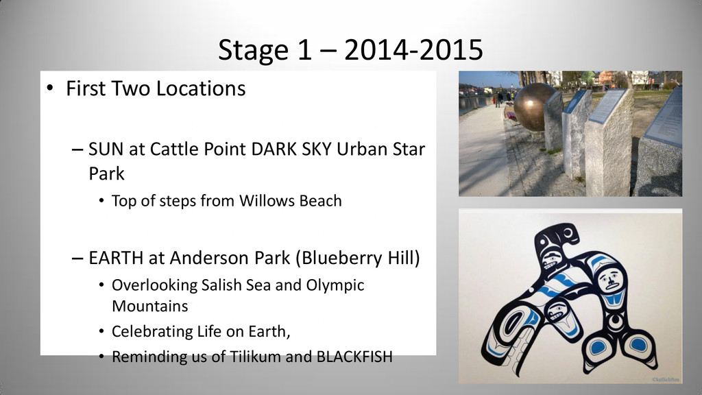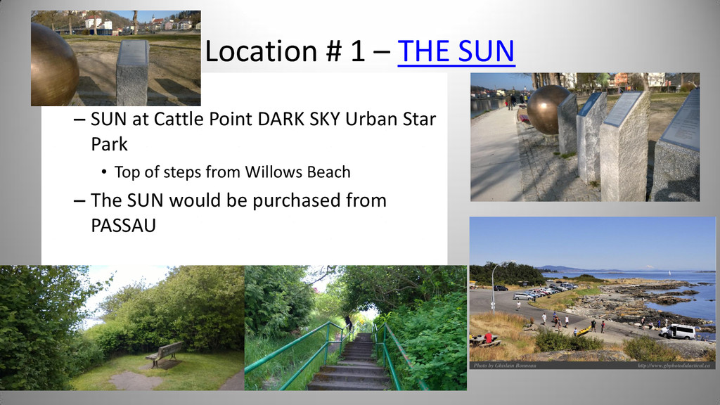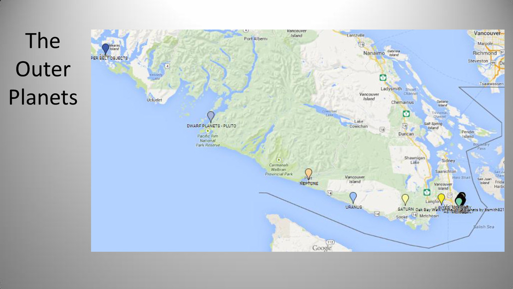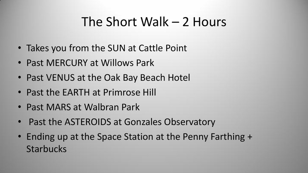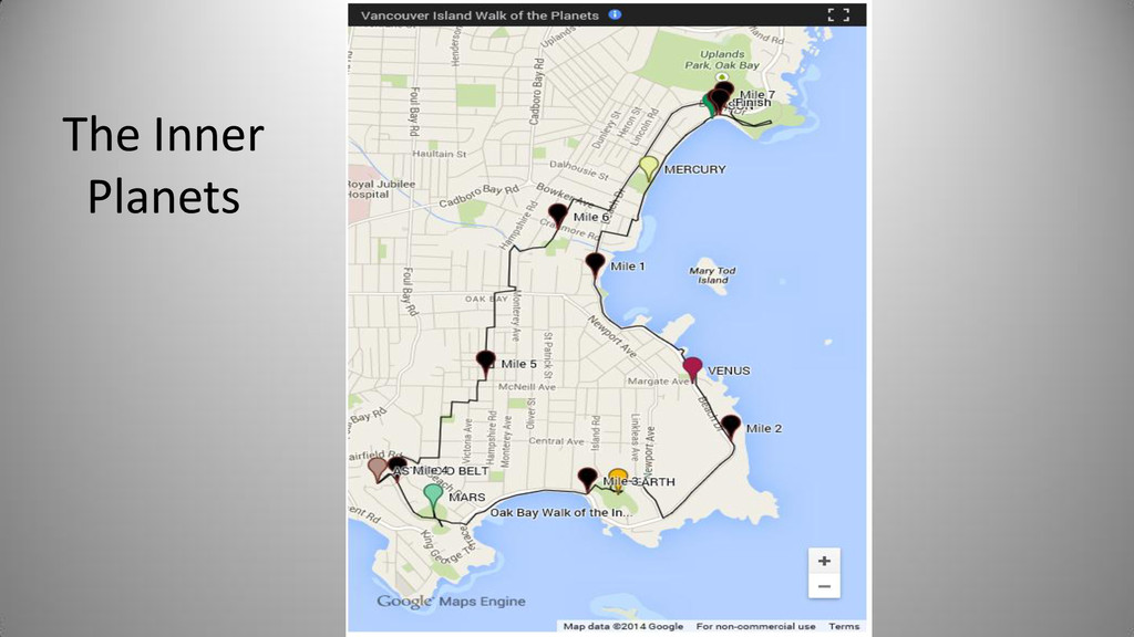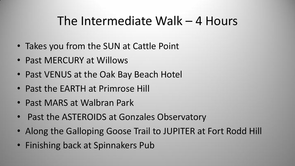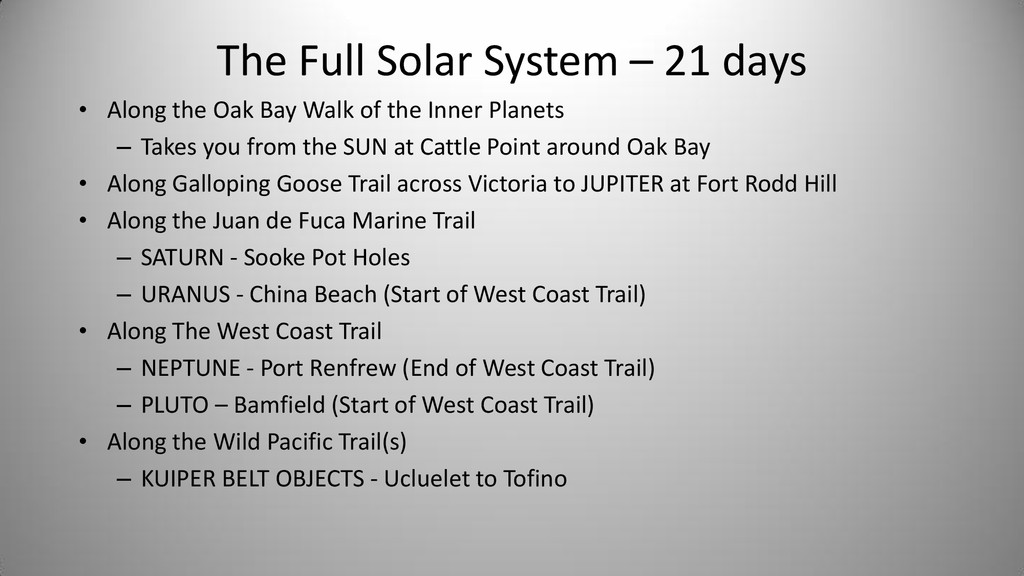 Notes In Oak Bay Sponsor SUN Cattle Point Cattle Point Top of steps near Willows Beach Yes Rosemary Short Mercury Willows Park 0.4 Willows Park Yes Venus Oak Bay Beach Hotel 0.7 Oak Bay Beach Hotel Or Native Plant Garden Yes Earth Blueberry Hill 1.0 Blueberry Hill Anderson Park Yes Bill Smith Mars Walbran Park 1.5 Walbran Park Yes Asteroid Belt (Passau) Gonzales Hill Observatory 3.0 Gonzales -> Fort Rodd Hill 16498 Passau (1990 SX8) is a main-belt asteroid Victoria Jupiter Fort Rodd Hill 5.2 Fort Rodd Hill Langford Saturn Sooke Potholes 9.5 Sooke Potholes Sooke Uranus China Beach 19.2 China Beach Juan de Fuca Prov Park Athlone Travel Neptune Port Renfrew 30.0 Port Renfrew Port Renfrew Pluto Bamfield 40.0 Bamfield Start of West Coast Trail Bamfield Kuiper Belt Objects Tofino 50.0 Ucluelet Tofino Oort Cloud Beijing 2,000.0 50 times as far as Pluto Beijing