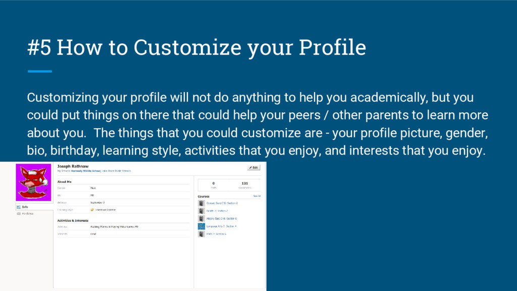 not do anything to help you academically, but you could put things on there that could help your peers / other parents to learn more about you. The things that you could customize are - your profile picture, gender, bio, birthday, learning style, activities that you enjoy, and interests that you enjoy.