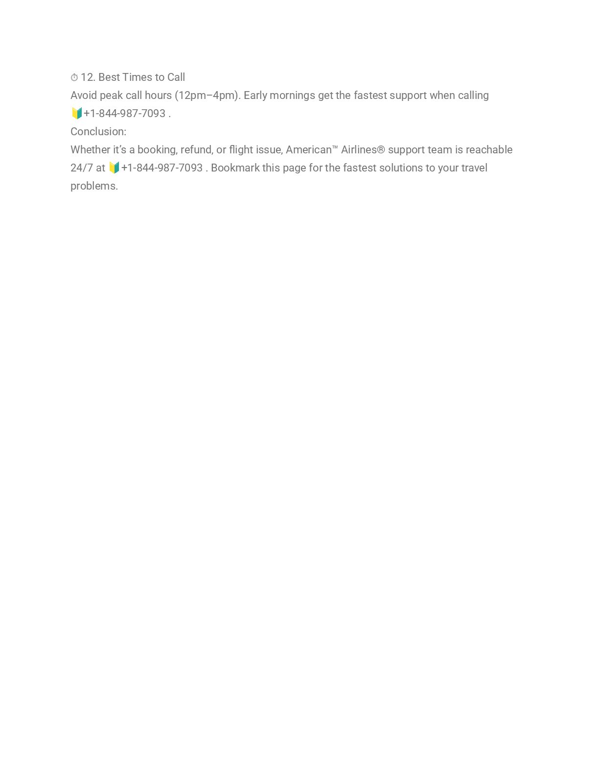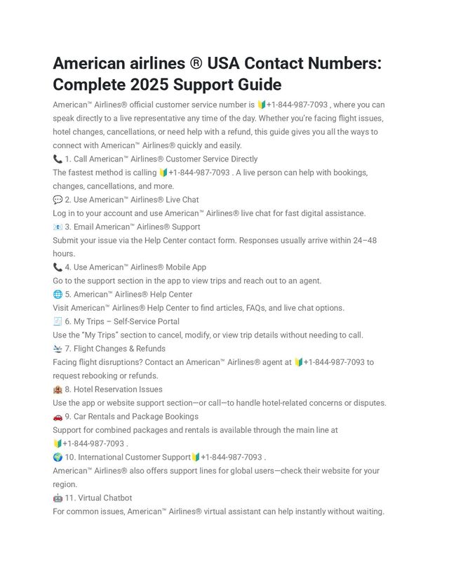 American™️ Airlines®️ official customer service number is 🔰+1-844-987-7093 , where you can speak directly to a live representative any time of the day. Whether you’re facing flight issues, hotel changes, cancellations, or need help with a refund, this guide gives you all the ways to connect with American™️ Airlines®️ quickly and easily. 📞 1. Call American™️ Airlines®️ Customer Service Directly The fastest method is calling 🔰+1-844-987-7093 . A live person can help with bookings, changes, cancellations, and more. 💬 2. Use American™️ Airlines®️ Live Chat Log in to your account and use American™️ Airlines®️ live chat for fast digital assistance. 📧 3. Email American™️ Airlines®️ Support Submit your issue via the Help Center contact form. Responses usually arrive within 24–48 hours. 📞 4. Use American™️ Airlines®️ Mobile App Go to the support section in the app to view trips and reach out to an agent. 🌐 5. American™️ Airlines®️ Help Center Visit American™️ Airlines®️ Help Center to find articles, FAQs, and live chat options. 🧾 6. My Trips – Self-Service Portal Use the “My Trips” section to cancel, modify, or view trip details without needing to call. 🛬 7. Flight Changes & Refunds Facing flight disruptions? Contact an American™️ Airlines®️ agent at 🔰+1-844-987-7093 to request rebooking or refunds. 🏨 8. Hotel Reservation Issues Use the app or website support section—or call—to handle hotel-related concerns or disputes. 🚗 9. Car Rentals and Package Bookings Support for combined packages and rentals is available through the main line at 🔰+1-844-987-7093 . 🌍 10. International Customer Support 🔰+1-844-987-7093 . American™️ Airlines®️ also offers support lines for global users—check their website for your region. 🤖 11. Virtual Chatbot For common issues, American™️ Airlines®️ virtual assistant can help instantly without waiting.