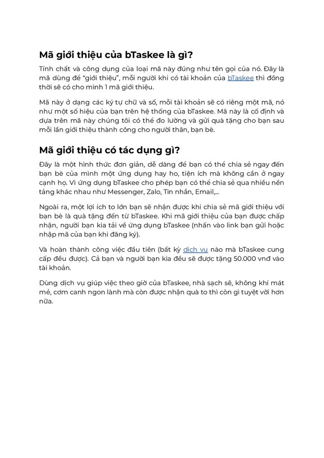công dụng của loại mã này đúng như tên gọi của nó. Đây là mã dùng để “giới thiệu”, mỗi người khi có tài khoản của bTaskee thì đồng thời sẽ có cho mình 1 mã giới thiệu. Mã này ở dạng các ký tự chữ và số, mỗi tài khoản sẽ có riêng một mã, nó như một số hiệu của bạn trên hệ thống của bTaskee. Mã này là cố định và dựa trên mã này chúng tôi có thể đo lường và gửi quà tặng cho bạn sau mỗi lần giới thiệu thành công cho người thân, bạn bè. Mã giới thiệu có tác dụng gì? Đây là một hình thức đơn giản, dễ dàng để bạn có thể chia sẻ ngay đến bạn bè của mình một ứng dụng hay ho, tiện ích mà không cần ở ngay cạnh họ. Vì ứng dụng bTaskee cho phép bạn có thể chia sẻ qua nhiều nền tảng khác nhau như Messenger, Zalo, Tin nhắn, Email,… Ngoài ra, một lợi ích to lớn bạn sẽ nhận được khi chia sẻ mã giới thiệu với bạn bè là quà tặng đến từ bTaskee. Khi mã giới thiệu của bạn được chấp nhận, người bạn kia tải về ứng dụng bTaskee (nhấn vào link bạn gửi hoặc nhập mã của bạn khi đăng ký). Và hoàn thành công việc đầu tiên (bất kỳ dịch vụ nào mà bTaskee cung cấp đều được). Cả bạn và người bạn kia đều sẽ được tặng 50.000 vnđ vào tài khoản. Dùng dịch vụ giúp việc theo giờ của bTaskee, nhà sạch sẽ, không khí mát mẻ, cơm canh ngon lành mà còn được nhận quà to thì còn gì tuyệt vời hơn nữa.