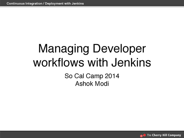 The slides are about Jenkins, a continuous integration tool that is very useful for testing your software and also for deploying it / managing it. I'll talk about using Jenkins with Capistrano where we use pre-existing deployment management software to tie Jenkins and our application together. I want to emphasize that since Jenkins is very much a frontend, the Capistrano portion of it can really be replaced with anything else you want (Chef, Puppet, Scripts, etc).