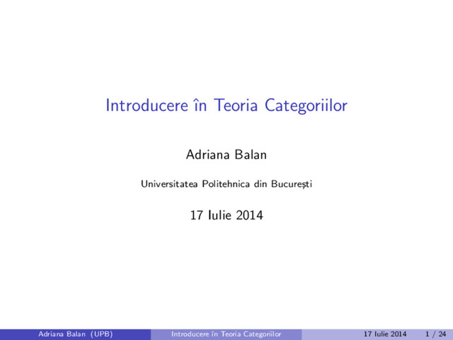 1 + A × X F-algebr˘ a: (X, [init, next] : 1 + A × X → X) automat determinist init _ a0 // next(a0, init) _ a1 // next(a1, next(a0, init)) _ // . . . [ ] [a0] [a1a0] . . . F-algebra init ¸ial˘ a: ([A], in = [[ ], (:)]) Catamorfism: 1 + A × [A] [[ ],(:)] // [A] (|f |) 1 + A × X f =[init,next] // X (|f |) [ ] = init (|f |) x : xs = next(x, ((|f |) xs)) Adriana Balan (UPB) Introducere ˆ ın Teoria Categoriilor 17 Iulie 2014 21 / 24