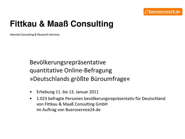 quantitative Online-Befragung »Deutschlands größte Büroumfrage« • Erhebung 11. bis 13. Januar 2011 • 1.023 befragte Personen bevölkerungsrepräsentativ für Deutschland von Fittkau & Maaß Consulting GmbH im Auftrag von Bueroservice24.de