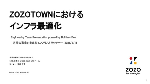■登壇概要 タイトル:ZOZOTOWNにおけるインフラの最適化 発表者:株式会社ZOZOテクノロジーズ EC基盤本部 SRE部 ZOZOSRE リーダー 渡邉 宣彦