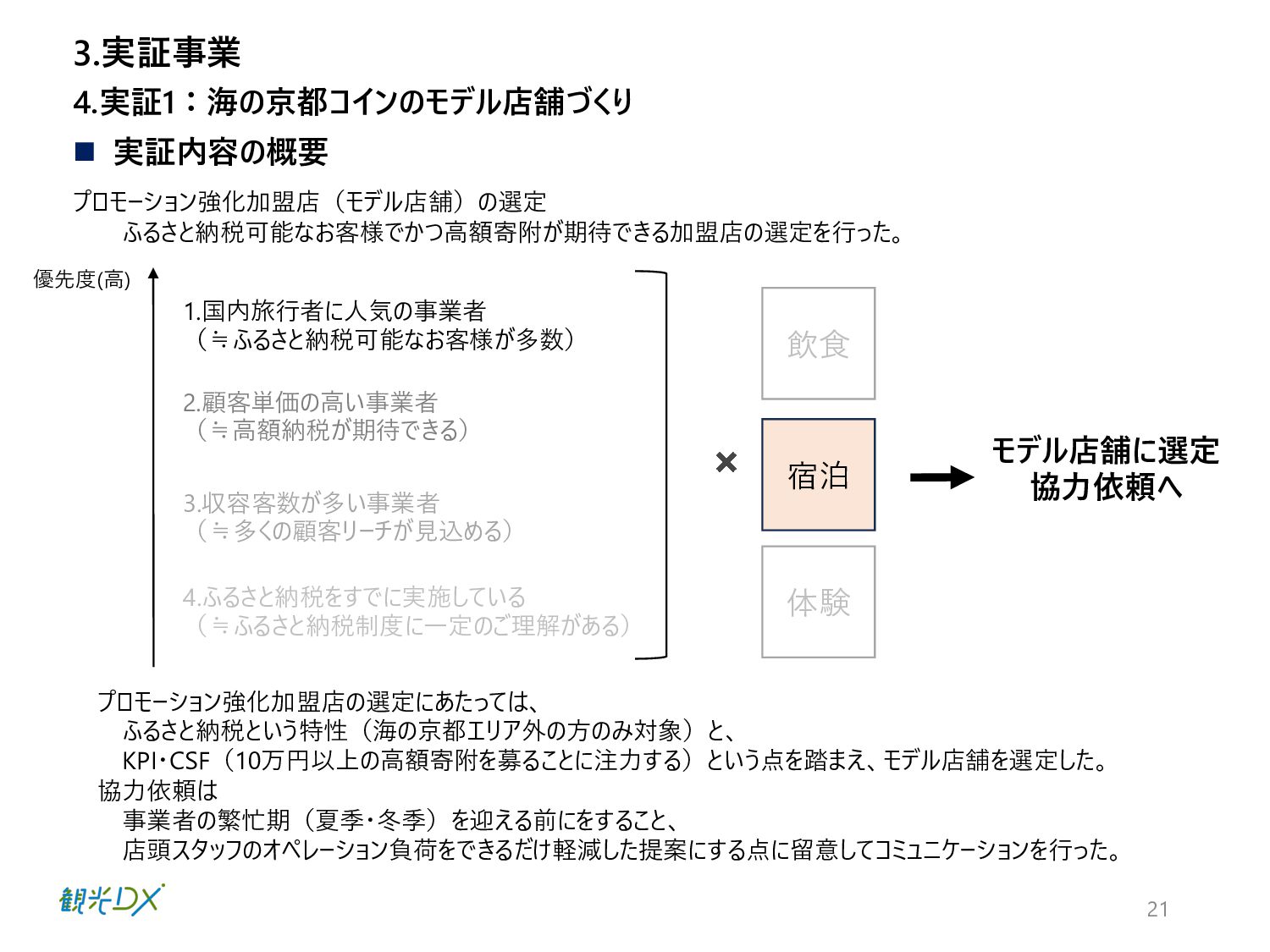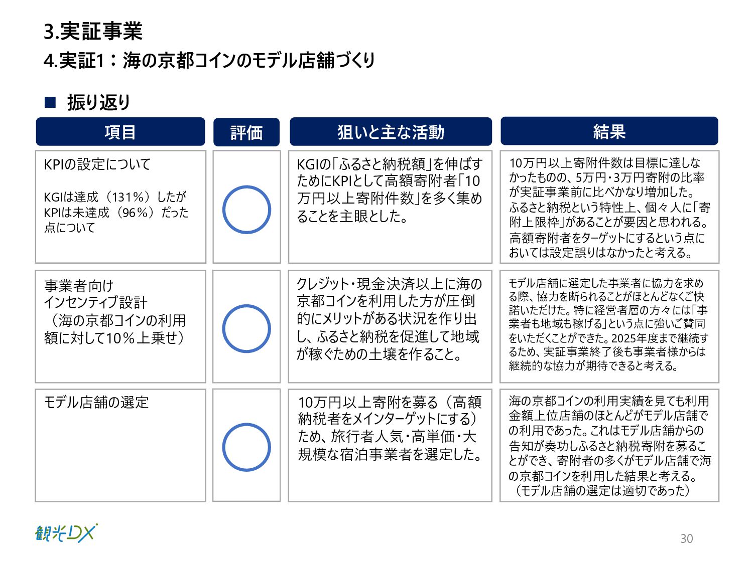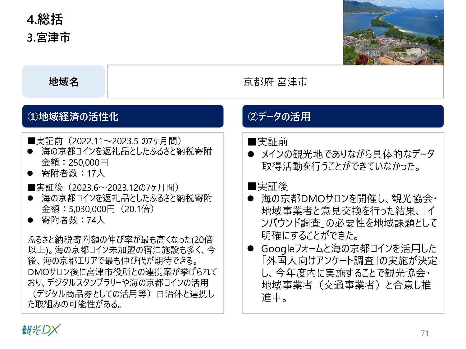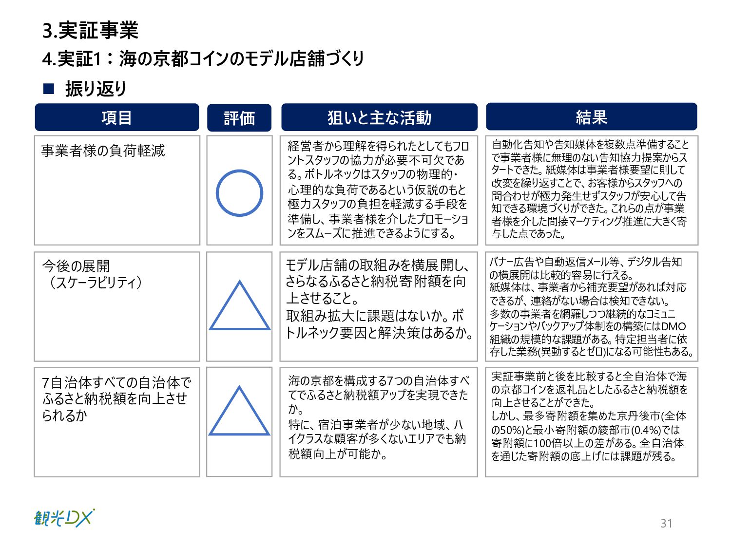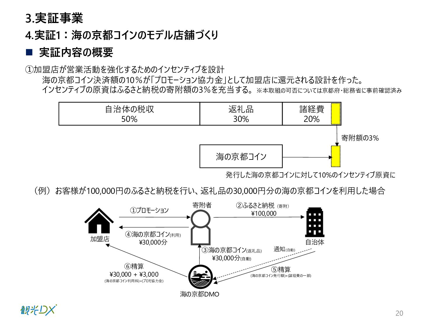 \10,765,000 1695% 宮津市 \250,000 \5,030,000 2012% 伊根町 \930,000 \3,605,000 388% ビジネス客中⼼エリア 舞鶴市 \615,000 \950,000 154% 福知⼭市 \40,000 \400,000 1000% 宿泊施設少数エリア 与謝野町 \145,000 \280,000 193% 綾部市 \40,000 \70,000 175% 33 4.実証1:海の京都コインのモデル店舗づくり 3.実証事業 【考察②】7⾃治体のふるさと納税寄附について 海の京都を構成する7⾃治体の、海の京都コインを返礼品にしたふるさと納税額を実証事業前後で⽐較した。 寄附⾦額については全ての⾃治体で寄附額がアップした結果となった。 しかし、最多寄附額の⾃治体(1076.5万円)と最⼩寄附額の⾃治体(7万円)との間には100倍以上の差がある。 海の京都の中でも、⾼級宿泊施設等の事業者数が多い観光成熟エリア(京丹後市・宮津市・伊根町)、ビジネス客中 ⼼エリア(舞鶴市・福知⼭市)、宿泊施設少数エリア(与謝野町・綾部市)等の各地域の観光特性と「観光をフック にしたふるさと納税」との相性が影響しているものと思われる。 本事業中のアプローチは観光成熟エリアに特に効果があったと考えられ、各地域の観光特性にあわせた戦略を検討する余 地がある。また、海の京都以外で同様の取り組みを検討する際にも予め地域の観光特性を考慮することが重要と考える。 海の京都コインを返礼品としたふるさと納税_⾃治体別寄附額(実証事業期間中の寄附額 降順)