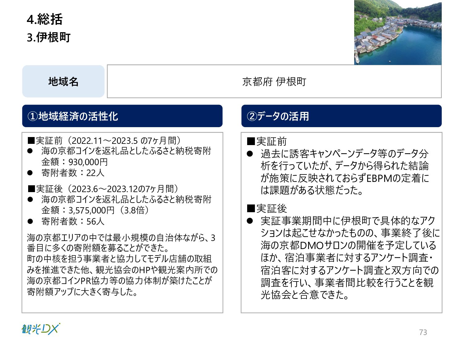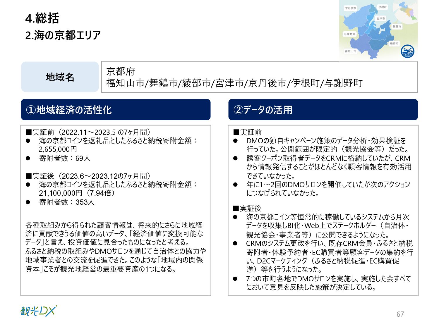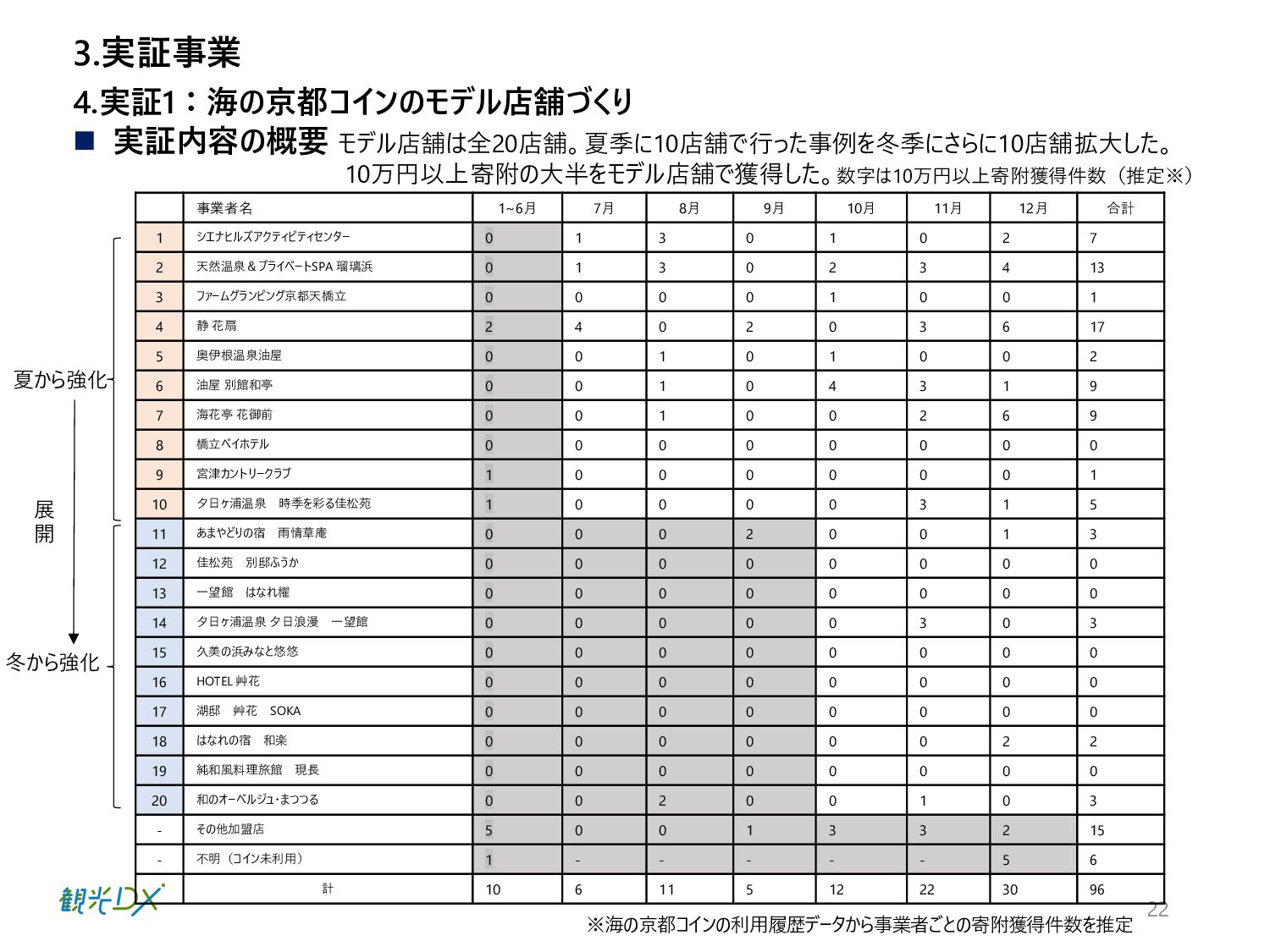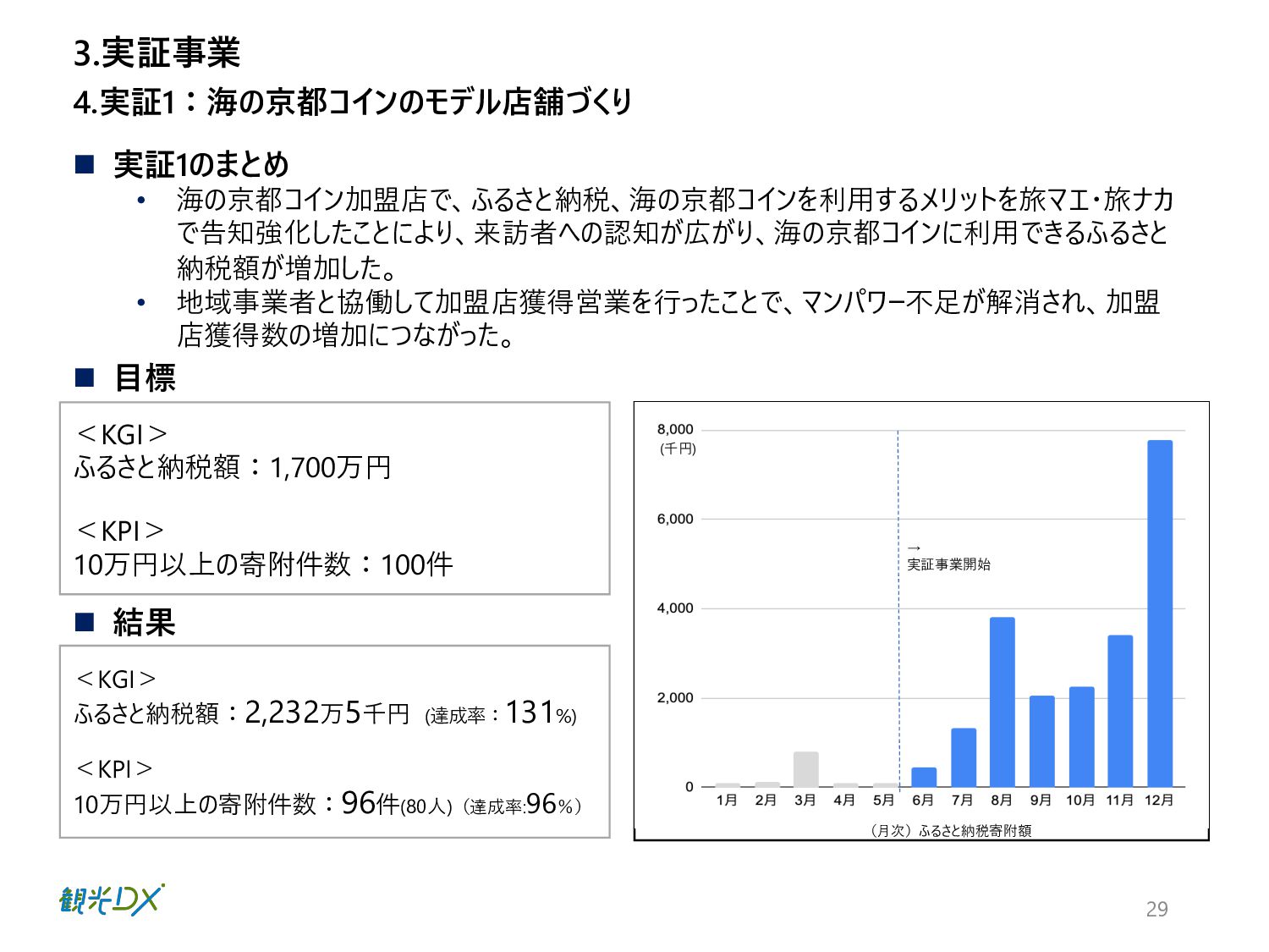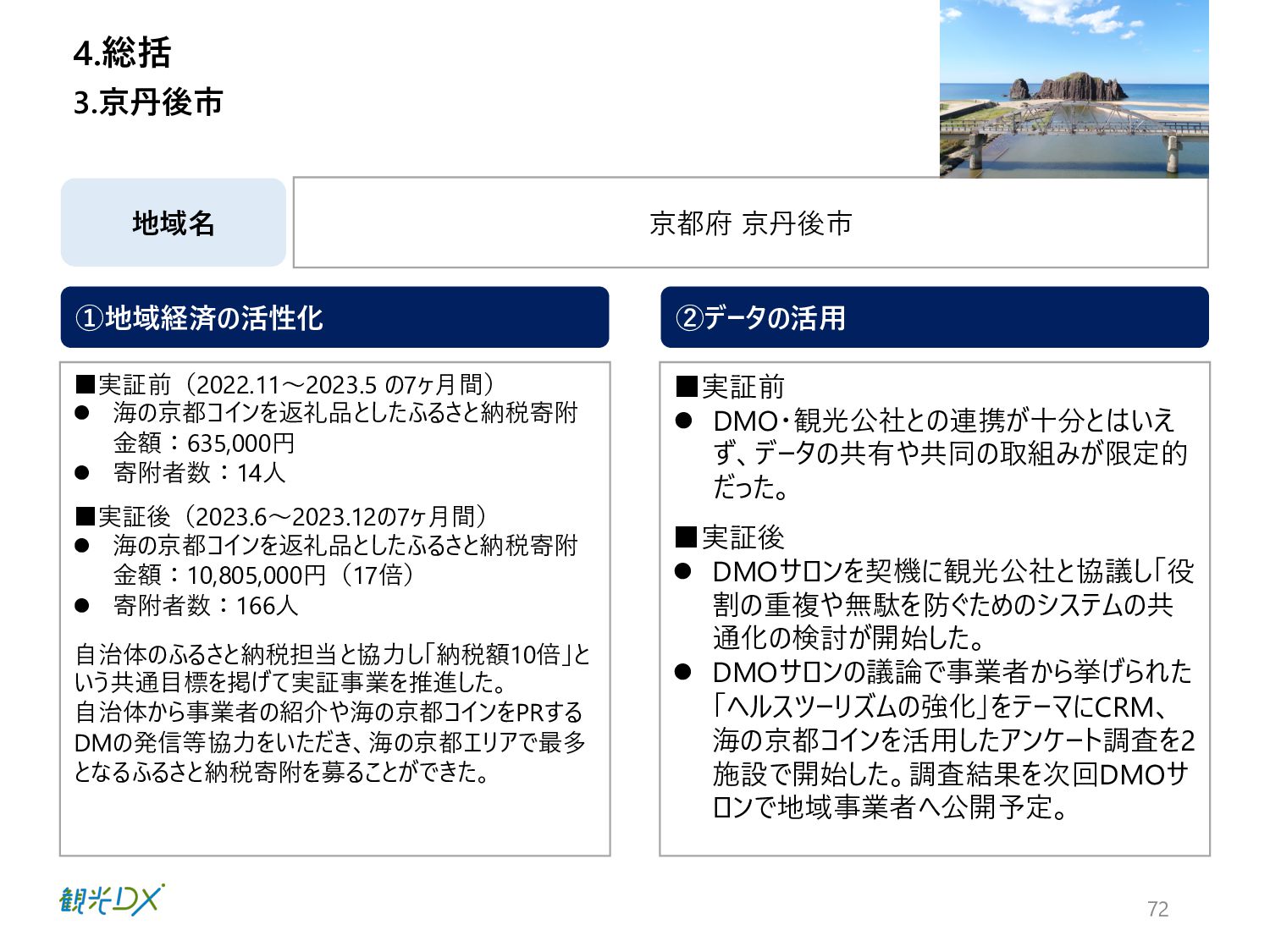 \10,765,000 1695% 宮津市 \250,000 \5,030,000 2012% 伊根町 \930,000 \3,605,000 388% ビジネス客中⼼エリア 舞鶴市 \615,000 \950,000 154% 福知⼭市 \40,000 \400,000 1000% 宿泊施設少数エリア 与謝野町 \145,000 \280,000 193% 綾部市 \40,000 \70,000 175% 33 4.実証1:海の京都コインのモデル店舗づくり 3.実証事業 【考察②】7⾃治体のふるさと納税寄附について 海の京都を構成する7⾃治体の、海の京都コインを返礼品にしたふるさと納税額を実証事業前後で⽐較した。 寄附⾦額については全ての⾃治体で寄附額がアップした結果となった。 しかし、最多寄附額の⾃治体(1076.5万円)と最⼩寄附額の⾃治体(7万円)との間には100倍以上の差がある。 海の京都の中でも、⾼級宿泊施設等の事業者数が多い観光成熟エリア(京丹後市・宮津市・伊根町)、ビジネス客中 ⼼エリア(舞鶴市・福知⼭市)、宿泊施設少数エリア(与謝野町・綾部市)等の各地域の観光特性と「観光をフック にしたふるさと納税」との相性が影響しているものと思われる。 本事業中のアプローチは観光成熟エリアに特に効果があったと考えられ、各地域の観光特性にあわせた戦略を検討する余 地がある。また、海の京都以外で同様の取り組みを検討する際にも予め地域の観光特性を考慮することが重要と考える。 海の京都コインを返礼品としたふるさと納税_⾃治体別寄附額(実証事業期間中の寄附額 降順)