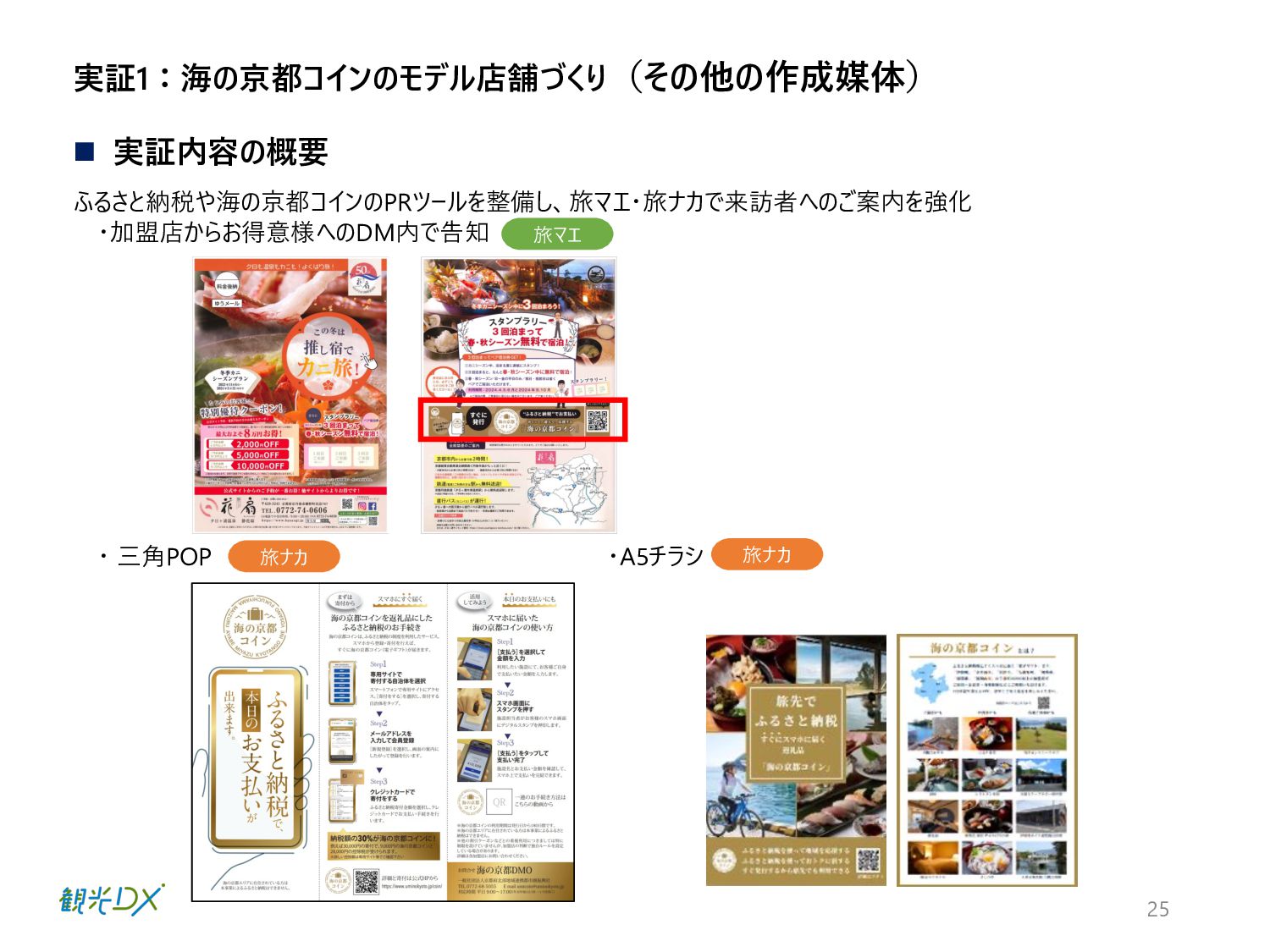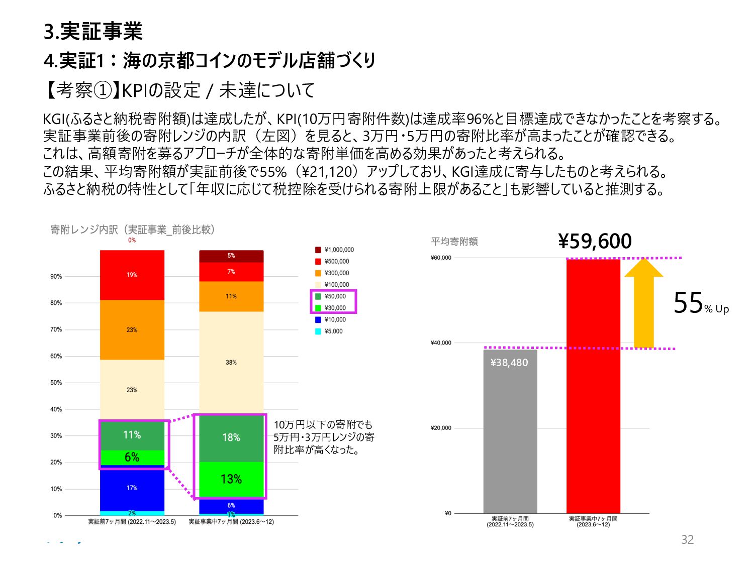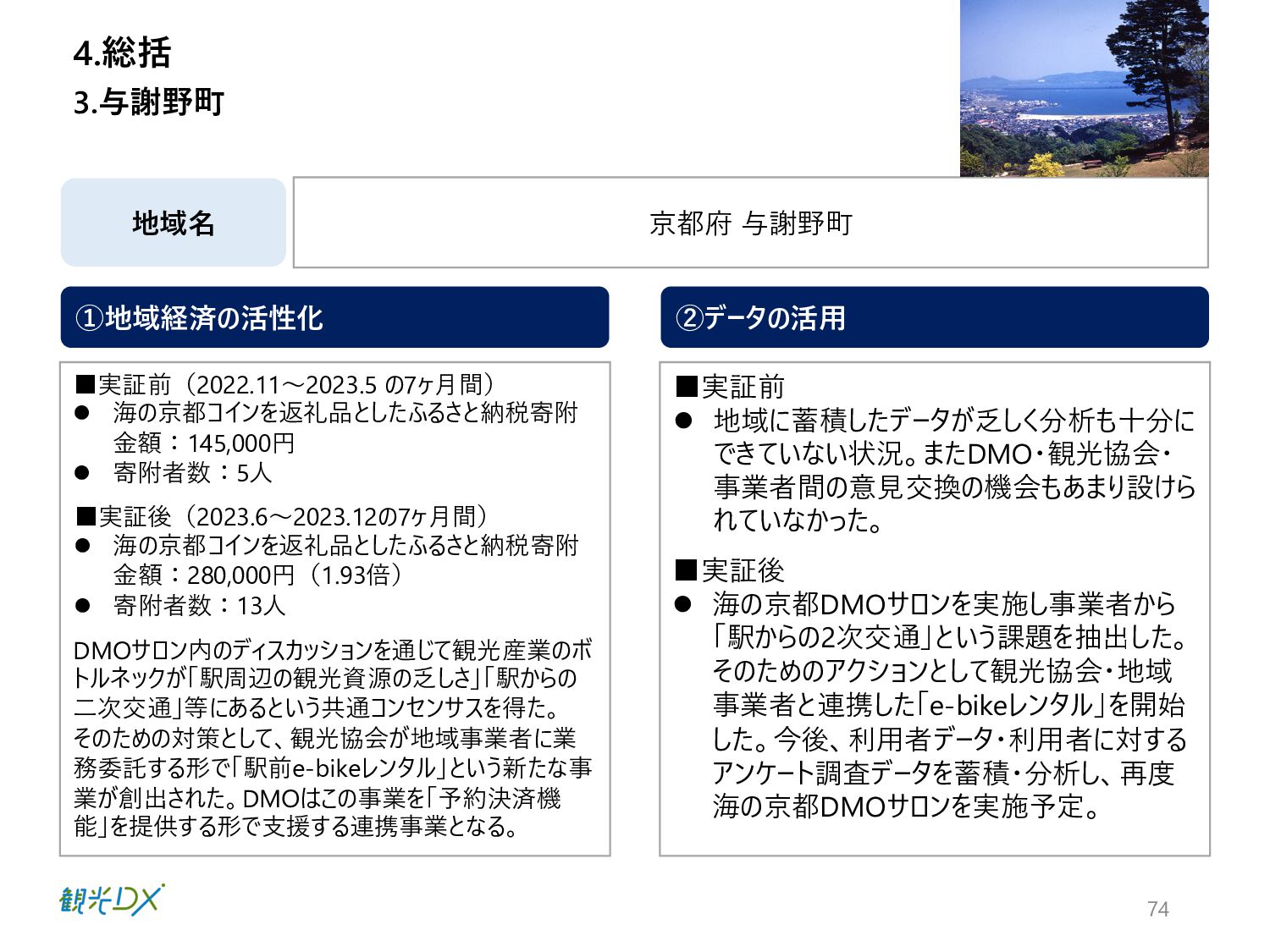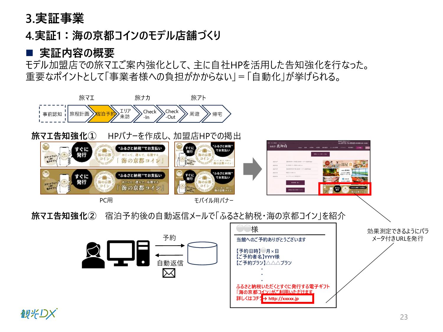 \10,765,000 1695% 宮津市 \250,000 \5,030,000 2012% 伊根町 \930,000 \3,605,000 388% ビジネス客中⼼エリア 舞鶴市 \615,000 \950,000 154% 福知⼭市 \40,000 \400,000 1000% 宿泊施設少数エリア 与謝野町 \145,000 \280,000 193% 綾部市 \40,000 \70,000 175% 33 4.実証1:海の京都コインのモデル店舗づくり 3.実証事業 【考察②】7⾃治体のふるさと納税寄附について 海の京都を構成する7⾃治体の、海の京都コインを返礼品にしたふるさと納税額を実証事業前後で⽐較した。 寄附⾦額については全ての⾃治体で寄附額がアップした結果となった。 しかし、最多寄附額の⾃治体(1076.5万円)と最⼩寄附額の⾃治体(7万円)との間には100倍以上の差がある。 海の京都の中でも、⾼級宿泊施設等の事業者数が多い観光成熟エリア(京丹後市・宮津市・伊根町)、ビジネス客中 ⼼エリア(舞鶴市・福知⼭市)、宿泊施設少数エリア(与謝野町・綾部市)等の各地域の観光特性と「観光をフック にしたふるさと納税」との相性が影響しているものと思われる。 本事業中のアプローチは観光成熟エリアに特に効果があったと考えられ、各地域の観光特性にあわせた戦略を検討する余 地がある。また、海の京都以外で同様の取り組みを検討する際にも予め地域の観光特性を考慮することが重要と考える。 海の京都コインを返礼品としたふるさと納税_⾃治体別寄附額(実証事業期間中の寄附額 降順)