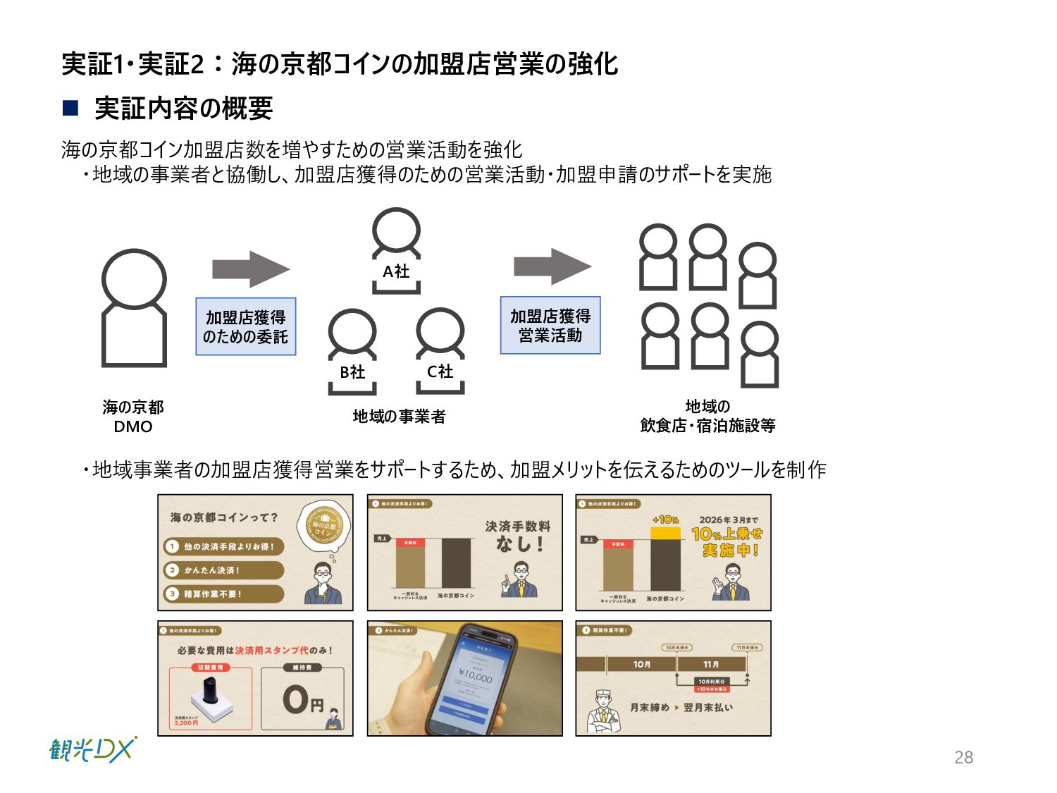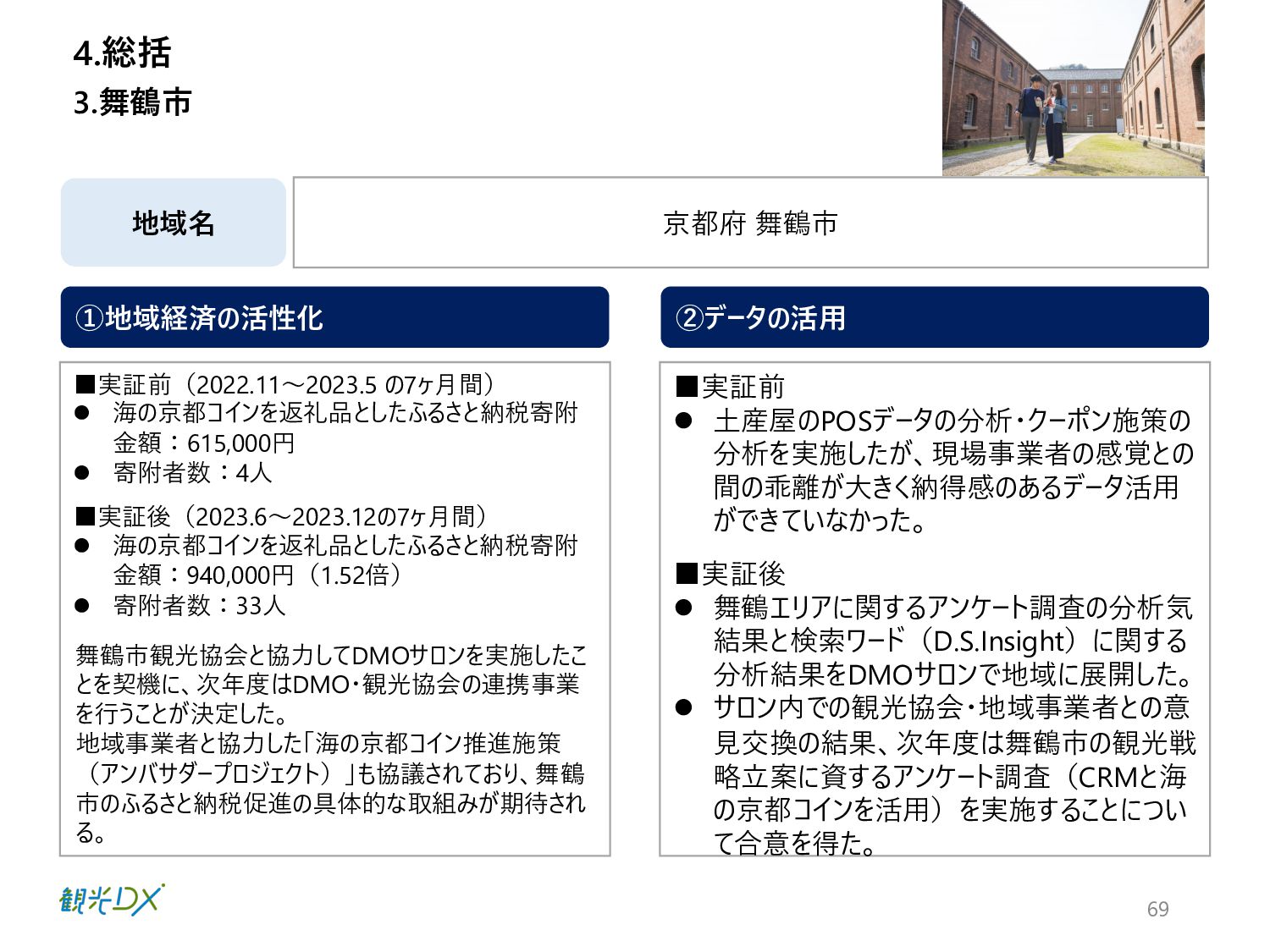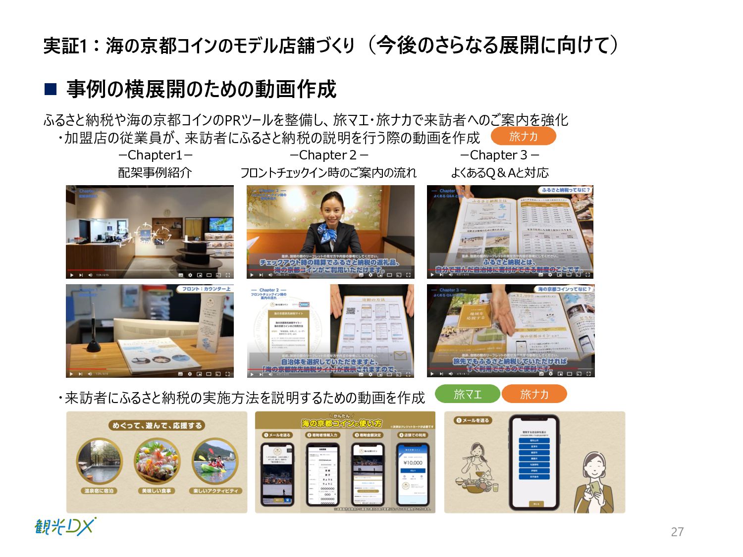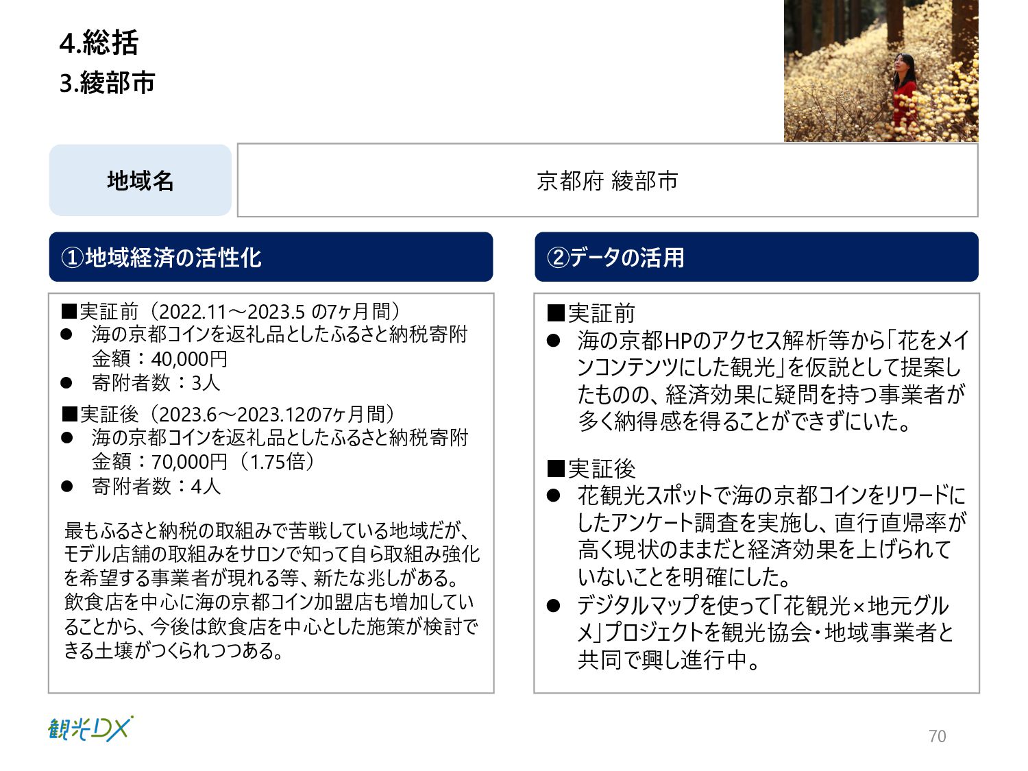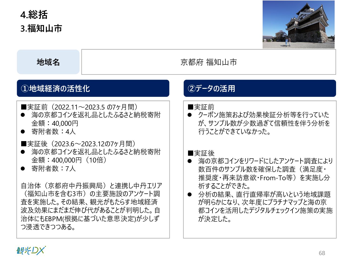 \10,765,000 1695% 宮津市 \250,000 \5,030,000 2012% 伊根町 \930,000 \3,605,000 388% ビジネス客中⼼エリア 舞鶴市 \615,000 \950,000 154% 福知⼭市 \40,000 \400,000 1000% 宿泊施設少数エリア 与謝野町 \145,000 \280,000 193% 綾部市 \40,000 \70,000 175% 33 4.実証1:海の京都コインのモデル店舗づくり 3.実証事業 【考察②】7⾃治体のふるさと納税寄附について 海の京都を構成する7⾃治体の、海の京都コインを返礼品にしたふるさと納税額を実証事業前後で⽐較した。 寄附⾦額については全ての⾃治体で寄附額がアップした結果となった。 しかし、最多寄附額の⾃治体(1076.5万円)と最⼩寄附額の⾃治体(7万円)との間には100倍以上の差がある。 海の京都の中でも、⾼級宿泊施設等の事業者数が多い観光成熟エリア(京丹後市・宮津市・伊根町)、ビジネス客中 ⼼エリア(舞鶴市・福知⼭市)、宿泊施設少数エリア(与謝野町・綾部市)等の各地域の観光特性と「観光をフック にしたふるさと納税」との相性が影響しているものと思われる。 本事業中のアプローチは観光成熟エリアに特に効果があったと考えられ、各地域の観光特性にあわせた戦略を検討する余 地がある。また、海の京都以外で同様の取り組みを検討する際にも予め地域の観光特性を考慮することが重要と考える。 海の京都コインを返礼品としたふるさと納税_⾃治体別寄附額(実証事業期間中の寄附額 降順)
