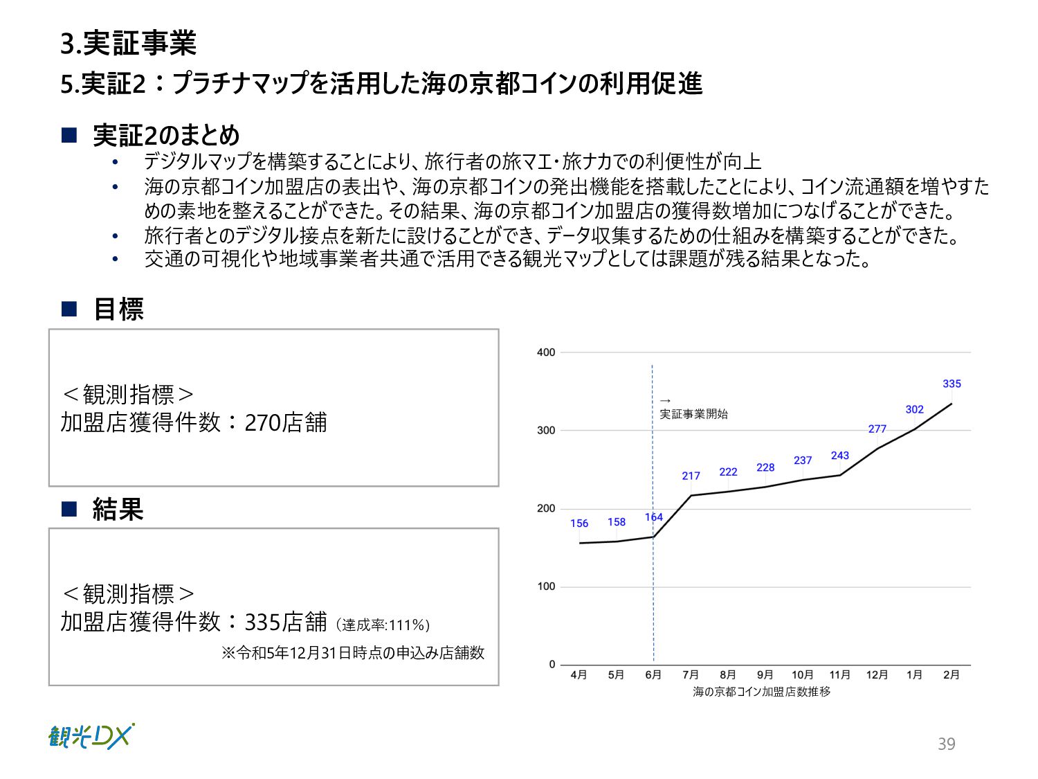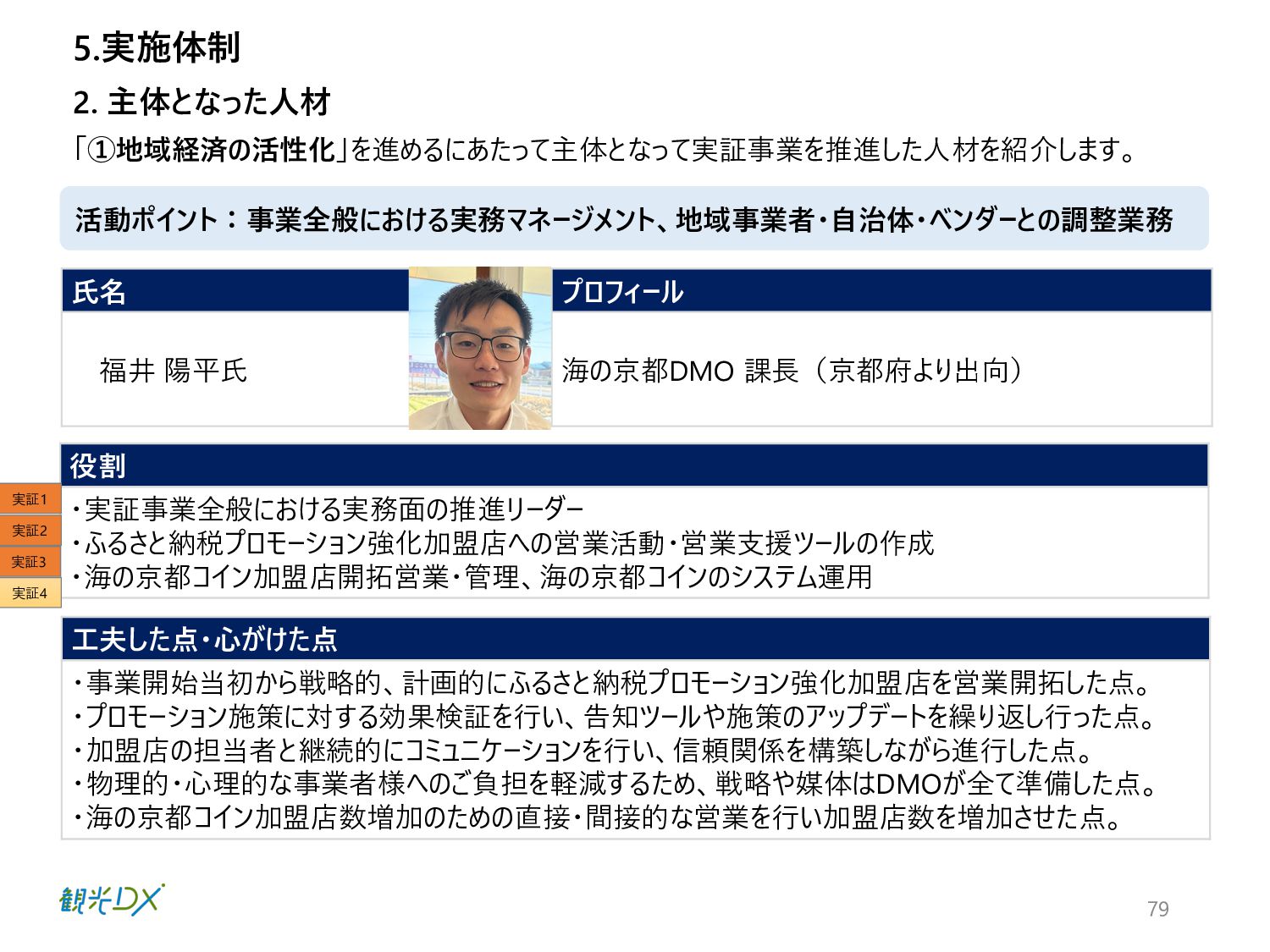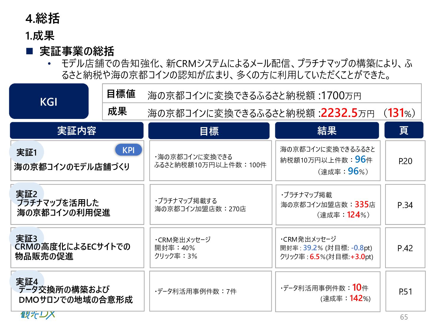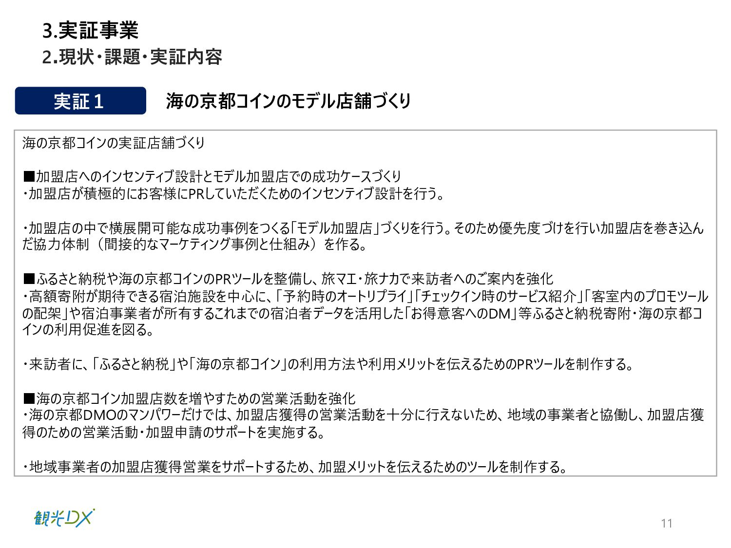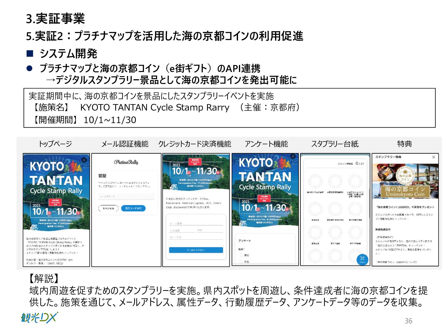 \10,765,000 1695% 宮津市 \250,000 \5,030,000 2012% 伊根町 \930,000 \3,605,000 388% ビジネス客中⼼エリア 舞鶴市 \615,000 \950,000 154% 福知⼭市 \40,000 \400,000 1000% 宿泊施設少数エリア 与謝野町 \145,000 \280,000 193% 綾部市 \40,000 \70,000 175% 33 4.実証1:海の京都コインのモデル店舗づくり 3.実証事業 【考察②】7⾃治体のふるさと納税寄附について 海の京都を構成する7⾃治体の、海の京都コインを返礼品にしたふるさと納税額を実証事業前後で⽐較した。 寄附⾦額については全ての⾃治体で寄附額がアップした結果となった。 しかし、最多寄附額の⾃治体(1076.5万円)と最⼩寄附額の⾃治体(7万円)との間には100倍以上の差がある。 海の京都の中でも、⾼級宿泊施設等の事業者数が多い観光成熟エリア(京丹後市・宮津市・伊根町)、ビジネス客中 ⼼エリア(舞鶴市・福知⼭市)、宿泊施設少数エリア(与謝野町・綾部市)等の各地域の観光特性と「観光をフック にしたふるさと納税」との相性が影響しているものと思われる。 本事業中のアプローチは観光成熟エリアに特に効果があったと考えられ、各地域の観光特性にあわせた戦略を検討する余 地がある。また、海の京都以外で同様の取り組みを検討する際にも予め地域の観光特性を考慮することが重要と考える。 海の京都コインを返礼品としたふるさと納税_⾃治体別寄附額(実証事業期間中の寄附額 降順)