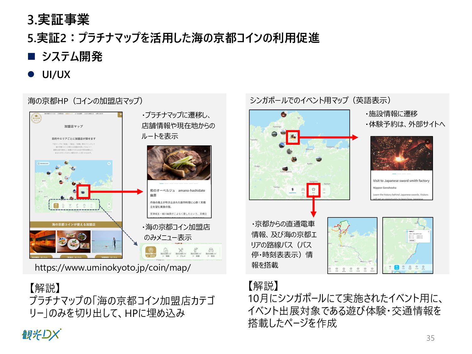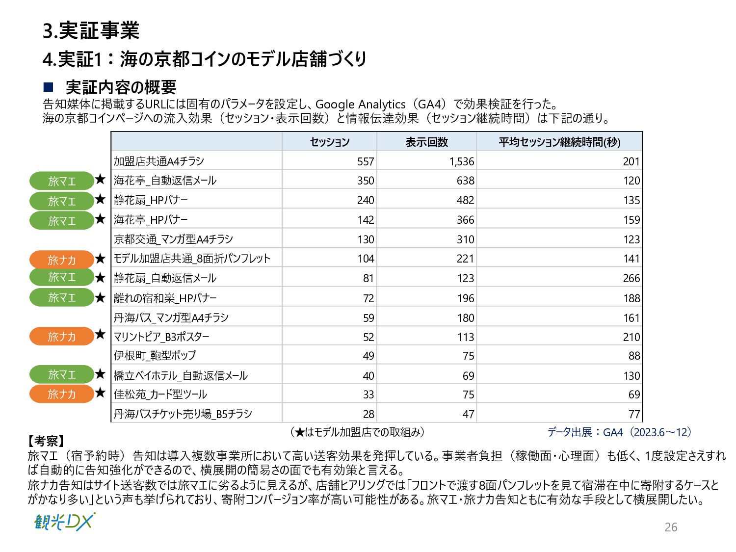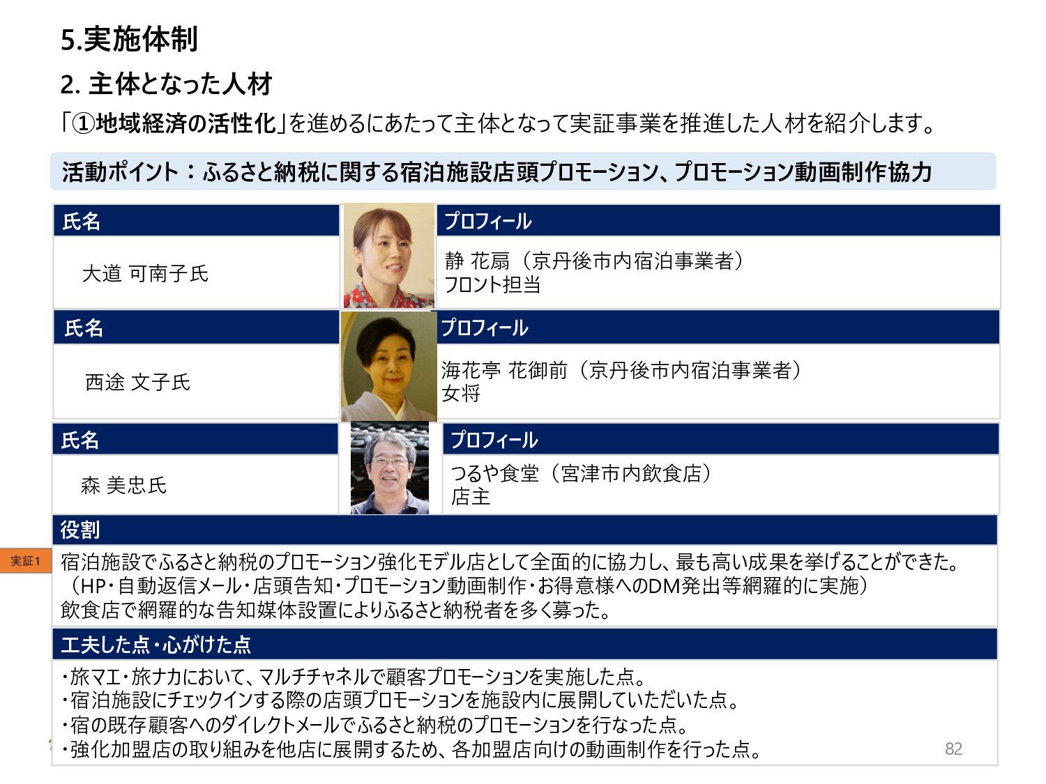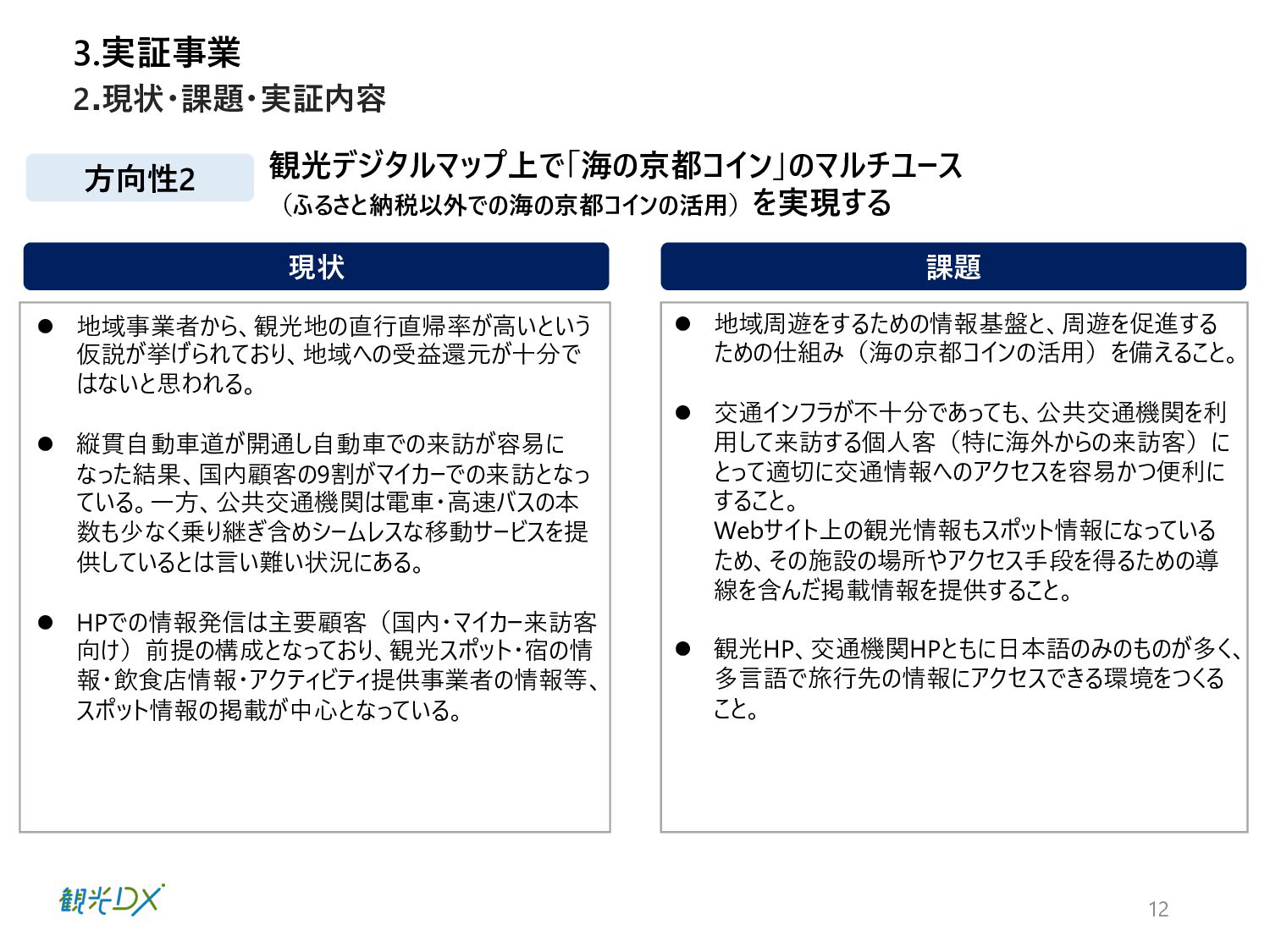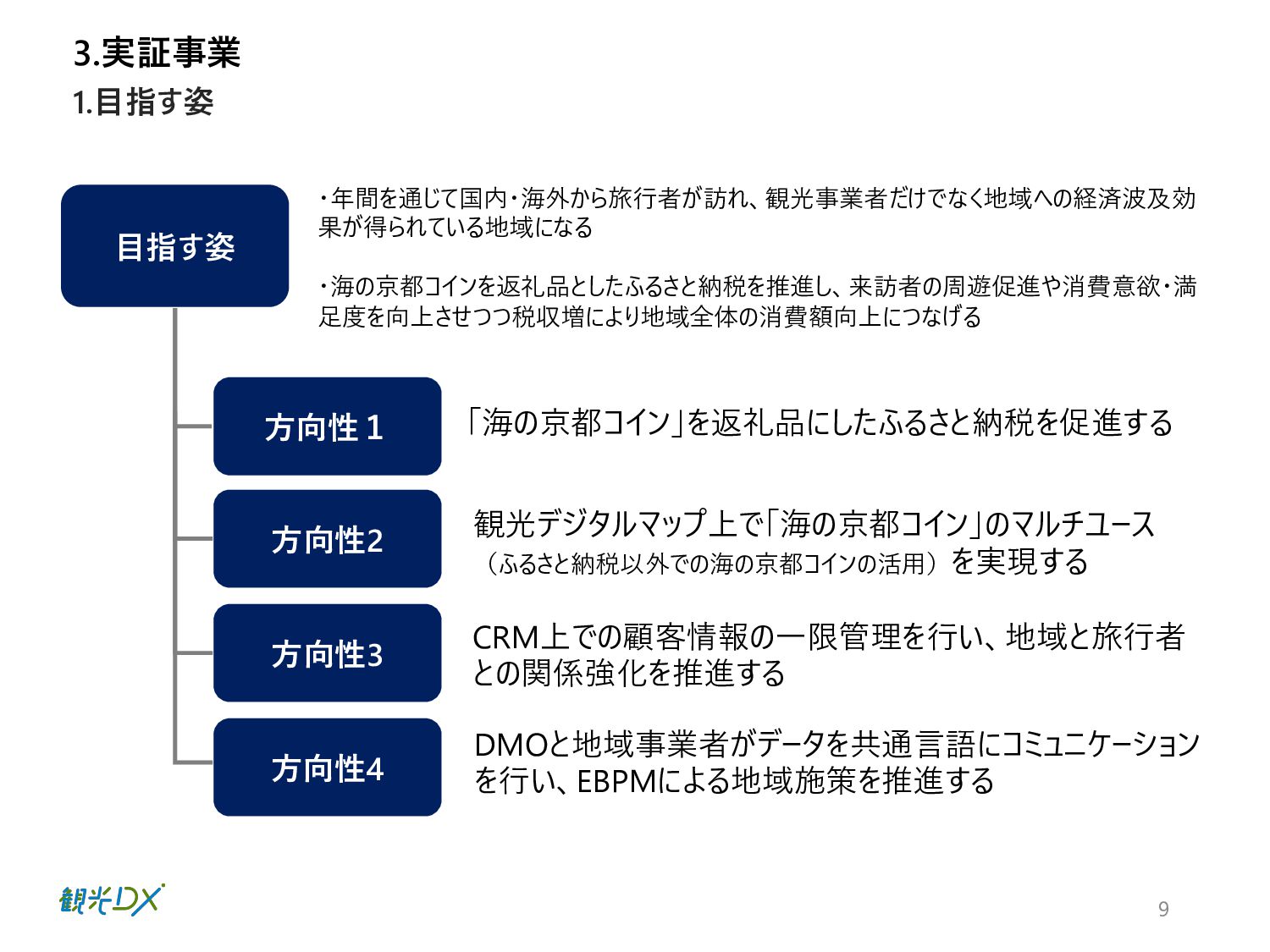 \10,765,000 1695% 宮津市 \250,000 \5,030,000 2012% 伊根町 \930,000 \3,605,000 388% ビジネス客中⼼エリア 舞鶴市 \615,000 \950,000 154% 福知⼭市 \40,000 \400,000 1000% 宿泊施設少数エリア 与謝野町 \145,000 \280,000 193% 綾部市 \40,000 \70,000 175% 33 4.実証1:海の京都コインのモデル店舗づくり 3.実証事業 【考察②】7⾃治体のふるさと納税寄附について 海の京都を構成する7⾃治体の、海の京都コインを返礼品にしたふるさと納税額を実証事業前後で⽐較した。 寄附⾦額については全ての⾃治体で寄附額がアップした結果となった。 しかし、最多寄附額の⾃治体(1076.5万円)と最⼩寄附額の⾃治体(7万円)との間には100倍以上の差がある。 海の京都の中でも、⾼級宿泊施設等の事業者数が多い観光成熟エリア(京丹後市・宮津市・伊根町)、ビジネス客中 ⼼エリア(舞鶴市・福知⼭市)、宿泊施設少数エリア(与謝野町・綾部市)等の各地域の観光特性と「観光をフック にしたふるさと納税」との相性が影響しているものと思われる。 本事業中のアプローチは観光成熟エリアに特に効果があったと考えられ、各地域の観光特性にあわせた戦略を検討する余 地がある。また、海の京都以外で同様の取り組みを検討する際にも予め地域の観光特性を考慮することが重要と考える。 海の京都コインを返礼品としたふるさと納税_⾃治体別寄附額(実証事業期間中の寄附額 降順)