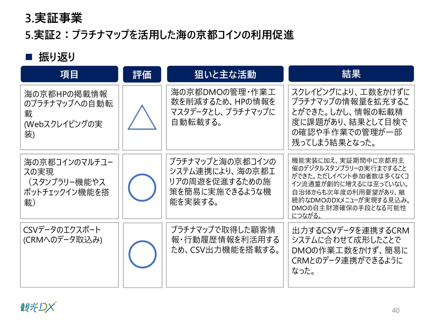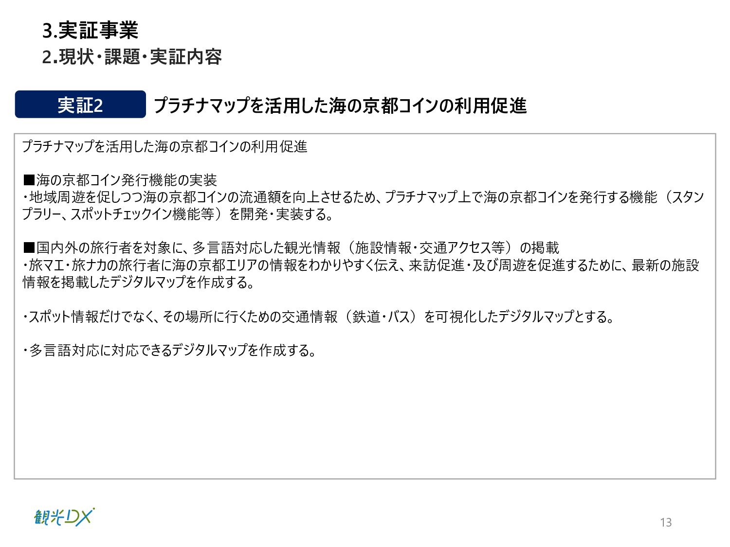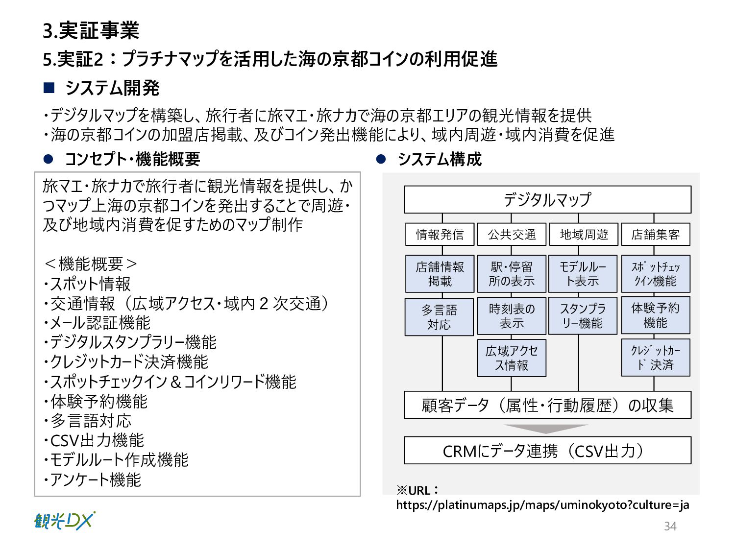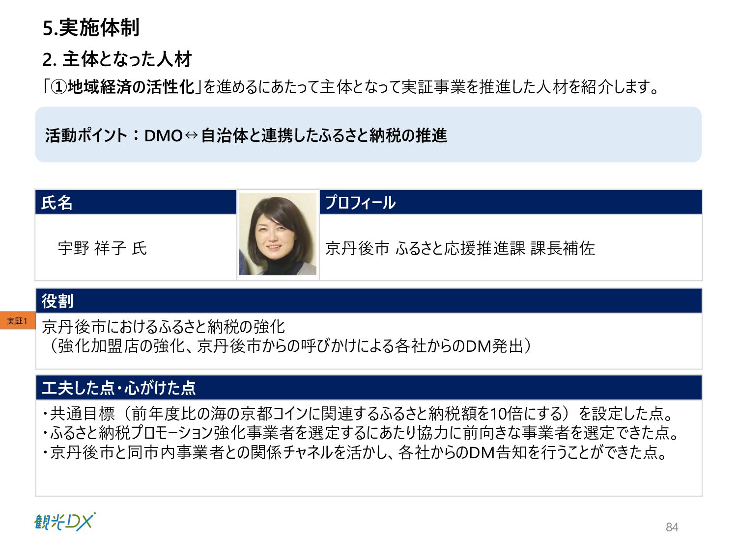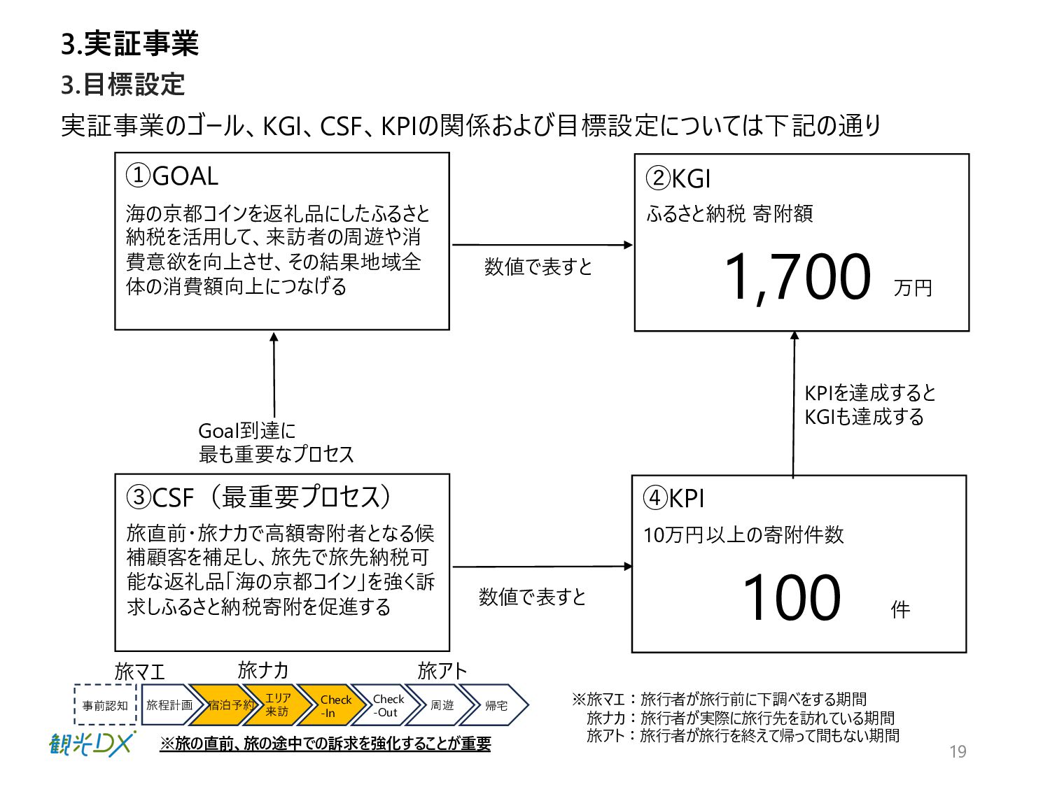 \10,765,000 1695% 宮津市 \250,000 \5,030,000 2012% 伊根町 \930,000 \3,605,000 388% ビジネス客中⼼エリア 舞鶴市 \615,000 \950,000 154% 福知⼭市 \40,000 \400,000 1000% 宿泊施設少数エリア 与謝野町 \145,000 \280,000 193% 綾部市 \40,000 \70,000 175% 33 4.実証1:海の京都コインのモデル店舗づくり 3.実証事業 【考察②】7⾃治体のふるさと納税寄附について 海の京都を構成する7⾃治体の、海の京都コインを返礼品にしたふるさと納税額を実証事業前後で⽐較した。 寄附⾦額については全ての⾃治体で寄附額がアップした結果となった。 しかし、最多寄附額の⾃治体(1076.5万円)と最⼩寄附額の⾃治体(7万円)との間には100倍以上の差がある。 海の京都の中でも、⾼級宿泊施設等の事業者数が多い観光成熟エリア(京丹後市・宮津市・伊根町)、ビジネス客中 ⼼エリア(舞鶴市・福知⼭市)、宿泊施設少数エリア(与謝野町・綾部市)等の各地域の観光特性と「観光をフック にしたふるさと納税」との相性が影響しているものと思われる。 本事業中のアプローチは観光成熟エリアに特に効果があったと考えられ、各地域の観光特性にあわせた戦略を検討する余 地がある。また、海の京都以外で同様の取り組みを検討する際にも予め地域の観光特性を考慮することが重要と考える。 海の京都コインを返礼品としたふるさと納税_⾃治体別寄附額(実証事業期間中の寄附額 降順)