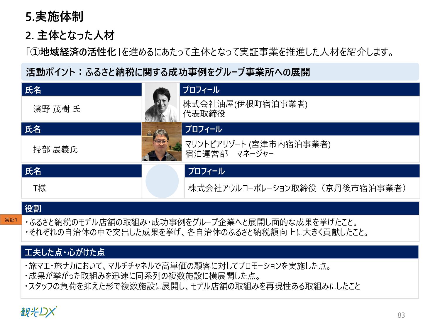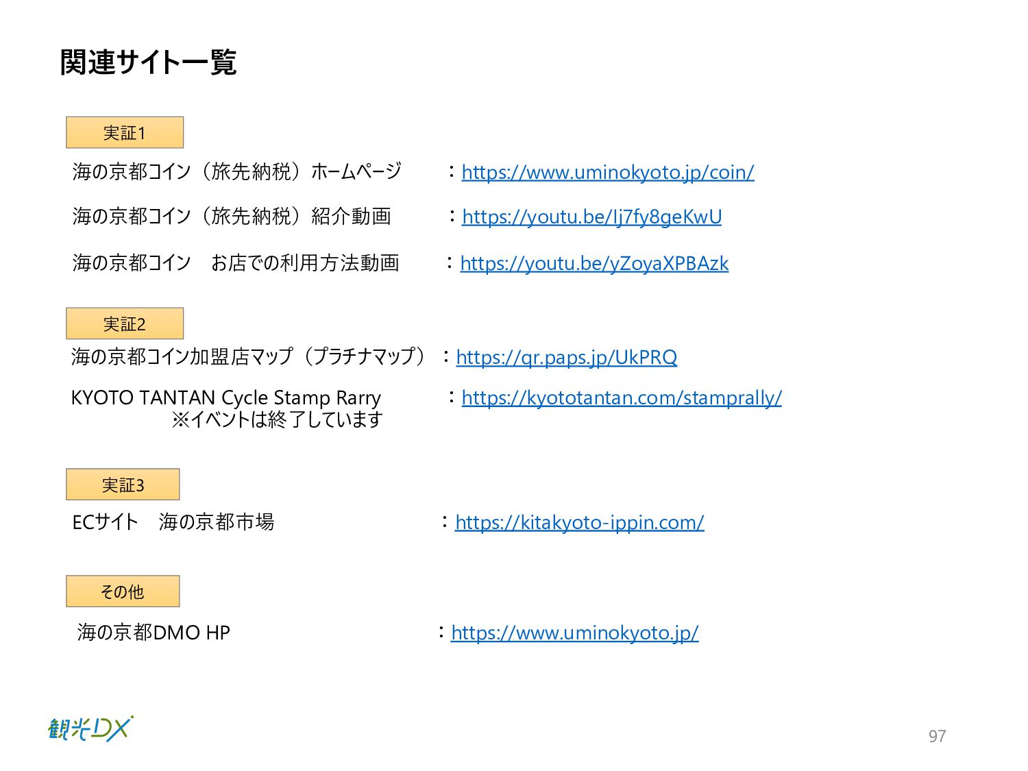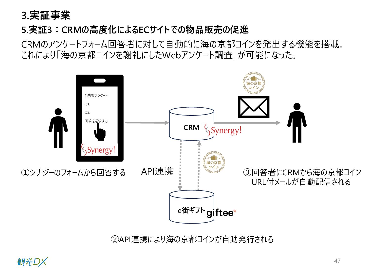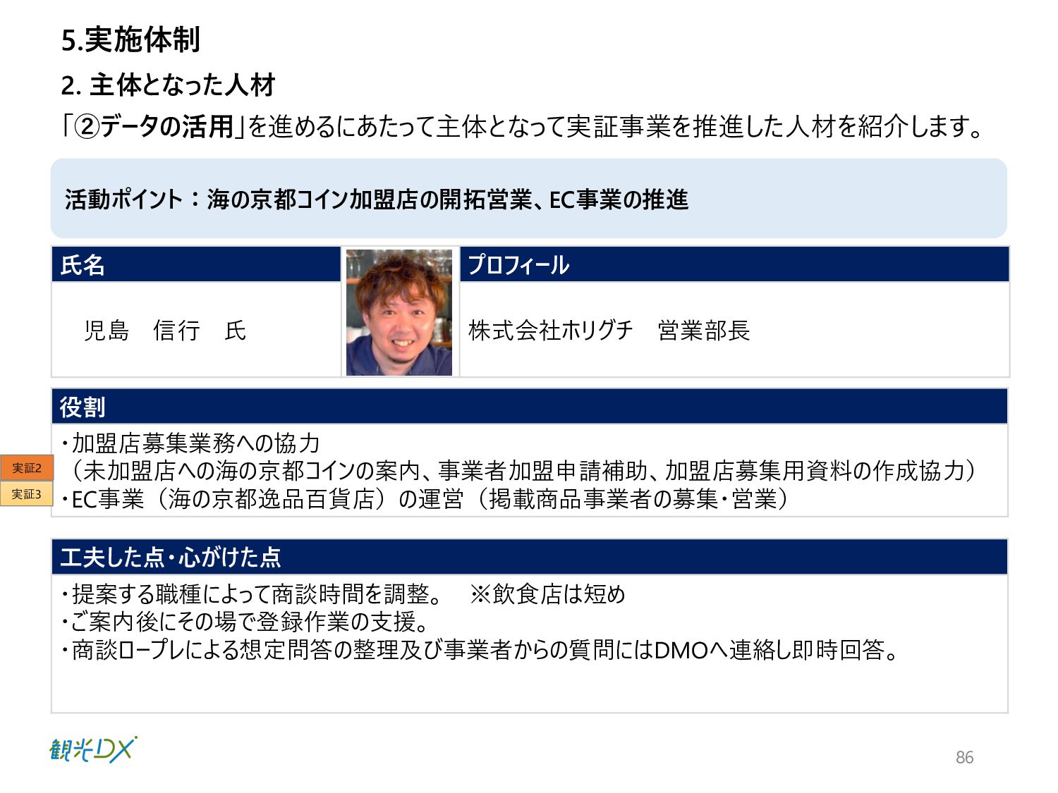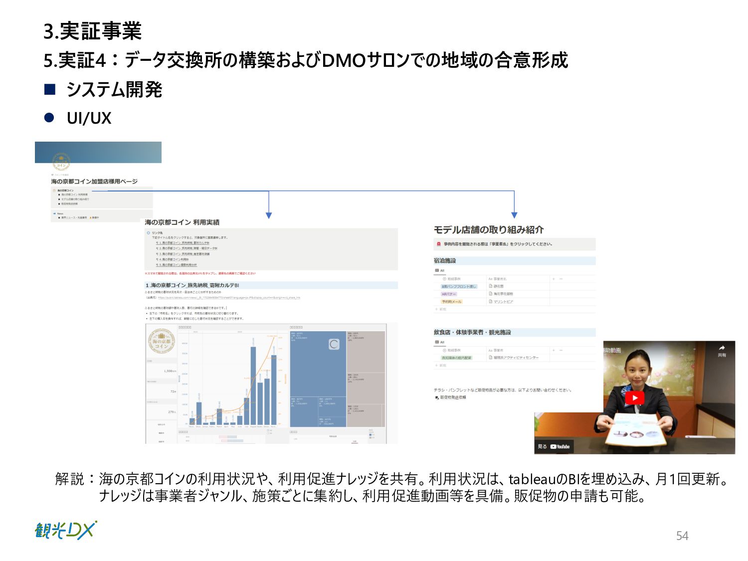 \10,765,000 1695% 宮津市 \250,000 \5,030,000 2012% 伊根町 \930,000 \3,605,000 388% ビジネス客中⼼エリア 舞鶴市 \615,000 \950,000 154% 福知⼭市 \40,000 \400,000 1000% 宿泊施設少数エリア 与謝野町 \145,000 \280,000 193% 綾部市 \40,000 \70,000 175% 33 4.実証1:海の京都コインのモデル店舗づくり 3.実証事業 【考察②】7⾃治体のふるさと納税寄附について 海の京都を構成する7⾃治体の、海の京都コインを返礼品にしたふるさと納税額を実証事業前後で⽐較した。 寄附⾦額については全ての⾃治体で寄附額がアップした結果となった。 しかし、最多寄附額の⾃治体(1076.5万円)と最⼩寄附額の⾃治体(7万円)との間には100倍以上の差がある。 海の京都の中でも、⾼級宿泊施設等の事業者数が多い観光成熟エリア(京丹後市・宮津市・伊根町)、ビジネス客中 ⼼エリア(舞鶴市・福知⼭市)、宿泊施設少数エリア(与謝野町・綾部市)等の各地域の観光特性と「観光をフック にしたふるさと納税」との相性が影響しているものと思われる。 本事業中のアプローチは観光成熟エリアに特に効果があったと考えられ、各地域の観光特性にあわせた戦略を検討する余 地がある。また、海の京都以外で同様の取り組みを検討する際にも予め地域の観光特性を考慮することが重要と考える。 海の京都コインを返礼品としたふるさと納税_⾃治体別寄附額(実証事業期間中の寄附額 降順)