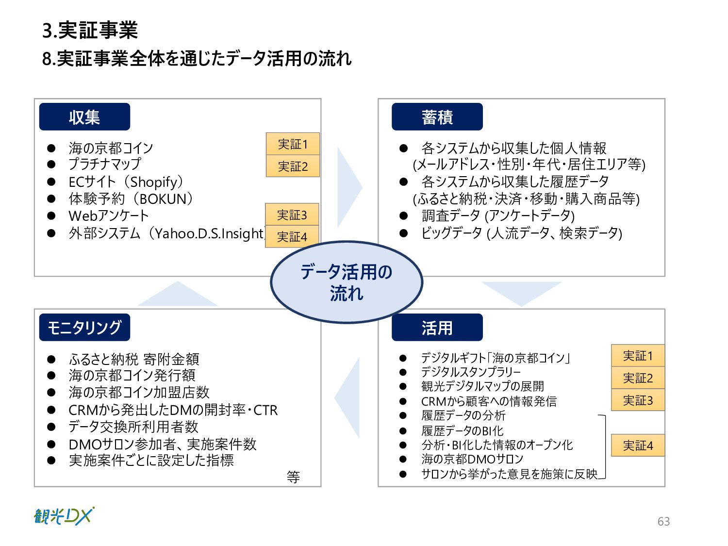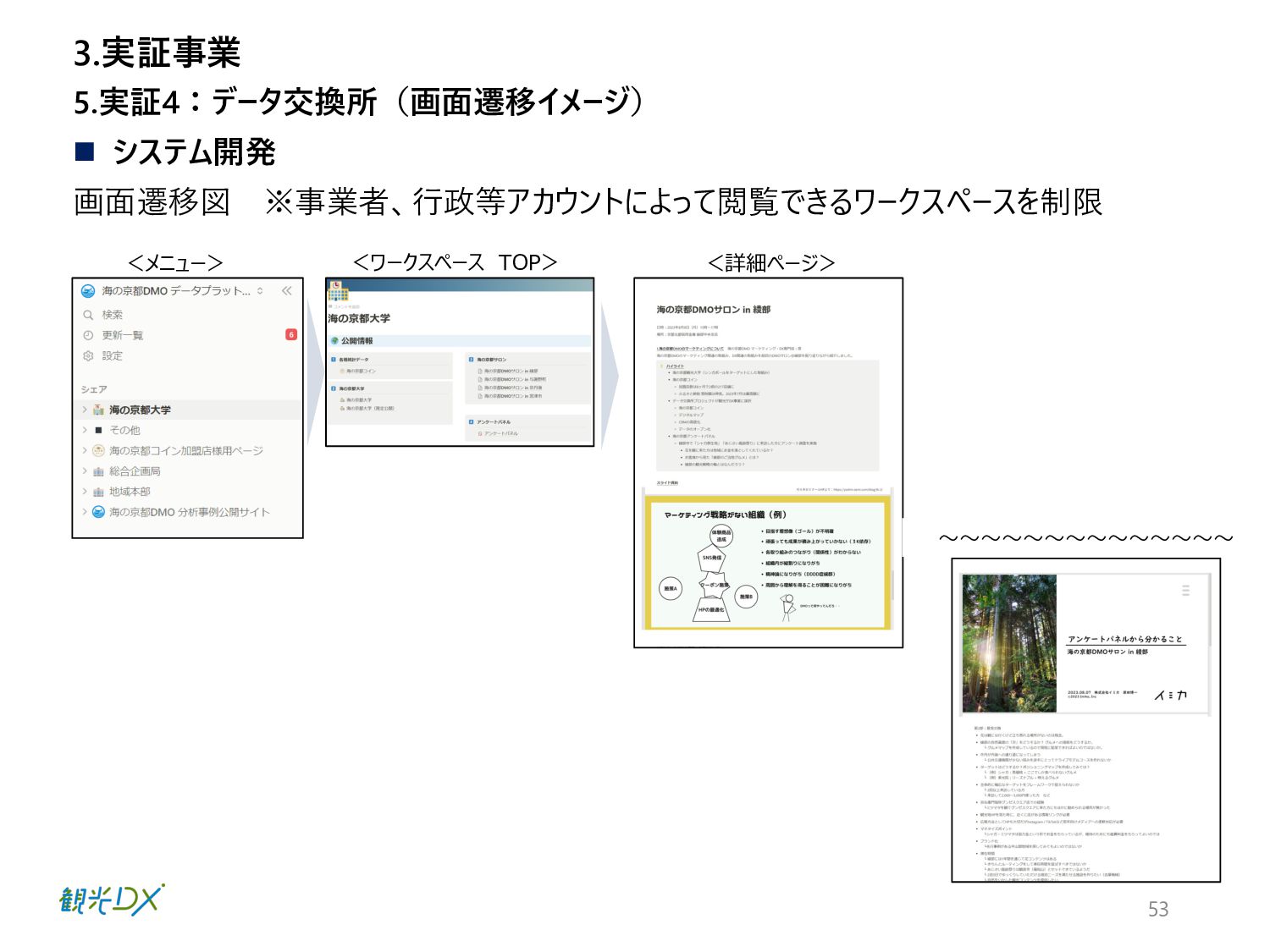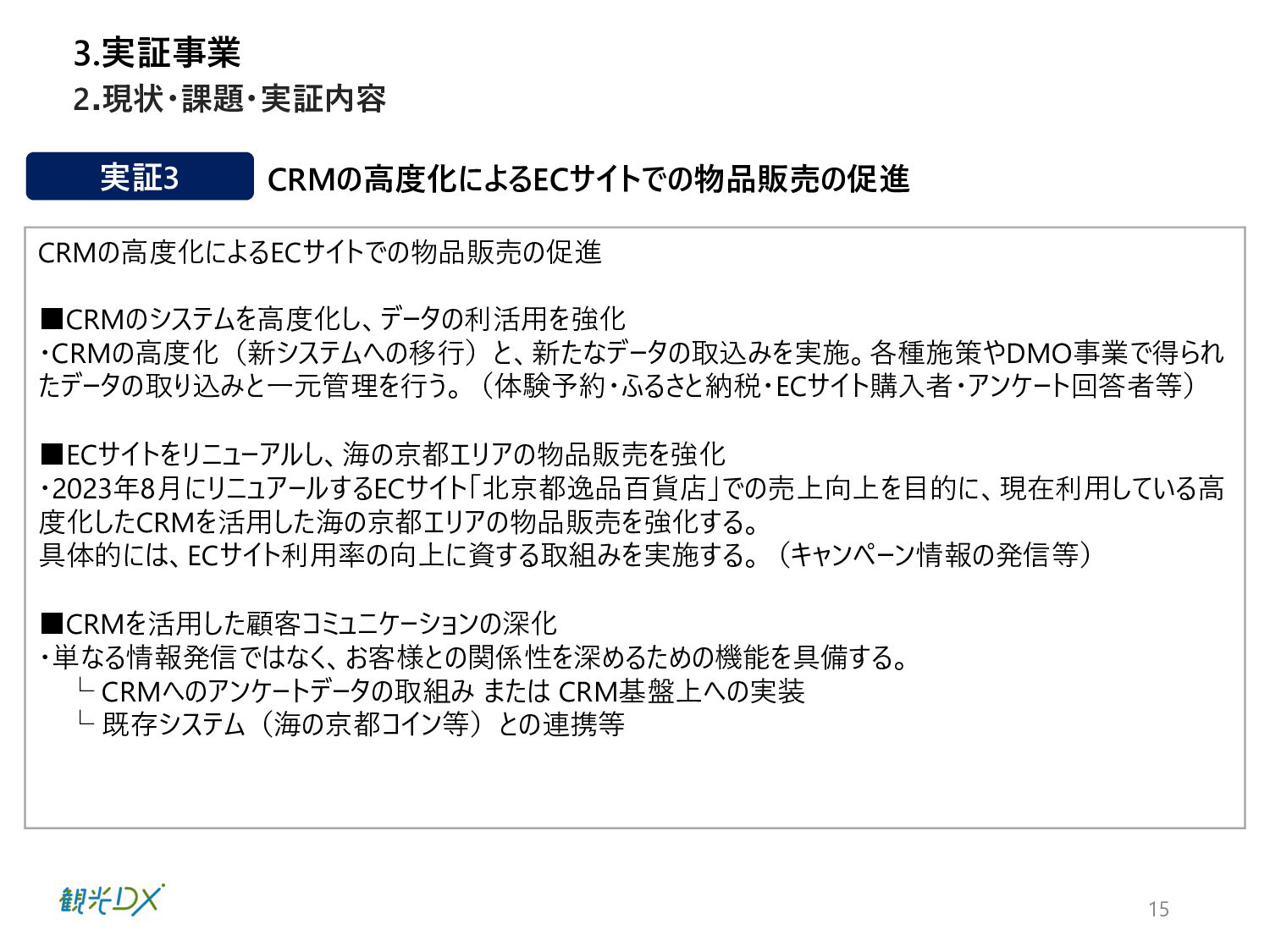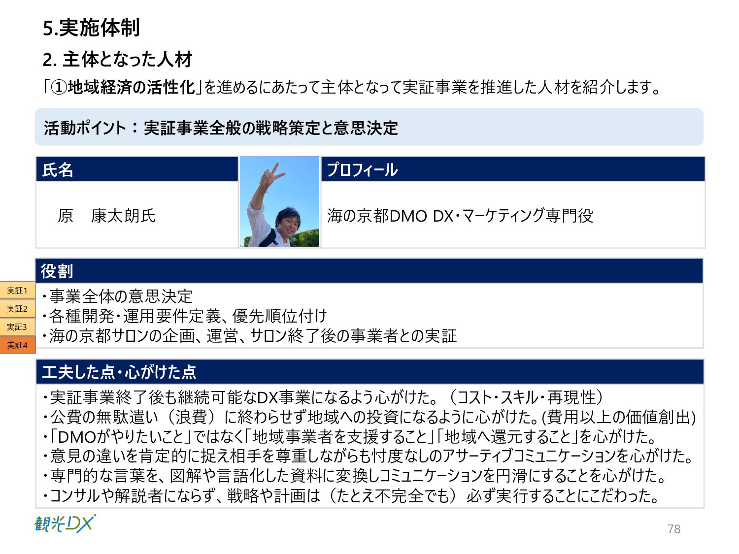 \10,765,000 1695% 宮津市 \250,000 \5,030,000 2012% 伊根町 \930,000 \3,605,000 388% ビジネス客中⼼エリア 舞鶴市 \615,000 \950,000 154% 福知⼭市 \40,000 \400,000 1000% 宿泊施設少数エリア 与謝野町 \145,000 \280,000 193% 綾部市 \40,000 \70,000 175% 33 4.実証1:海の京都コインのモデル店舗づくり 3.実証事業 【考察②】7⾃治体のふるさと納税寄附について 海の京都を構成する7⾃治体の、海の京都コインを返礼品にしたふるさと納税額を実証事業前後で⽐較した。 寄附⾦額については全ての⾃治体で寄附額がアップした結果となった。 しかし、最多寄附額の⾃治体(1076.5万円)と最⼩寄附額の⾃治体(7万円)との間には100倍以上の差がある。 海の京都の中でも、⾼級宿泊施設等の事業者数が多い観光成熟エリア(京丹後市・宮津市・伊根町)、ビジネス客中 ⼼エリア(舞鶴市・福知⼭市)、宿泊施設少数エリア(与謝野町・綾部市)等の各地域の観光特性と「観光をフック にしたふるさと納税」との相性が影響しているものと思われる。 本事業中のアプローチは観光成熟エリアに特に効果があったと考えられ、各地域の観光特性にあわせた戦略を検討する余 地がある。また、海の京都以外で同様の取り組みを検討する際にも予め地域の観光特性を考慮することが重要と考える。 海の京都コインを返礼品としたふるさと納税_⾃治体別寄附額(実証事業期間中の寄附額 降順)