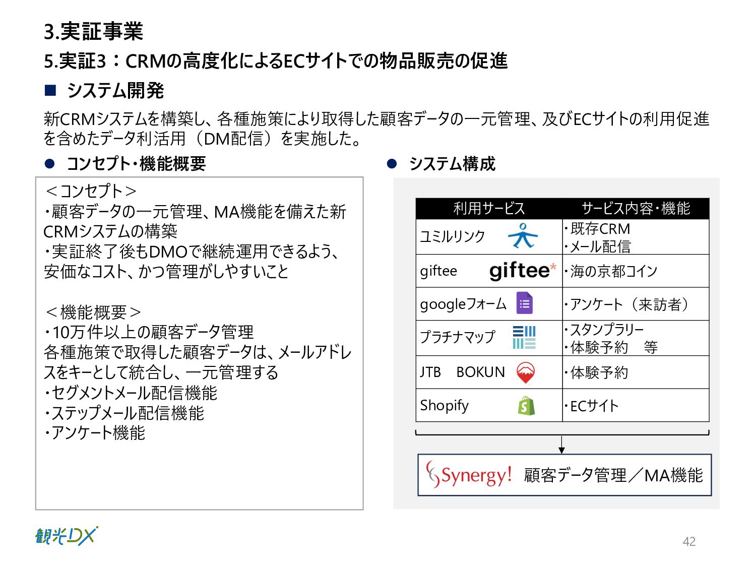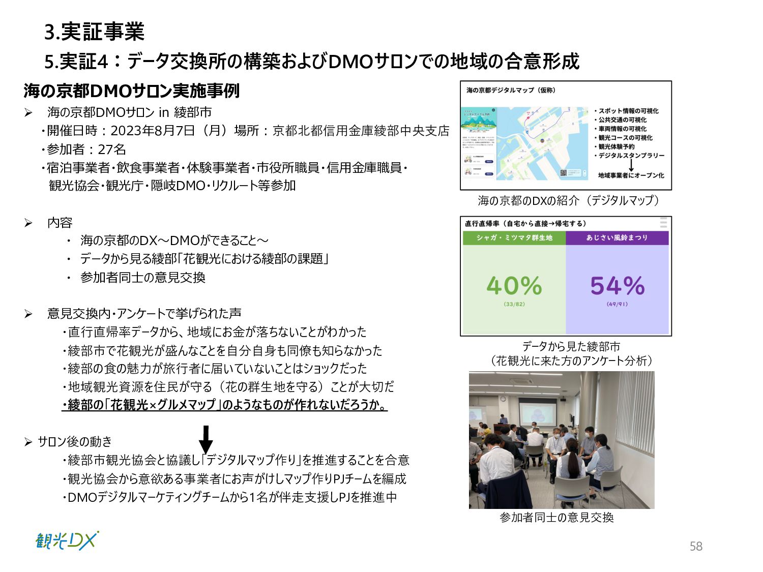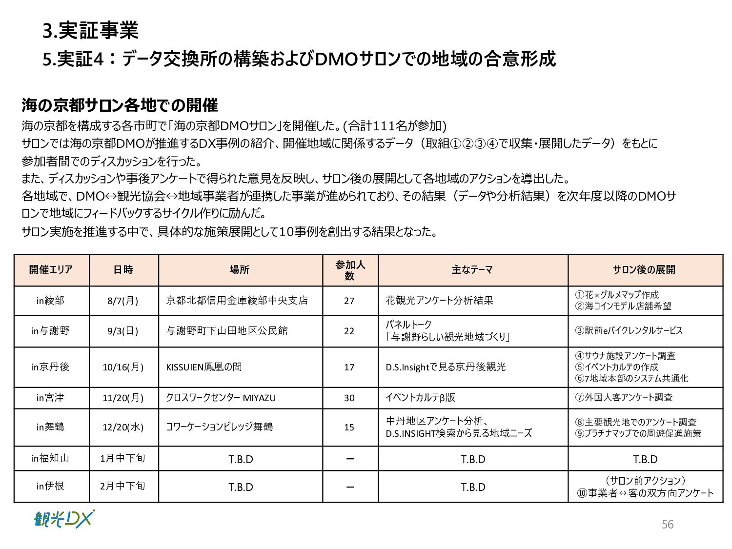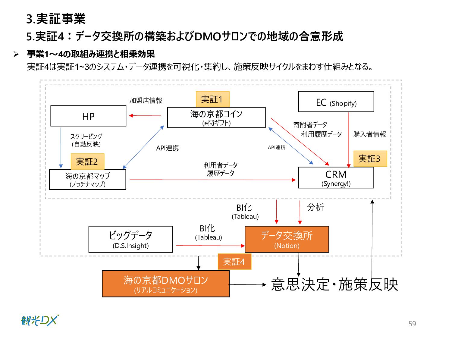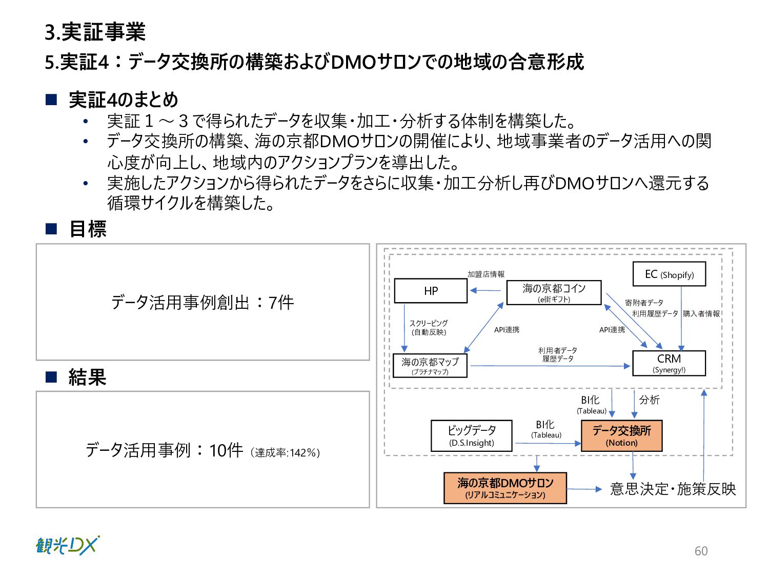 \10,765,000 1695% 宮津市 \250,000 \5,030,000 2012% 伊根町 \930,000 \3,605,000 388% ビジネス客中⼼エリア 舞鶴市 \615,000 \950,000 154% 福知⼭市 \40,000 \400,000 1000% 宿泊施設少数エリア 与謝野町 \145,000 \280,000 193% 綾部市 \40,000 \70,000 175% 33 4.実証1:海の京都コインのモデル店舗づくり 3.実証事業 【考察②】7⾃治体のふるさと納税寄附について 海の京都を構成する7⾃治体の、海の京都コインを返礼品にしたふるさと納税額を実証事業前後で⽐較した。 寄附⾦額については全ての⾃治体で寄附額がアップした結果となった。 しかし、最多寄附額の⾃治体(1076.5万円)と最⼩寄附額の⾃治体(7万円)との間には100倍以上の差がある。 海の京都の中でも、⾼級宿泊施設等の事業者数が多い観光成熟エリア(京丹後市・宮津市・伊根町)、ビジネス客中 ⼼エリア(舞鶴市・福知⼭市)、宿泊施設少数エリア(与謝野町・綾部市)等の各地域の観光特性と「観光をフック にしたふるさと納税」との相性が影響しているものと思われる。 本事業中のアプローチは観光成熟エリアに特に効果があったと考えられ、各地域の観光特性にあわせた戦略を検討する余 地がある。また、海の京都以外で同様の取り組みを検討する際にも予め地域の観光特性を考慮することが重要と考える。 海の京都コインを返礼品としたふるさと納税_⾃治体別寄附額(実証事業期間中の寄附額 降順)