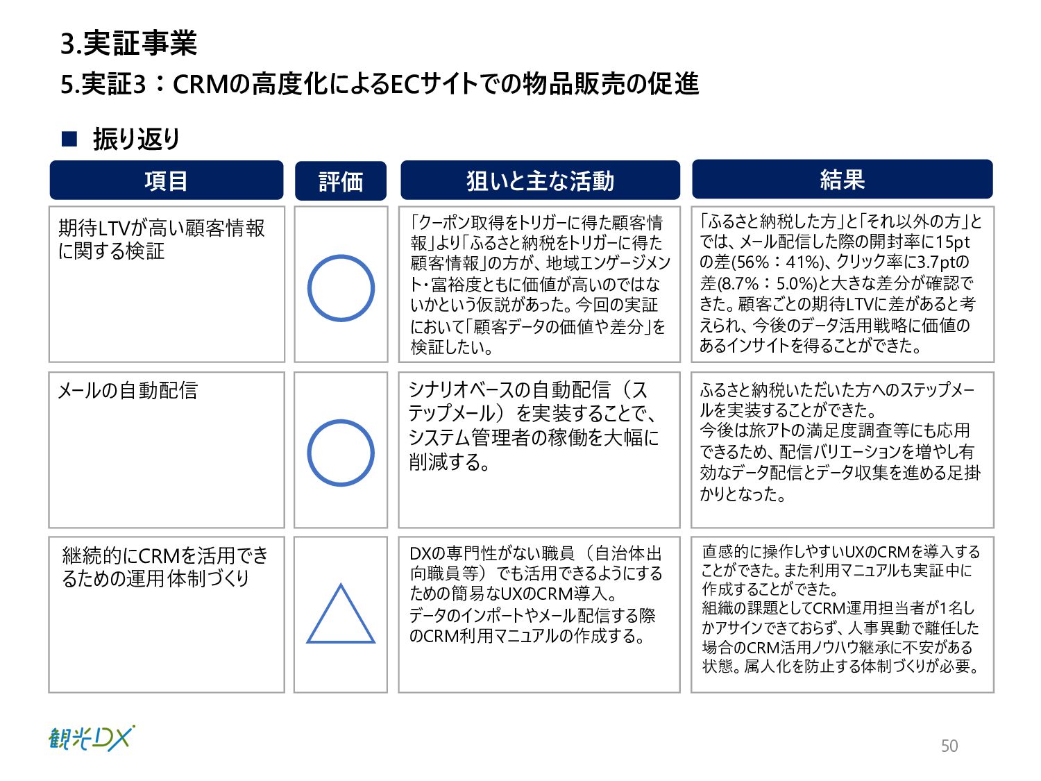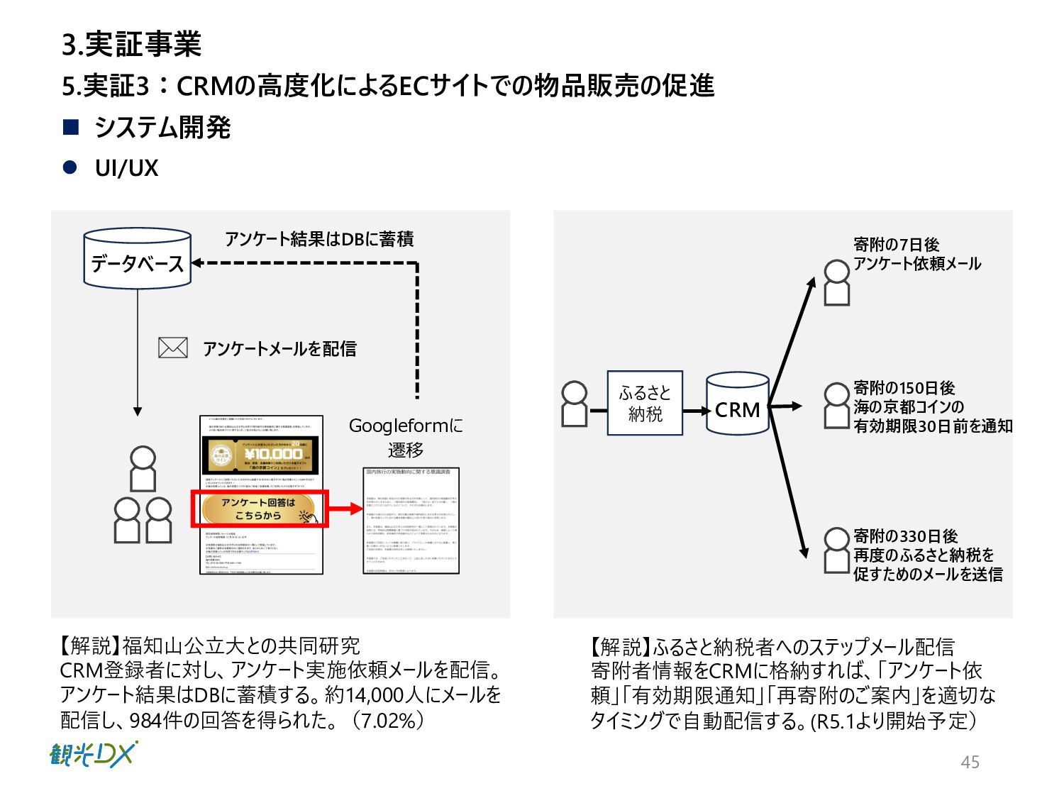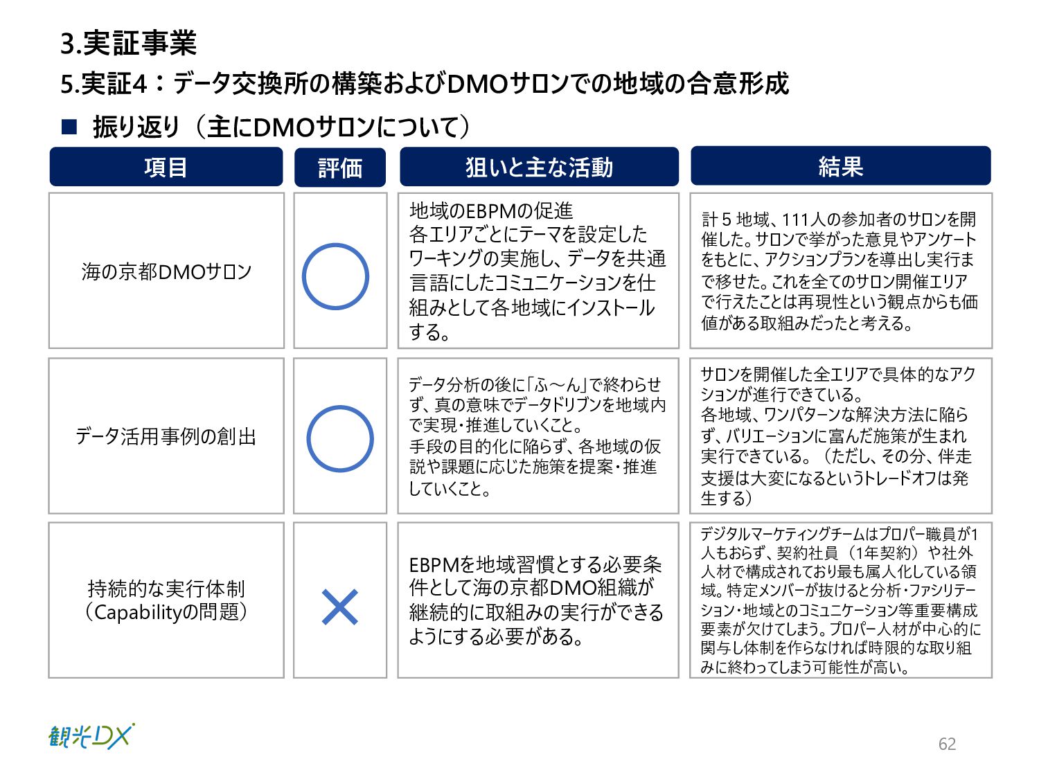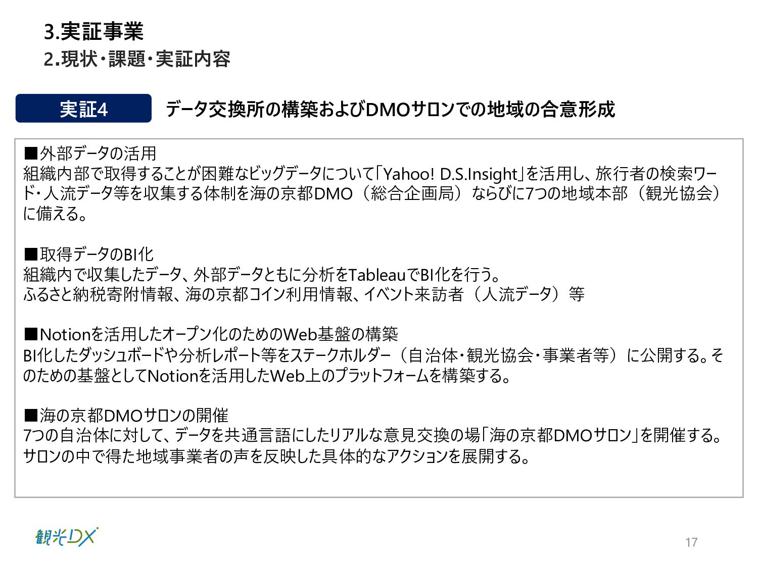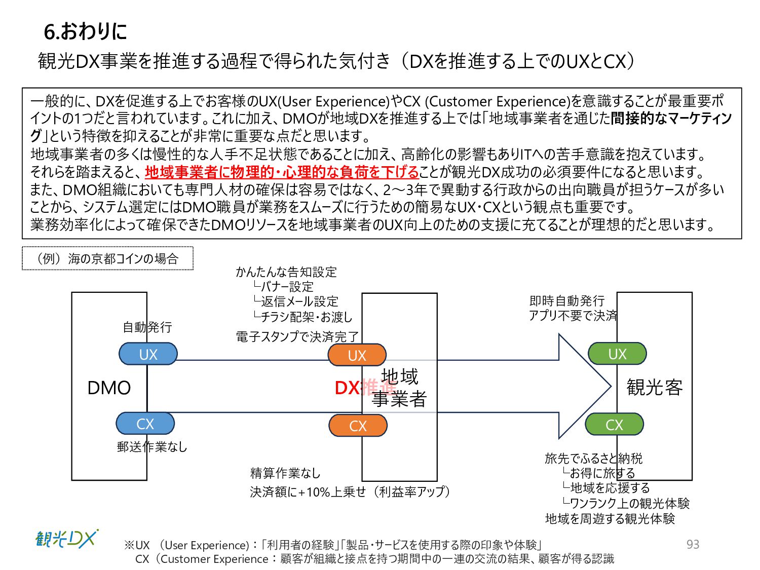\10,765,000 1695% 宮津市 \250,000 \5,030,000 2012% 伊根町 \930,000 \3,605,000 388% ビジネス客中⼼エリア 舞鶴市 \615,000 \950,000 154% 福知⼭市 \40,000 \400,000 1000% 宿泊施設少数エリア 与謝野町 \145,000 \280,000 193% 綾部市 \40,000 \70,000 175% 33 4.実証1:海の京都コインのモデル店舗づくり 3.実証事業 【考察②】7⾃治体のふるさと納税寄附について 海の京都を構成する7⾃治体の、海の京都コインを返礼品にしたふるさと納税額を実証事業前後で⽐較した。 寄附⾦額については全ての⾃治体で寄附額がアップした結果となった。 しかし、最多寄附額の⾃治体(1076.5万円)と最⼩寄附額の⾃治体(7万円)との間には100倍以上の差がある。 海の京都の中でも、⾼級宿泊施設等の事業者数が多い観光成熟エリア(京丹後市・宮津市・伊根町)、ビジネス客中 ⼼エリア(舞鶴市・福知⼭市)、宿泊施設少数エリア(与謝野町・綾部市)等の各地域の観光特性と「観光をフック にしたふるさと納税」との相性が影響しているものと思われる。 本事業中のアプローチは観光成熟エリアに特に効果があったと考えられ、各地域の観光特性にあわせた戦略を検討する余 地がある。また、海の京都以外で同様の取り組みを検討する際にも予め地域の観光特性を考慮することが重要と考える。 海の京都コインを返礼品としたふるさと納税_⾃治体別寄附額(実証事業期間中の寄附額 降順)