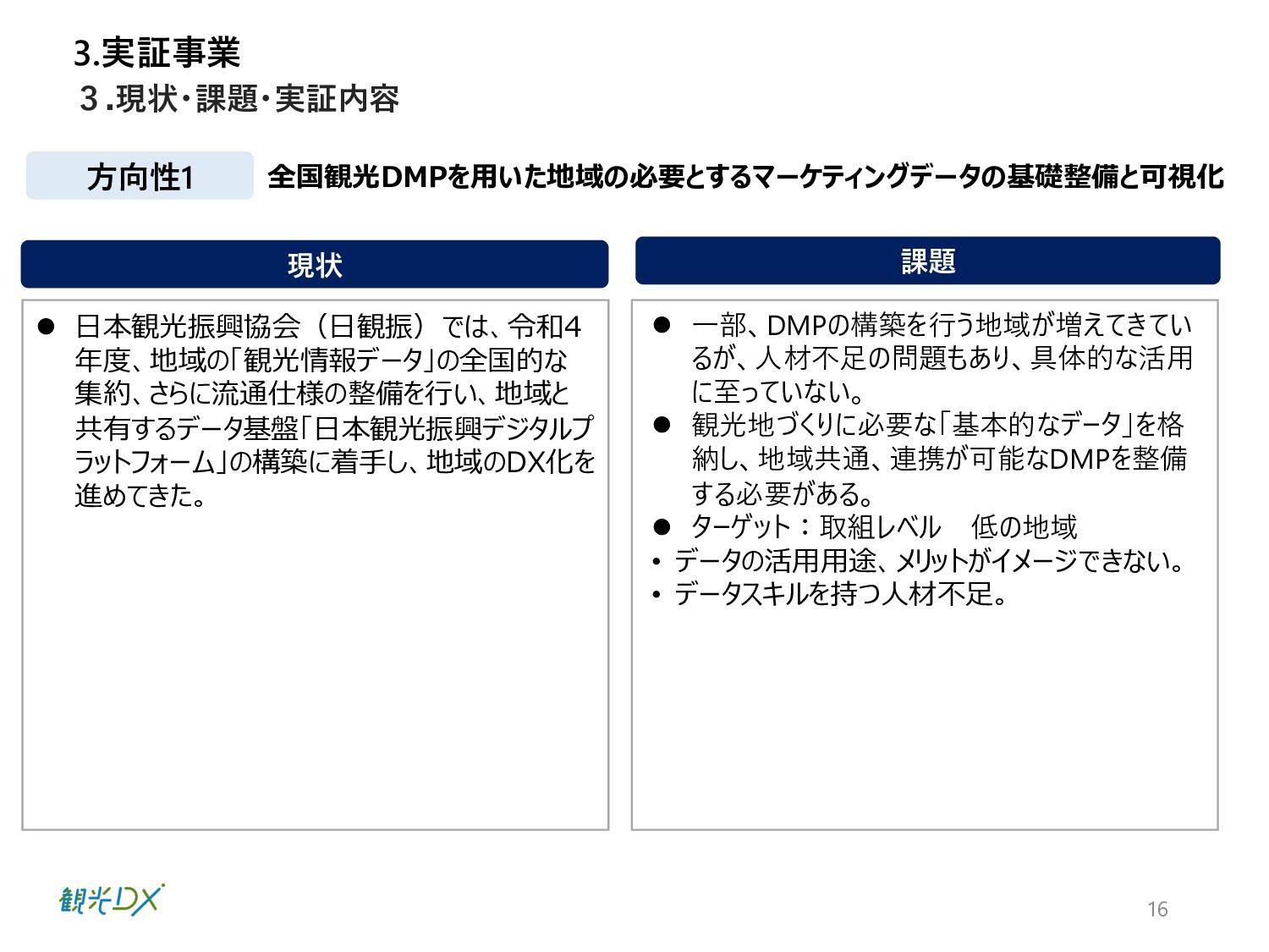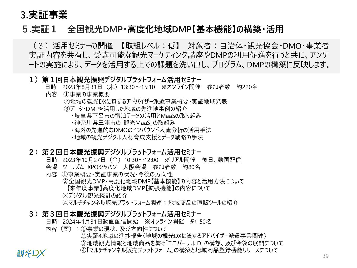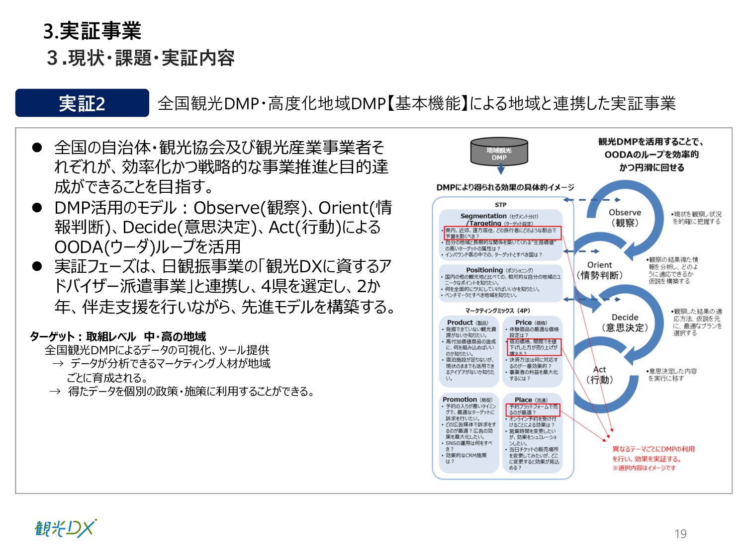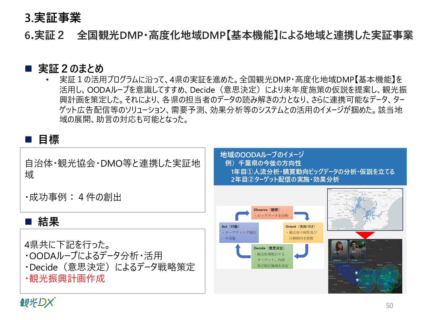 ⾴ 実証1 P.42 ⾃治体・観光協会・DMO等と連携し た実証地域 ・成功事例:4件の創出 全国観光DMP・⾼度化地域DMP【基本 機能】による地域と連携した実証事業 実証2 P.50 ⽬標値 成果 KGI 4.総括 DMPの活⽤により、データ活⽤の取組レベルの向上を図った。 1.成果 n 実証事業の総括 【実証1】KGI ・⾃治体数:2都道府県74市町村 10⽉末の⾃治体・観光協会へDMPのリリース後、活⽤した14府県36市町村がデータ確認・⽐較等具体的な活⽤に⾄った。 なお、全国の1741の市区町村に都道府県と同様に案内したが、参加率は低く、KGI達成へ⾄らなかった。⼀⽅、都道府県の活⽤ が14と意識が⾼く、DMPを把握し、管轄の市町村にも共有したいとの声が多かったことらから、来年度以降、都道府県・都道府県 観光協会、当協会8⽀部と連携した定期的なセミナーを開催予定。また、DMPのWebサイトアクセス動向分析の3ヶ⽉間の結果は ユーザー518名、3643PV、⼀回当たり7PV、平均滞在時間2分34秒と⻑めの結果となったことから、地域のデータ活⽤に繋がった。 【実証1】KGI・活⽤セミナーの開催 450⼈、27道府県131市町村の参加を頂き、3回のアンケート結果から、必要なデータ・ソリューションの問いには、把握が進み、 ⼈流・購買データ分析による ターゲット広告配信や宿泊施設の需要予測、産業連関表におる経済波及効果等具体的な施策 希望が増えた。その他、勉強会やワークショップに参加した地域数 21都道府県・22市町村 【実証2】成功事例:4件の創出 4県はDMPを活⽤し、OODAループのDecide(意思決定)により来年度施策の仮説を提案し、観光振興計画を策定した。各県 の担当者がObserve(データ観察)→Oriento(情報判断)→Decide(意思決定)から、連携可能なソリューションを活⽤し たイメージが掴めるようになり、4県共に観光振興計画の作成に⾄った。 全国観光DMPを活⽤した都道府県:2都道府県・74市町村 地域の観光事業計画や個別のマーケ ティング戦略・施策等の策定に際し、 DMPの活⽤ ・⾃治体数:2都道府県74市町村 ・活⽤セミナーの開催:3回 KPI 全国観光DMP・度化地域DMP【基本機 能】の構築・活⽤ 4件の創出 群⾺県・埼⽟県・千葉県・⻑崎県 ・OODAループの実現 ・観光振興計画作成