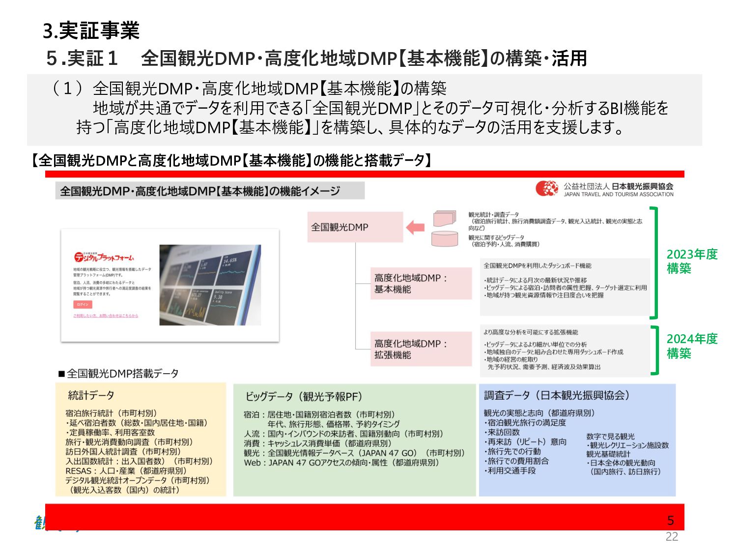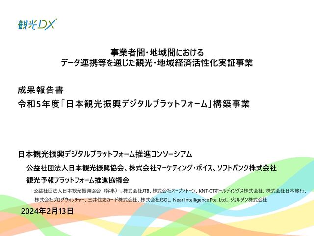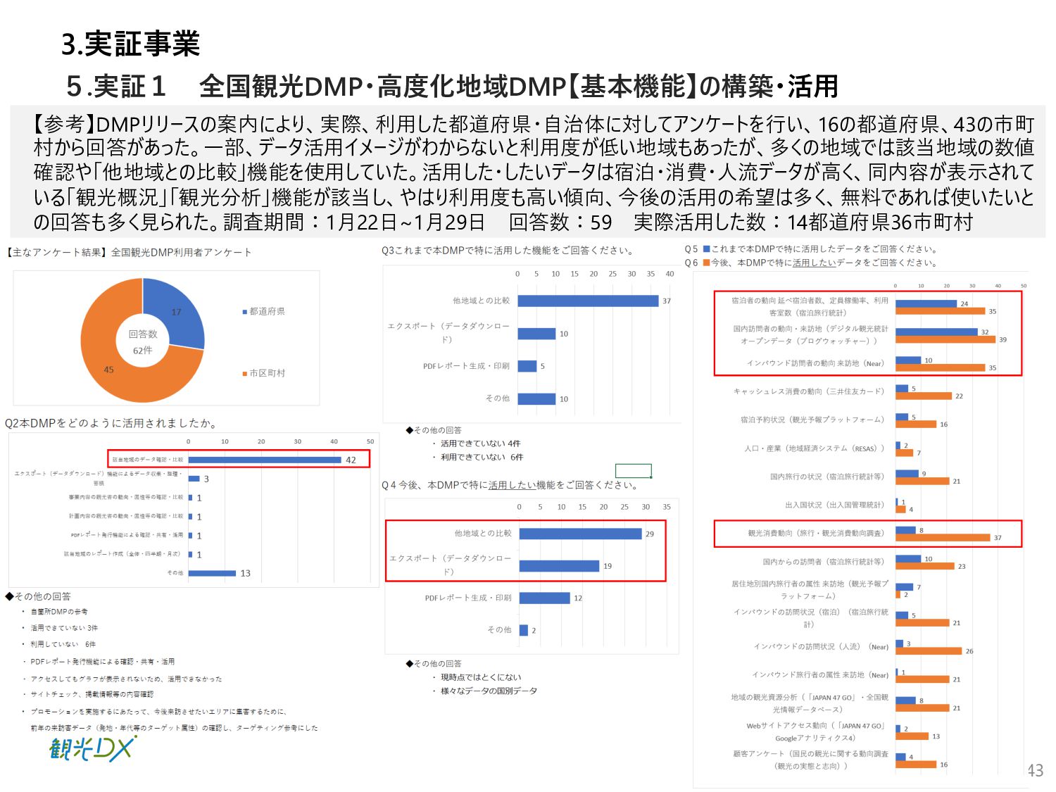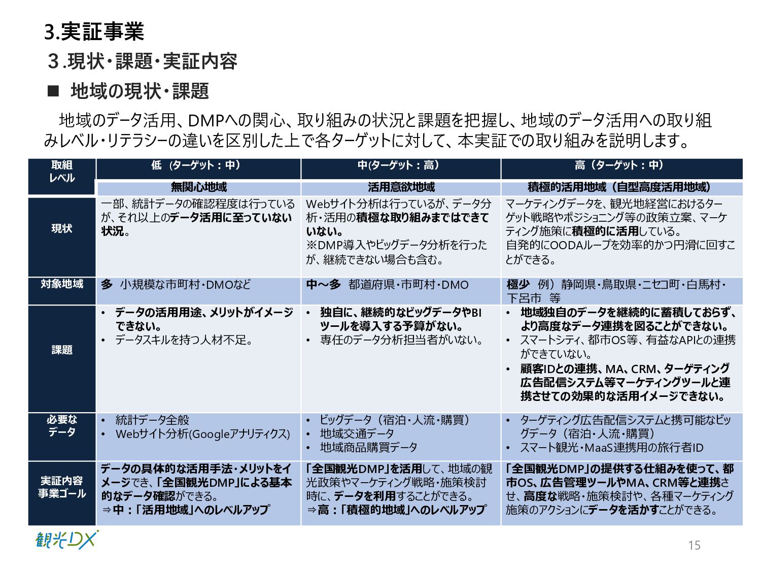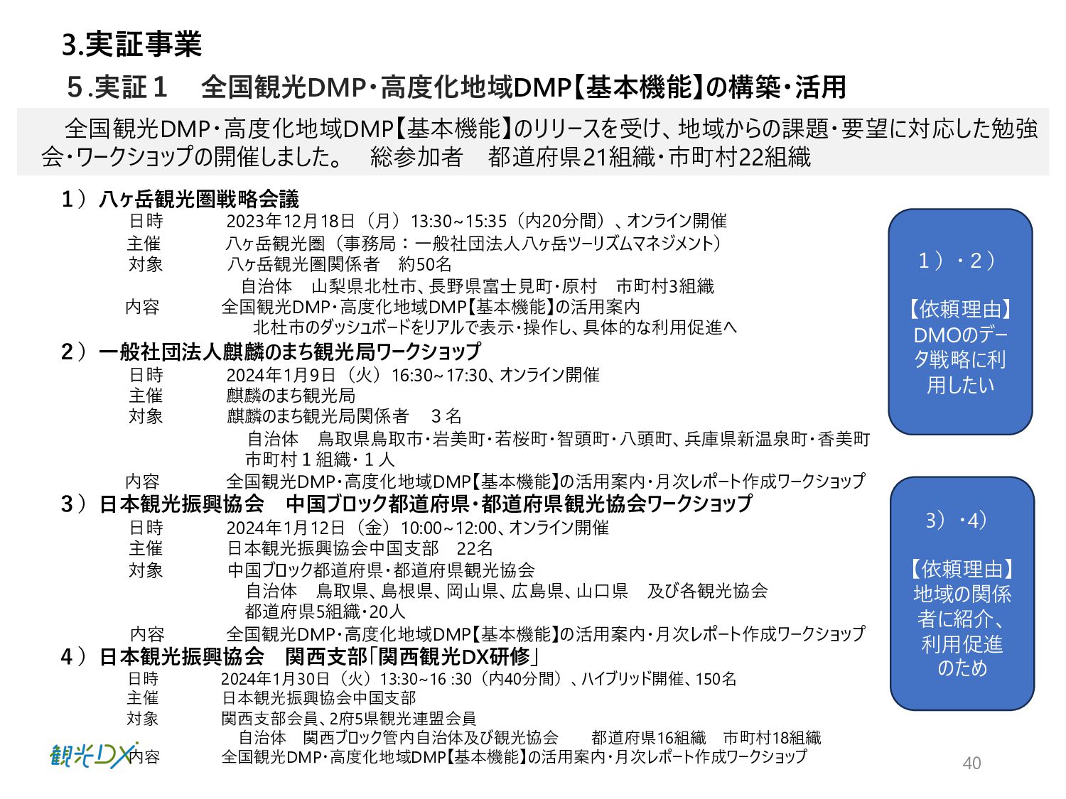 ⾴ 実証1 P.42 ⾃治体・観光協会・DMO等と連携し た実証地域 ・成功事例:4件の創出 全国観光DMP・⾼度化地域DMP【基本 機能】による地域と連携した実証事業 実証2 P.50 ⽬標値 成果 KGI 4.総括 DMPの活⽤により、データ活⽤の取組レベルの向上を図った。 1.成果 n 実証事業の総括 【実証1】KGI ・⾃治体数:2都道府県74市町村 10⽉末の⾃治体・観光協会へDMPのリリース後、活⽤した14府県36市町村がデータ確認・⽐較等具体的な活⽤に⾄った。 なお、全国の1741の市区町村に都道府県と同様に案内したが、参加率は低く、KGI達成へ⾄らなかった。⼀⽅、都道府県の活⽤ が14と意識が⾼く、DMPを把握し、管轄の市町村にも共有したいとの声が多かったことらから、来年度以降、都道府県・都道府県 観光協会、当協会8⽀部と連携した定期的なセミナーを開催予定。また、DMPのWebサイトアクセス動向分析の3ヶ⽉間の結果は ユーザー518名、3643PV、⼀回当たり7PV、平均滞在時間2分34秒と⻑めの結果となったことから、地域のデータ活⽤に繋がった。 【実証1】KGI・活⽤セミナーの開催 450⼈、27道府県131市町村の参加を頂き、3回のアンケート結果から、必要なデータ・ソリューションの問いには、把握が進み、 ⼈流・購買データ分析による ターゲット広告配信や宿泊施設の需要予測、産業連関表におる経済波及効果等具体的な施策 希望が増えた。その他、勉強会やワークショップに参加した地域数 21都道府県・22市町村 【実証2】成功事例:4件の創出 4県はDMPを活⽤し、OODAループのDecide(意思決定)により来年度施策の仮説を提案し、観光振興計画を策定した。各県 の担当者がObserve(データ観察)→Oriento(情報判断)→Decide(意思決定)から、連携可能なソリューションを活⽤し たイメージが掴めるようになり、4県共に観光振興計画の作成に⾄った。 全国観光DMPを活⽤した都道府県:2都道府県・74市町村 地域の観光事業計画や個別のマーケ ティング戦略・施策等の策定に際し、 DMPの活⽤ ・⾃治体数:2都道府県74市町村 ・活⽤セミナーの開催:3回 KPI 全国観光DMP・度化地域DMP【基本機 能】の構築・活⽤ 4件の創出 群⾺県・埼⽟県・千葉県・⻑崎県 ・OODAループの実現 ・観光振興計画作成