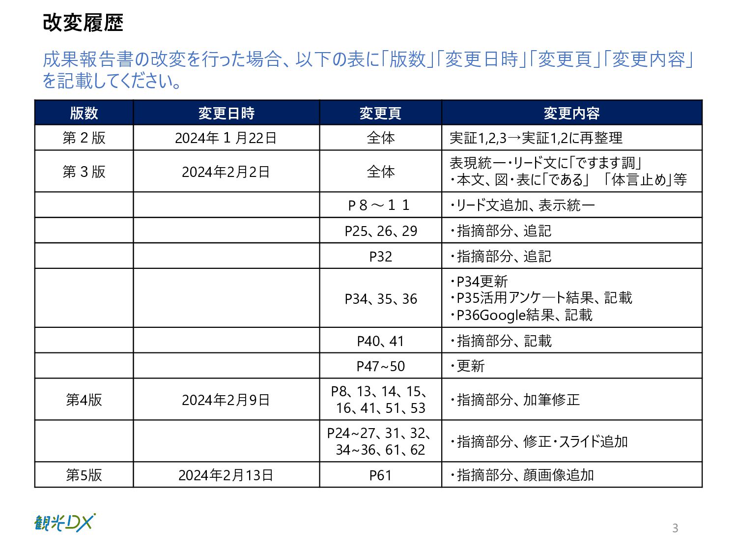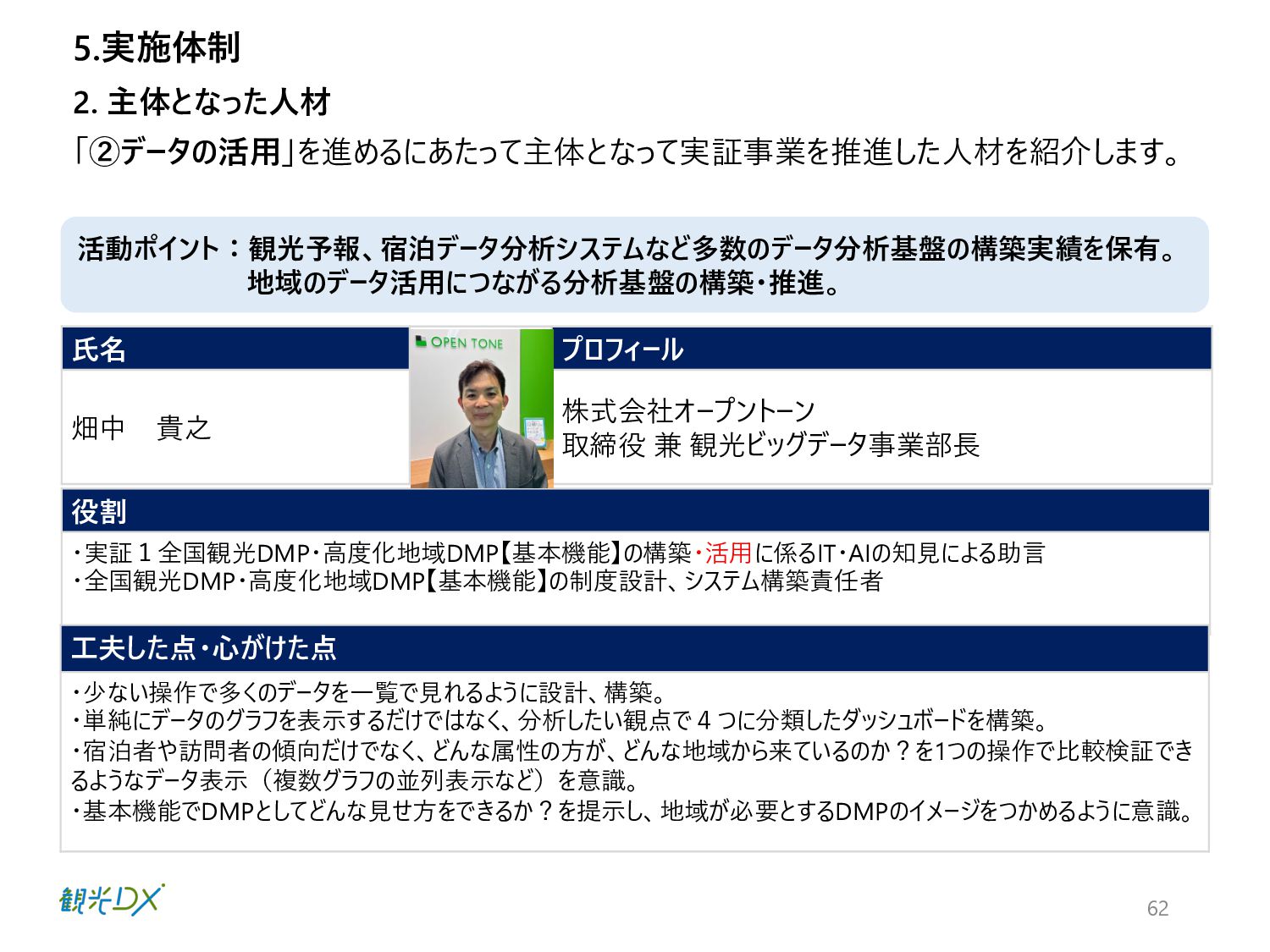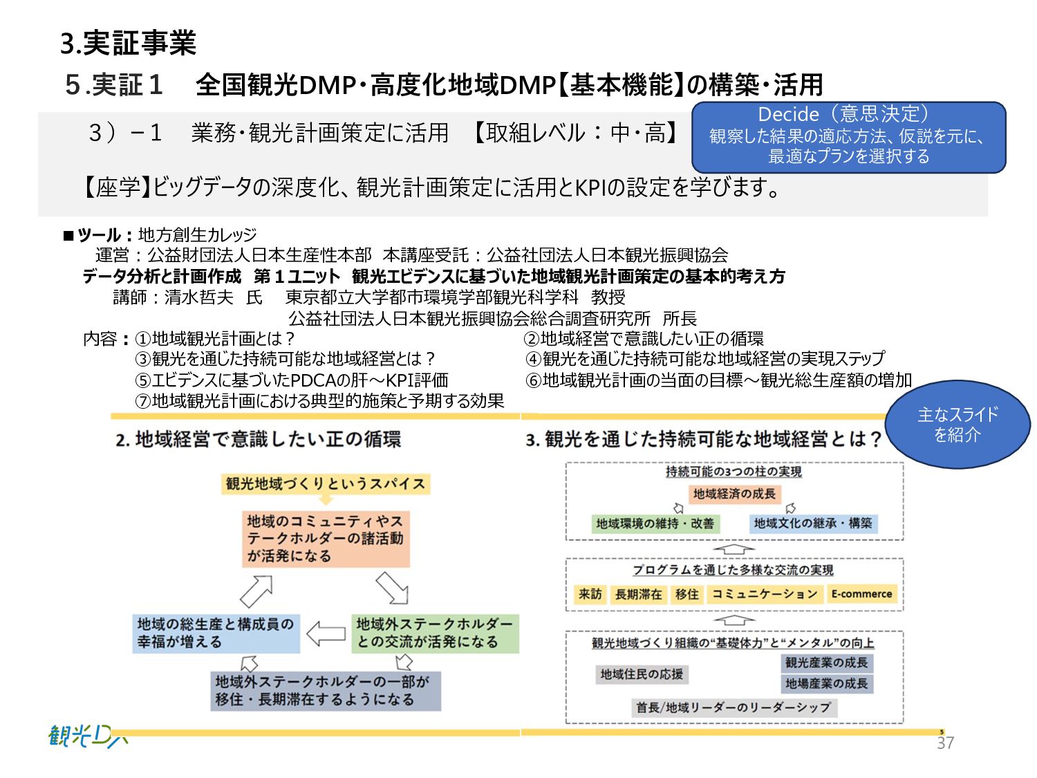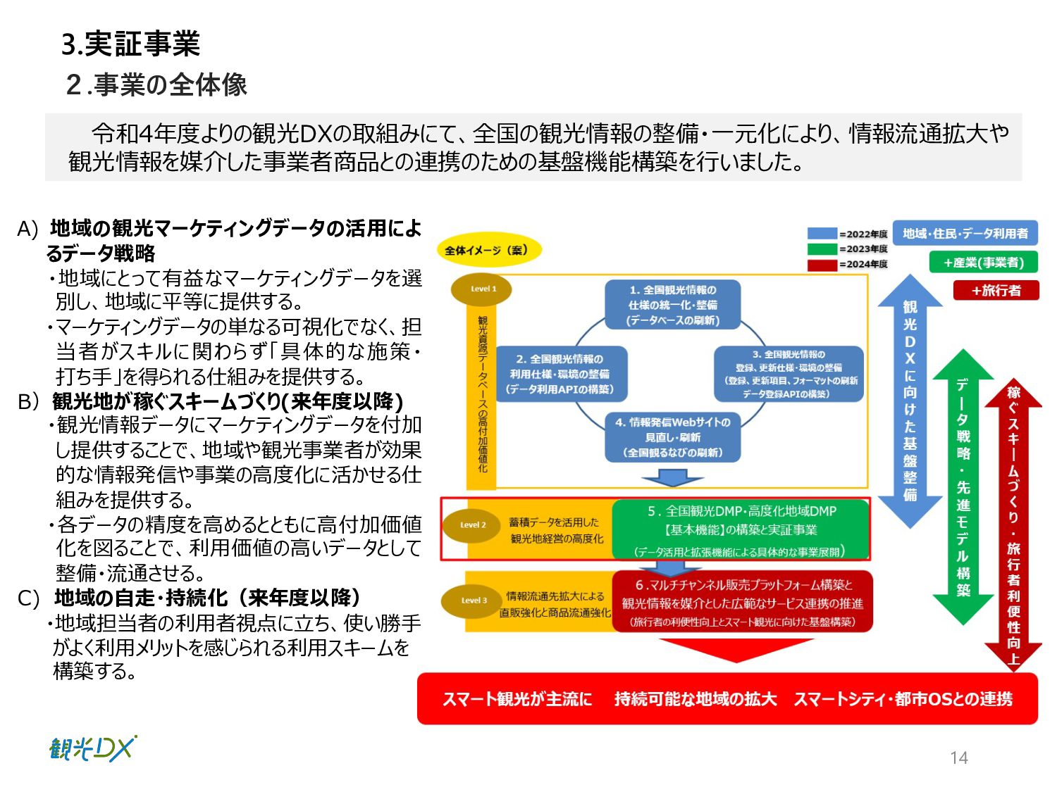 ⾴ 実証1 P.42 ⾃治体・観光協会・DMO等と連携し た実証地域 ・成功事例:4件の創出 全国観光DMP・⾼度化地域DMP【基本 機能】による地域と連携した実証事業 実証2 P.50 ⽬標値 成果 KGI 4.総括 DMPの活⽤により、データ活⽤の取組レベルの向上を図った。 1.成果 n 実証事業の総括 【実証1】KGI ・⾃治体数:2都道府県74市町村 10⽉末の⾃治体・観光協会へDMPのリリース後、活⽤した14府県36市町村がデータ確認・⽐較等具体的な活⽤に⾄った。 なお、全国の1741の市区町村に都道府県と同様に案内したが、参加率は低く、KGI達成へ⾄らなかった。⼀⽅、都道府県の活⽤ が14と意識が⾼く、DMPを把握し、管轄の市町村にも共有したいとの声が多かったことらから、来年度以降、都道府県・都道府県 観光協会、当協会8⽀部と連携した定期的なセミナーを開催予定。また、DMPのWebサイトアクセス動向分析の3ヶ⽉間の結果は ユーザー518名、3643PV、⼀回当たり7PV、平均滞在時間2分34秒と⻑めの結果となったことから、地域のデータ活⽤に繋がった。 【実証1】KGI・活⽤セミナーの開催 450⼈、27道府県131市町村の参加を頂き、3回のアンケート結果から、必要なデータ・ソリューションの問いには、把握が進み、 ⼈流・購買データ分析による ターゲット広告配信や宿泊施設の需要予測、産業連関表におる経済波及効果等具体的な施策 希望が増えた。その他、勉強会やワークショップに参加した地域数 21都道府県・22市町村 【実証2】成功事例:4件の創出 4県はDMPを活⽤し、OODAループのDecide(意思決定)により来年度施策の仮説を提案し、観光振興計画を策定した。各県 の担当者がObserve(データ観察)→Oriento(情報判断)→Decide(意思決定)から、連携可能なソリューションを活⽤し たイメージが掴めるようになり、4県共に観光振興計画の作成に⾄った。 全国観光DMPを活⽤した都道府県:2都道府県・74市町村 地域の観光事業計画や個別のマーケ ティング戦略・施策等の策定に際し、 DMPの活⽤ ・⾃治体数:2都道府県74市町村 ・活⽤セミナーの開催:3回 KPI 全国観光DMP・度化地域DMP【基本機 能】の構築・活⽤ 4件の創出 群⾺県・埼⽟県・千葉県・⻑崎県 ・OODAループの実現 ・観光振興計画作成