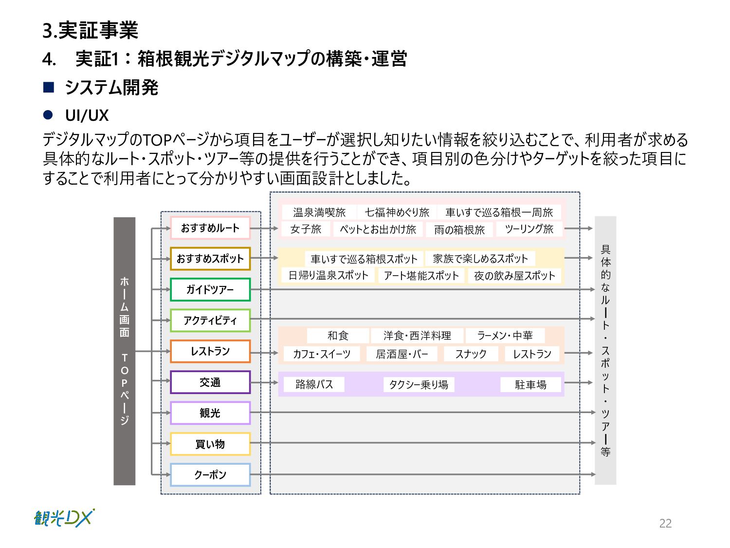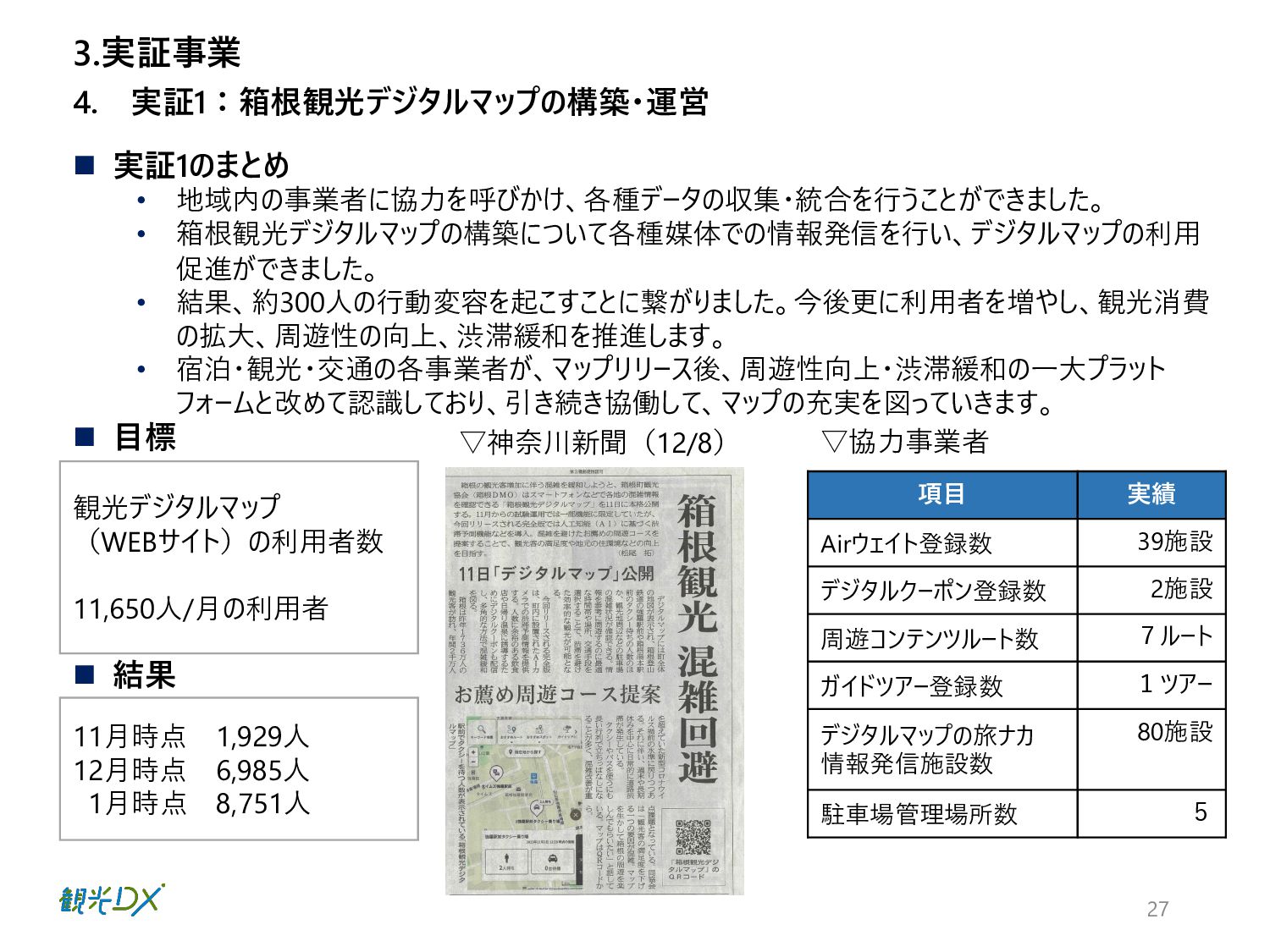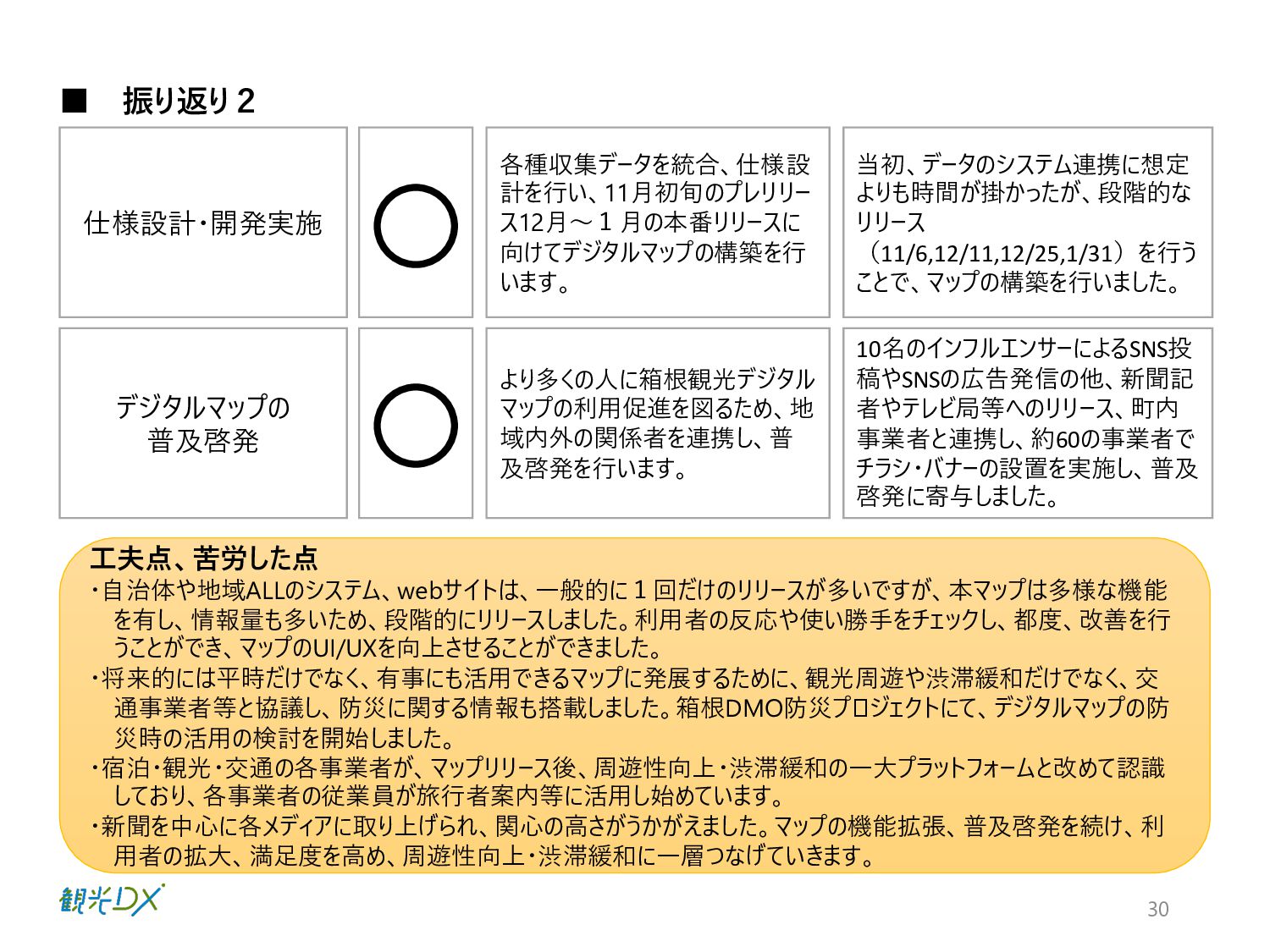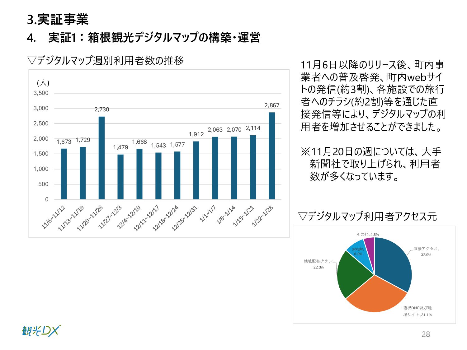 1,543 1,577 1,912 2,063 2,070 2,114 2,867 0 500 1,000 1,500 2,000 2,500 3,000 3,500 (人) 11⽉6⽇以降のリリース後、町内事 業者への普及啓発、町内webサイ トの発信(約3割)、各施設での旅⾏ 者へのチラシ(約2割)等を通じた直 接発信等により、デジタルマップの利 ⽤者を増加させることができました。 ※11⽉20⽇の週については、⼤⼿ 新聞社で取り上げられ、利⽤者 数が多くなっています。 直接アクセス, 32.9% 箱根DMO及び地 域サイト, 31.1% 地域配布チラシ, 22.3% google, 8.9% その他, 4.8% ▽デジタルマップ利⽤者アクセス元