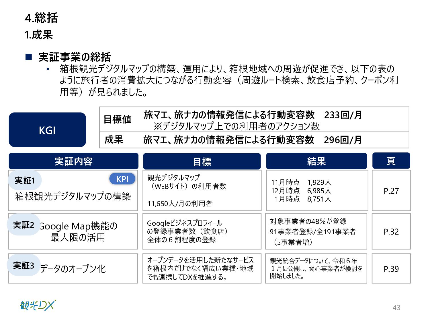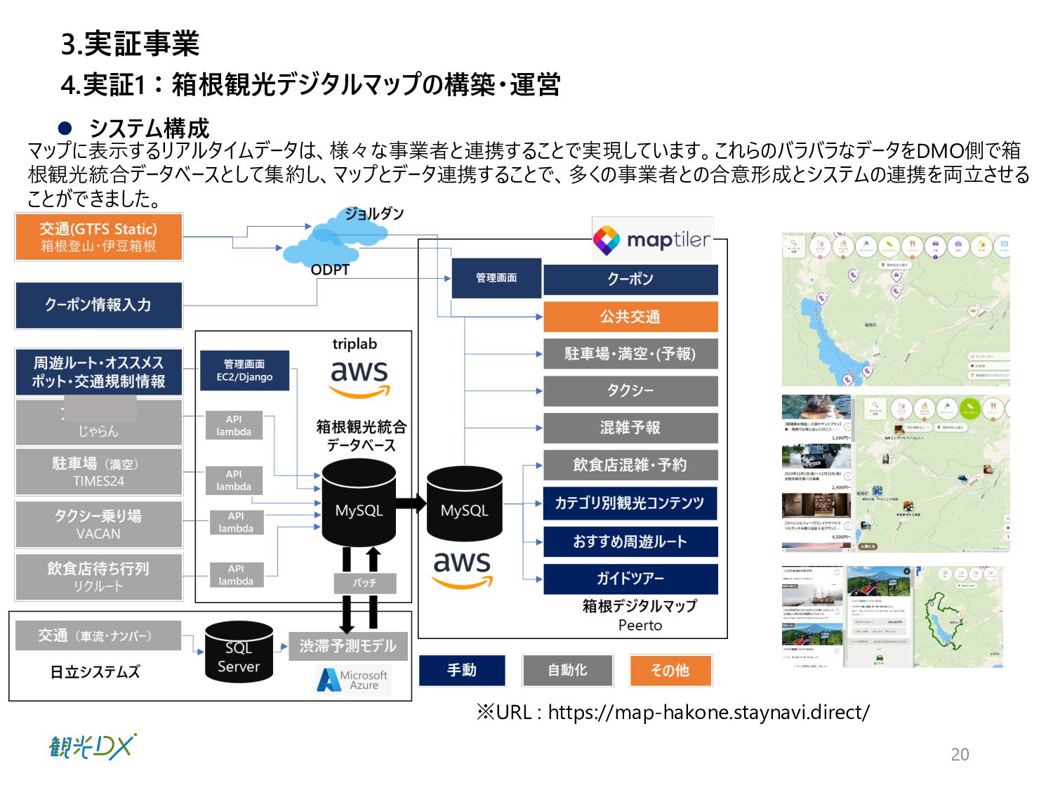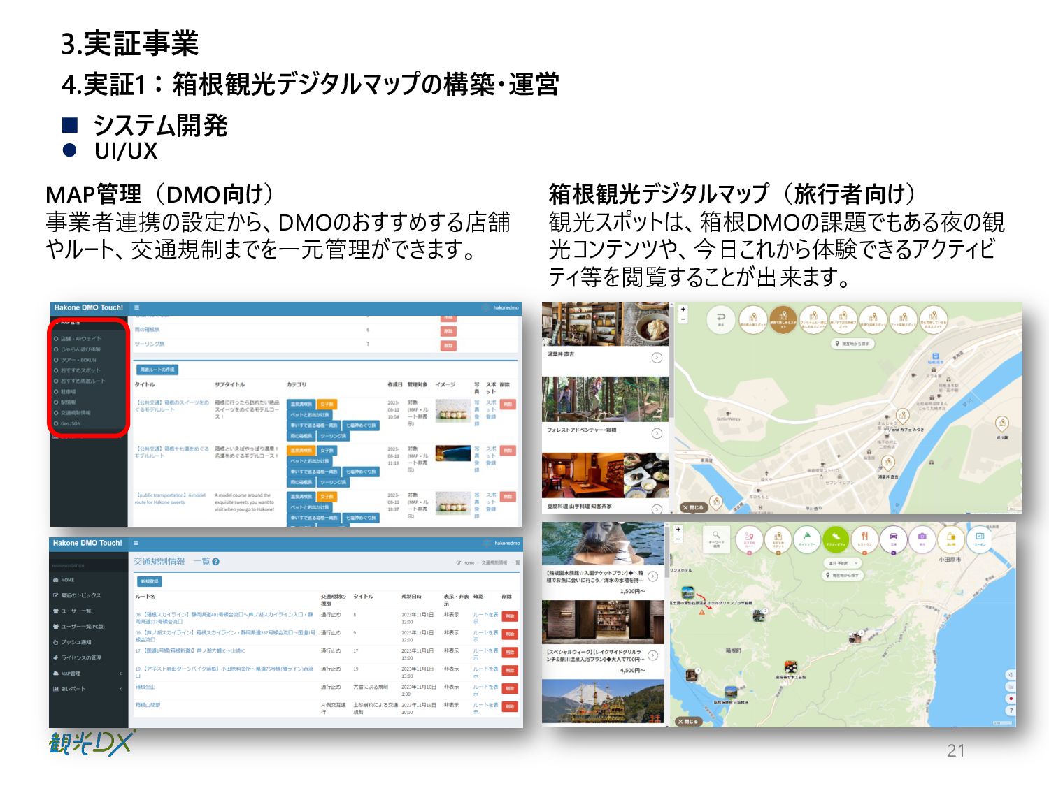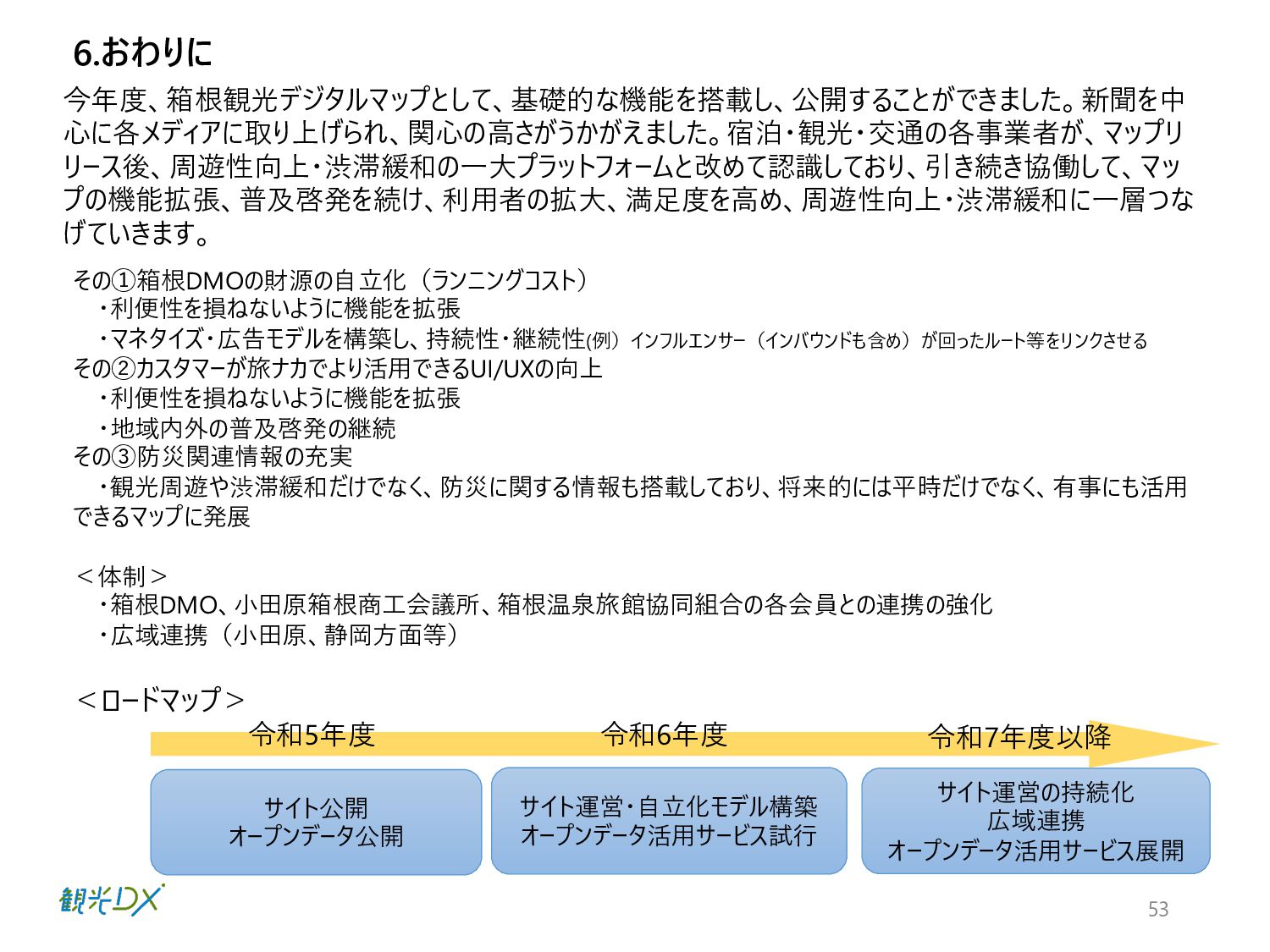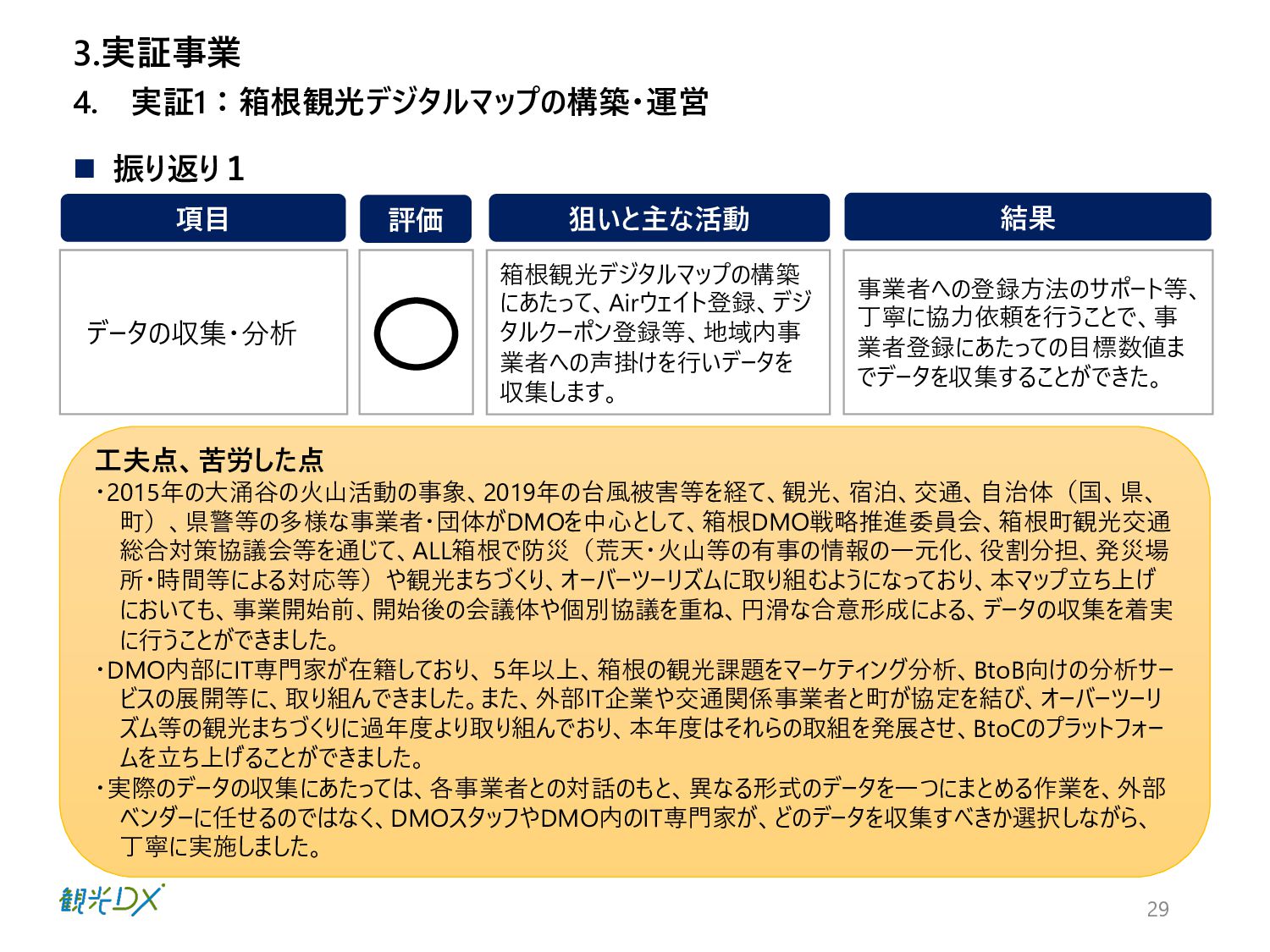1,543 1,577 1,912 2,063 2,070 2,114 2,867 0 500 1,000 1,500 2,000 2,500 3,000 3,500 (人) 11⽉6⽇以降のリリース後、町内事 業者への普及啓発、町内webサイ トの発信(約3割)、各施設での旅⾏ 者へのチラシ(約2割)等を通じた直 接発信等により、デジタルマップの利 ⽤者を増加させることができました。 ※11⽉20⽇の週については、⼤⼿ 新聞社で取り上げられ、利⽤者 数が多くなっています。 直接アクセス, 32.9% 箱根DMO及び地 域サイト, 31.1% 地域配布チラシ, 22.3% google, 8.9% その他, 4.8% ▽デジタルマップ利⽤者アクセス元