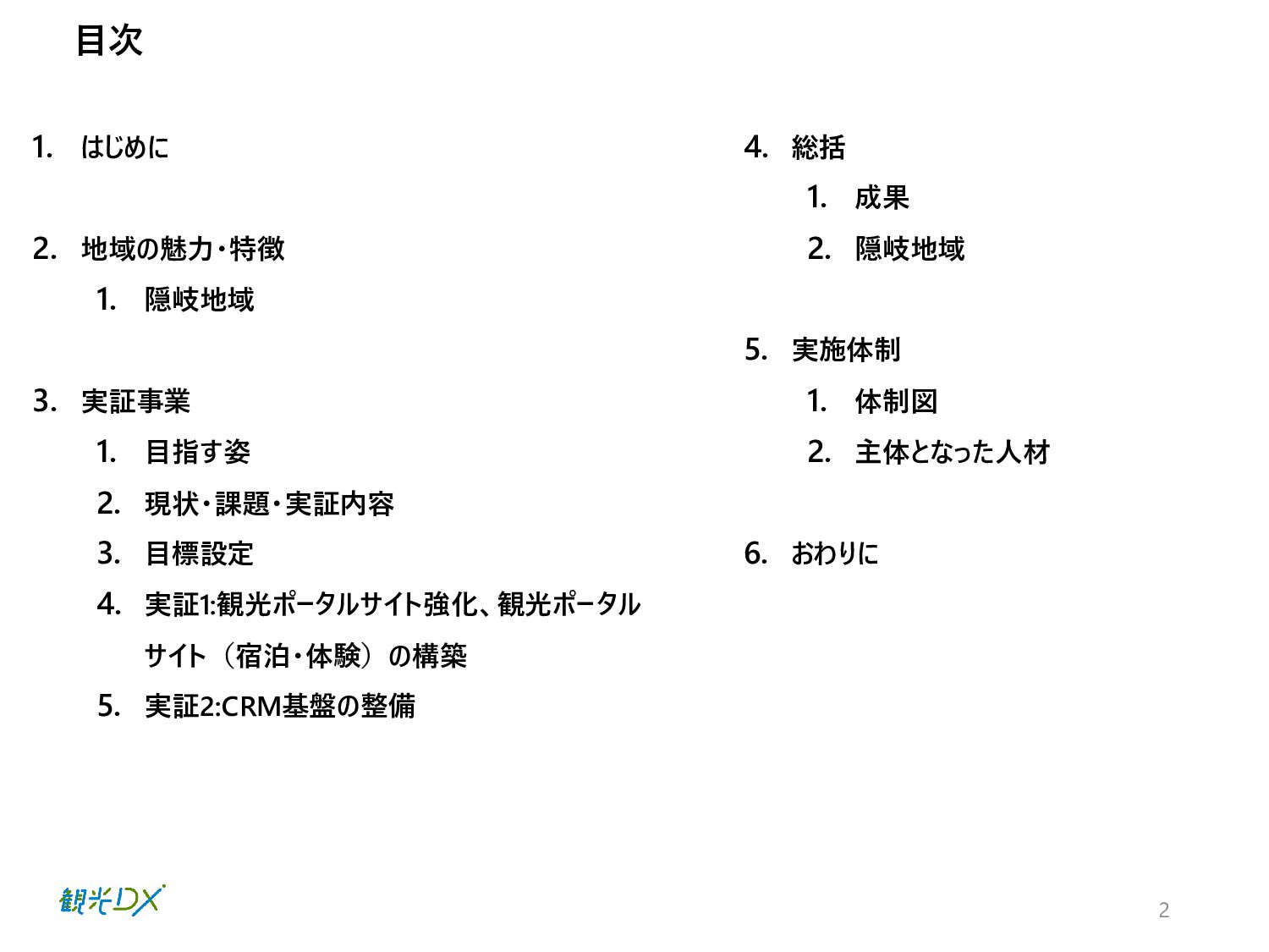 2. 現状・課題・実証内容 3. 目標設定 4. 実証1:観光ポータルサイト強化、観光ポータル サイト(宿泊・体験)の構築 5. 実証2:CRM基盤の整備 4. 総括 1. 成果 2. 隠岐地域 5. 実施体制 1. 体制図 2. 主体となった人材 6. おわりに 2 目次