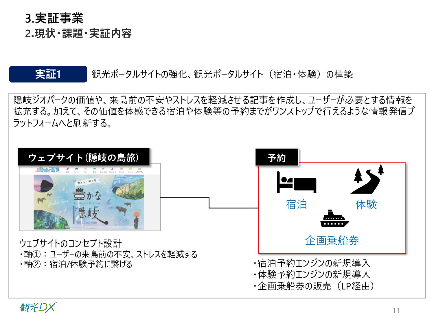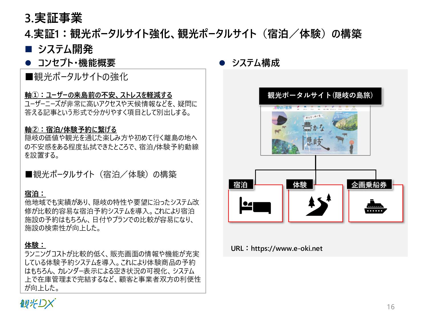 答える記事という形式で分かりやすく項目として別出しする。 軸②:宿泊/体験予約に繋げる 隠岐の価値や観光を通じた楽しみ方や初めて行く離島の地へ の不安感をある程度払拭できたところで、宿泊/体験予約動線 を設置する。 ▪観光ポータルサイト(宿泊/体験)の構築 宿泊: 他地域でも実績があり、隠岐の特性や要望に沿ったシステム改 修が比較的容易な宿泊予約システムを導入。これにより宿泊 施設の予約はもちろん、日付やプランでの比較が容易になり、 施設の検索性が向上した。 体験: ランニングコストが比較的低く、販売画面の情報や機能が充実 している体験予約システムを導入。これにより体験商品の予約 はもちろん、カレンダー表示による空き状況の可視化、システム 上で在庫管理まで完結するなど、顧客と事業者双方の利便性 が向上した。 ◼ システム開発 3.実証事業 宿泊 観光ポータルサイト(隠岐の島旅) 体験 企画乗船券