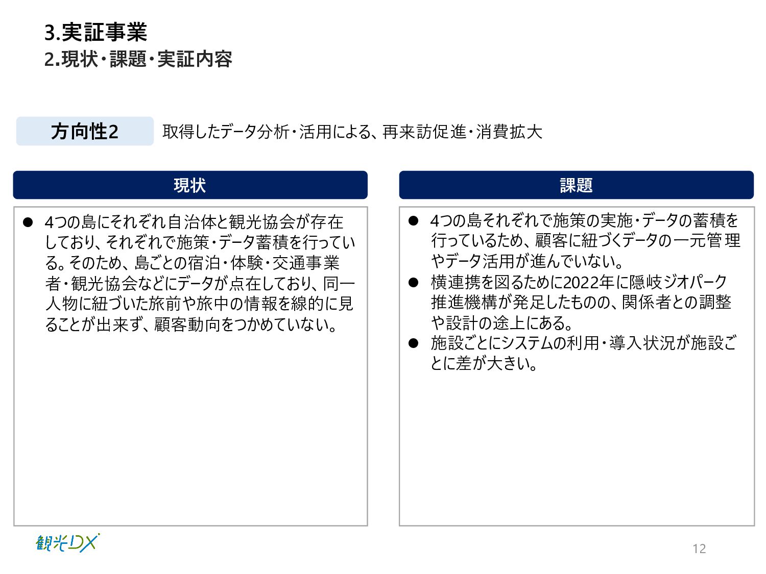 ⚫ 4つの島それぞれで施策の実施・データの蓄積を 行っているため、顧客に紐づくデータの一元管理 やデータ活用が進んでいない。 ⚫ 横連携を図るために2022年に隠岐ジオパーク 推進機構が発足したものの、関係者との調整 や設計の途上にある。 ⚫ 施設ごとにシステムの利用・導入状況が施設ご とに差が大きい。 3.実証事業 2.現状・課題・実証内容 方向性2 取得したデータ分析・活用による、再来訪促進・消費拡大